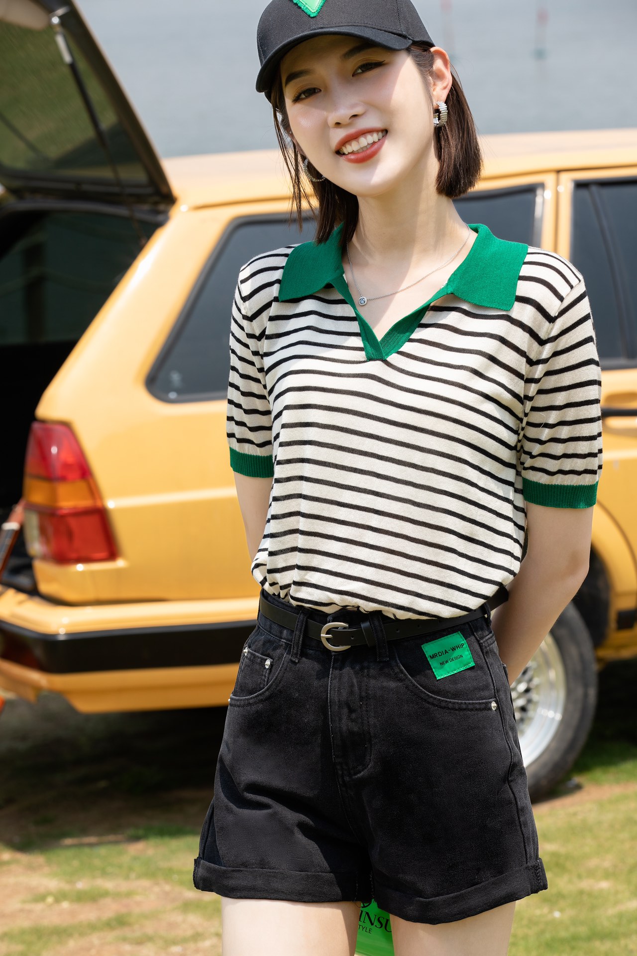 07020 #夏季新款 韩版百搭显瘦条纹POLO领短袖T恤 兰精天丝,最舒适、最透气, 最凉爽的一个面料,天丝的极品 码数:均码