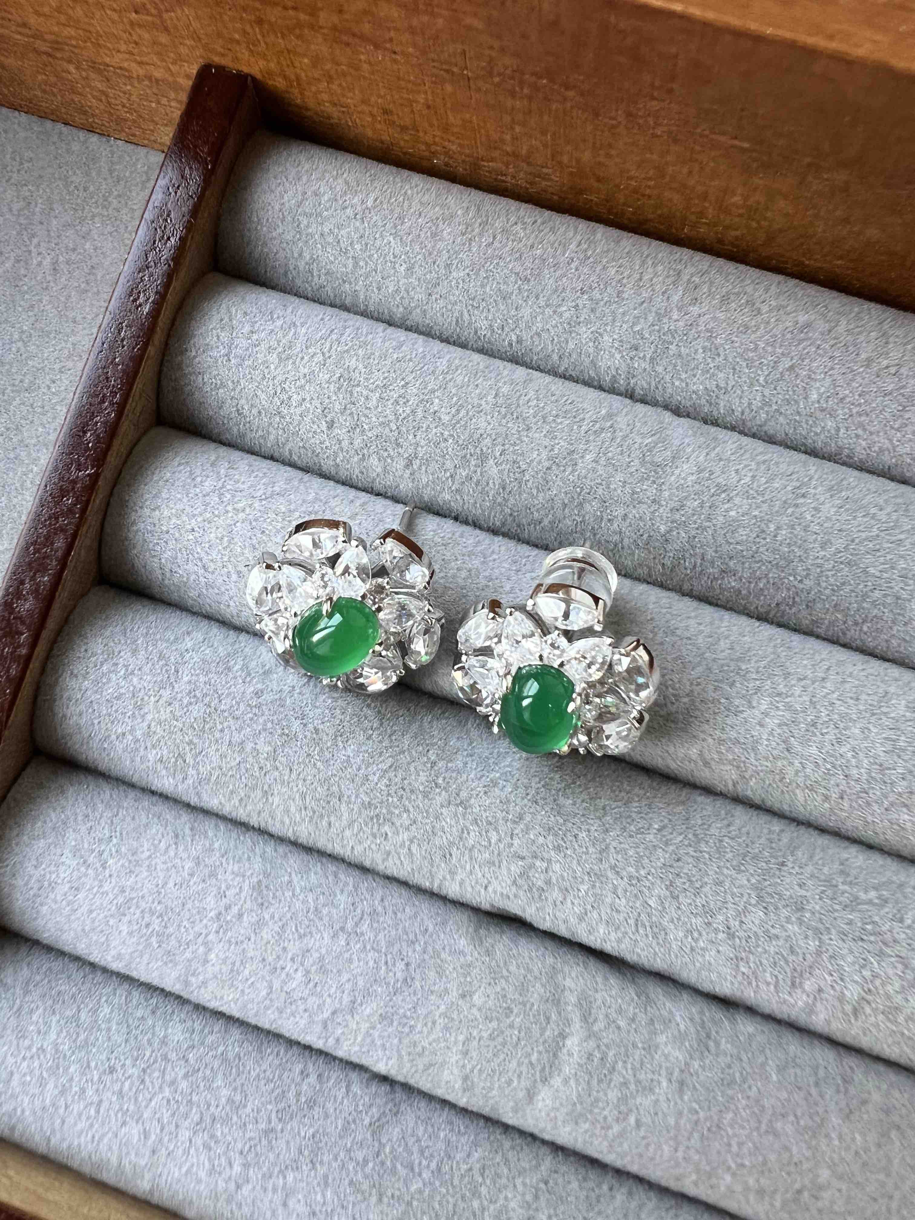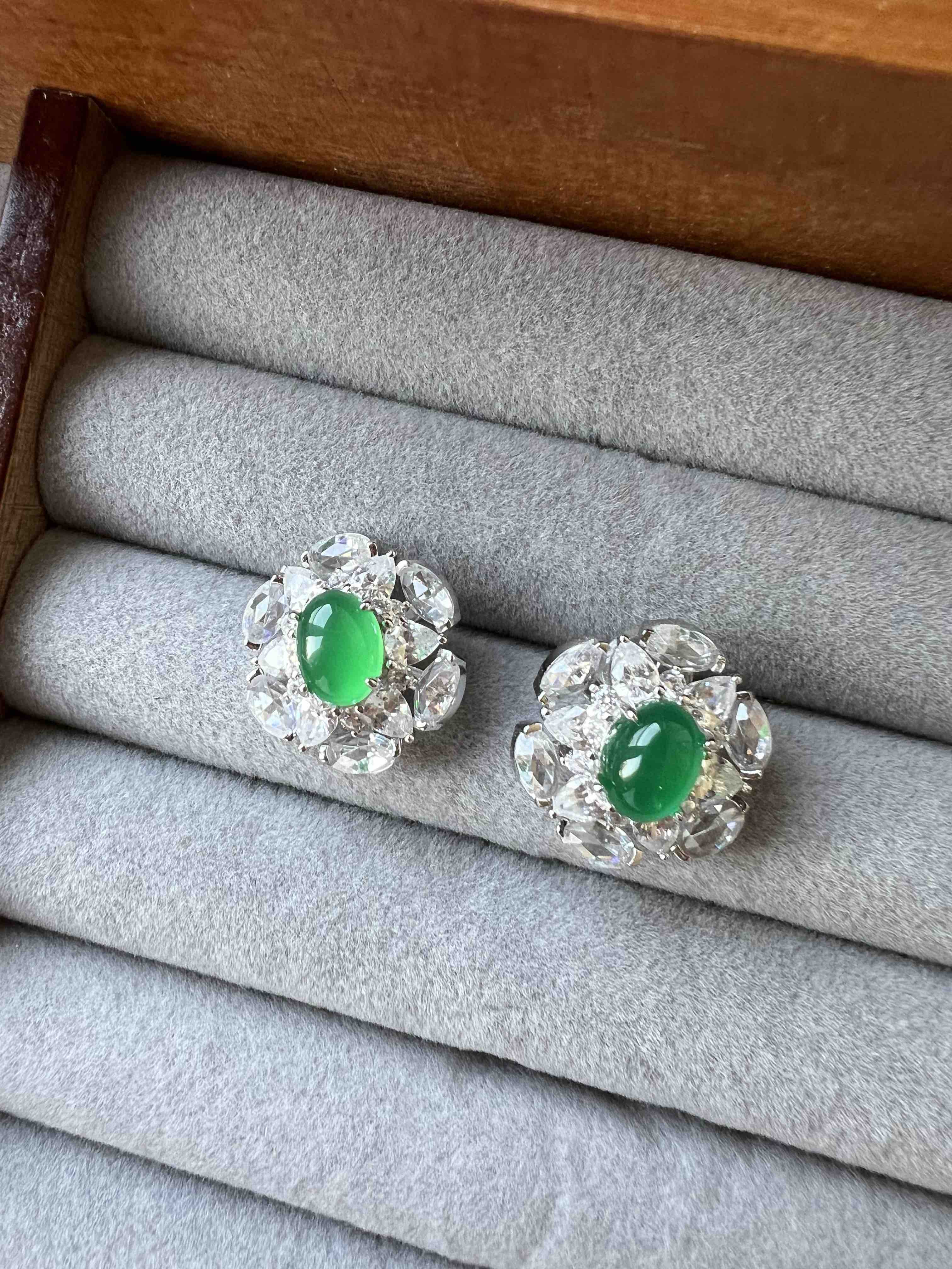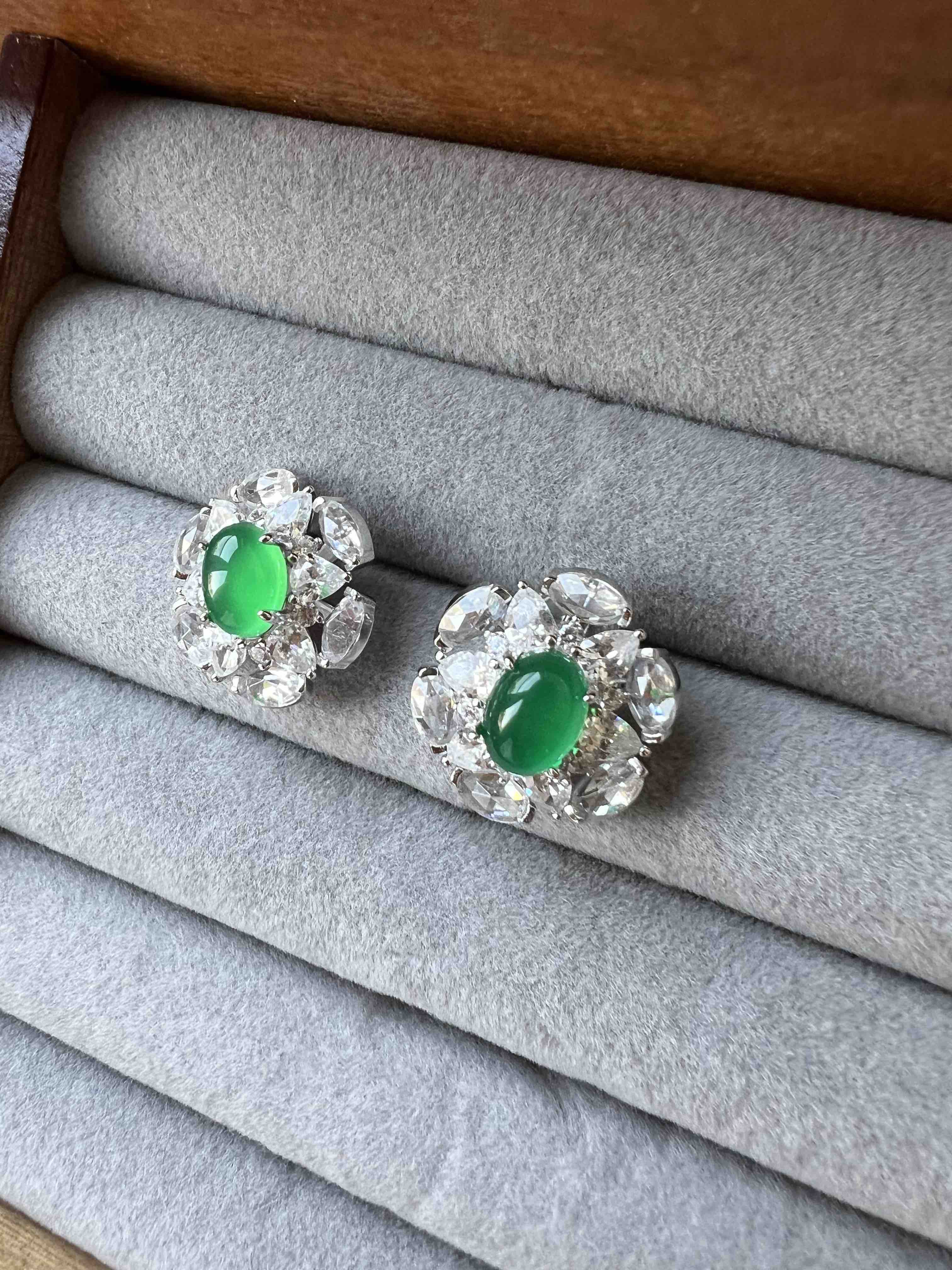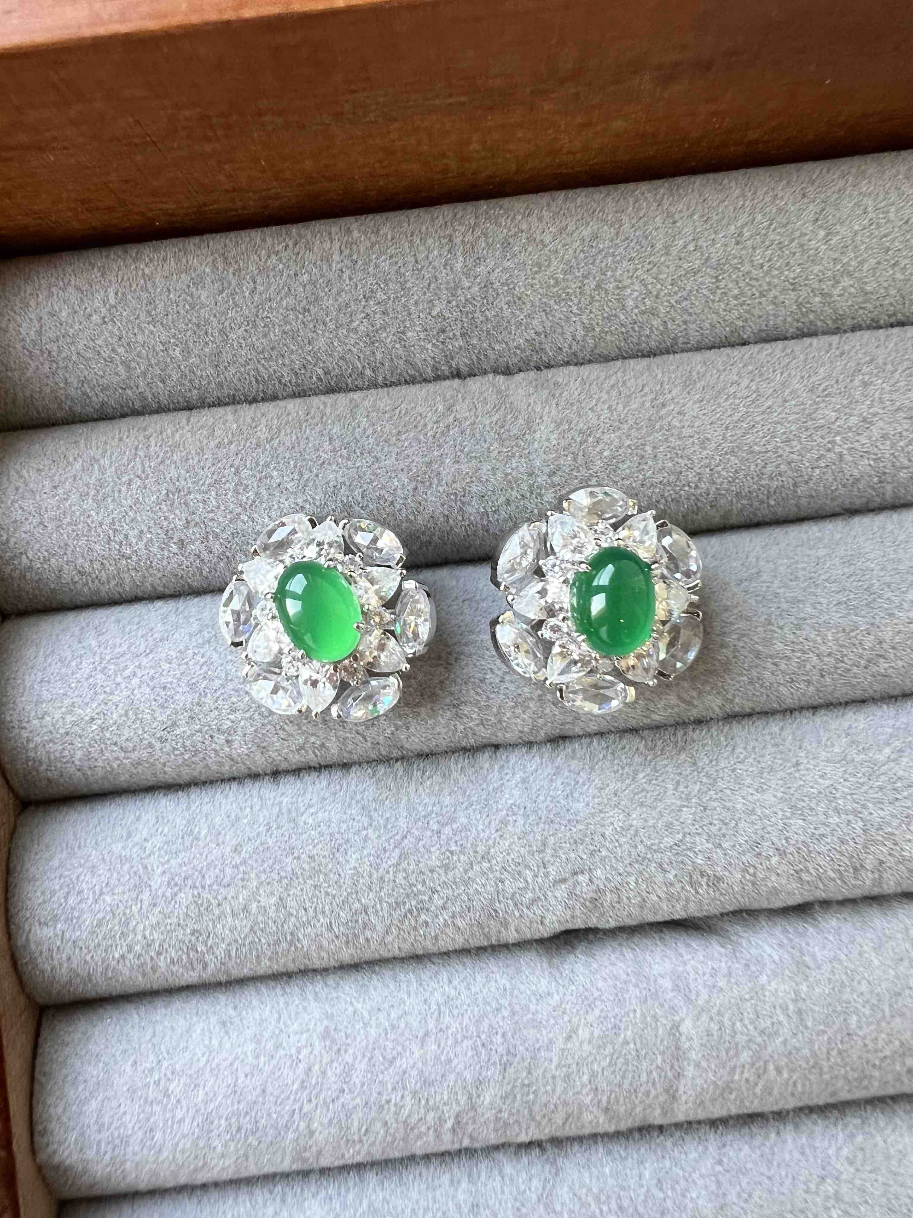 烟花易冷,绿玉髓烟花耳钉不会冷,你们看过视频的,这个底托要分件一点点打磨,即便是如此小蛋面,也是一个个挑选,三分之二不能用,分件+全手镶,天花板级别的绿玉髓用料,这一点而言是有点难度在的