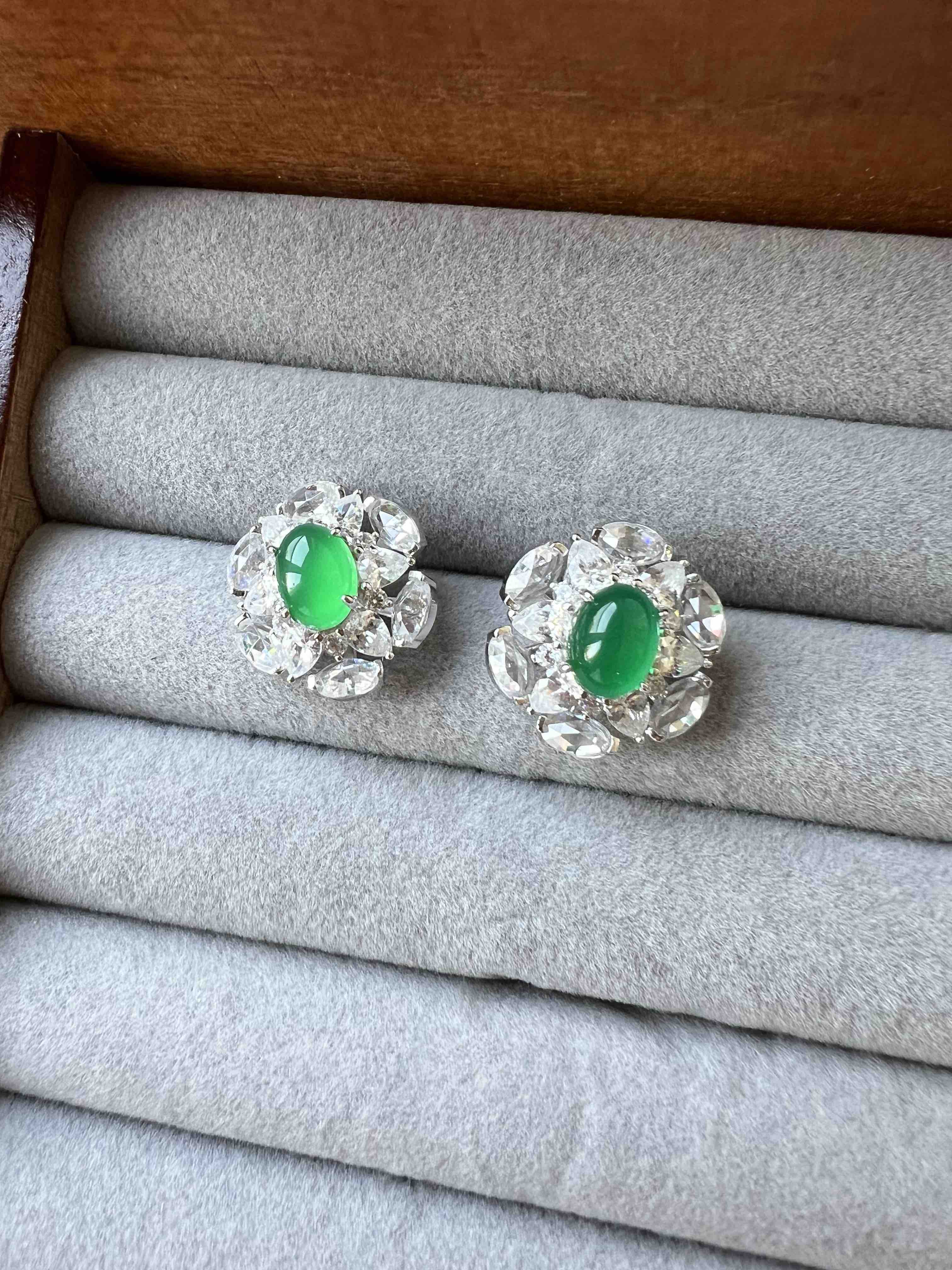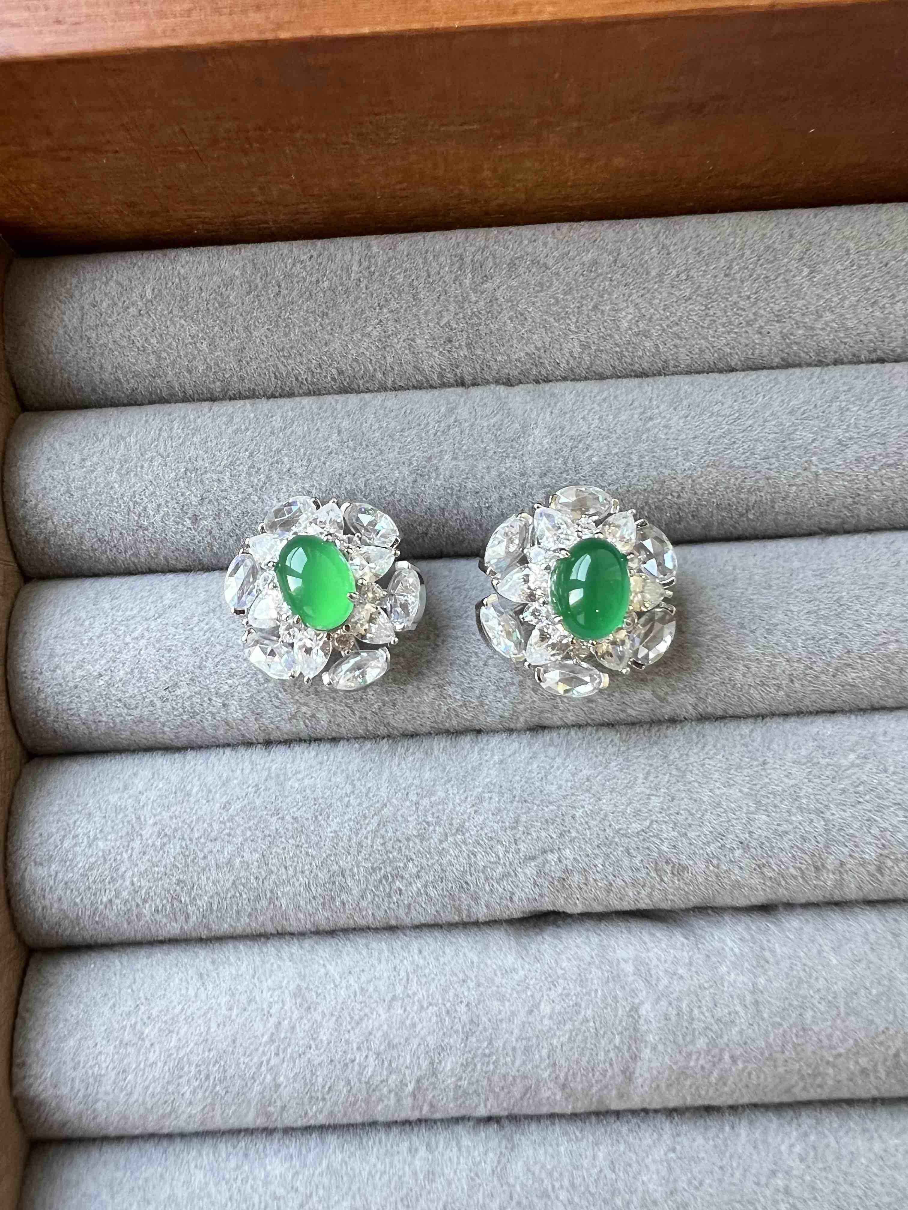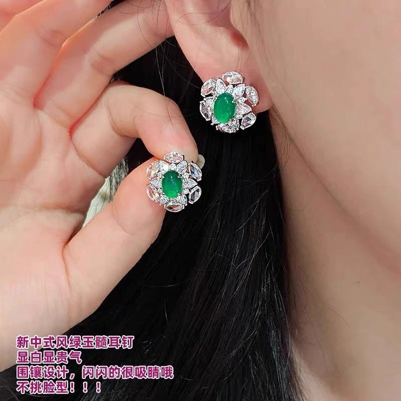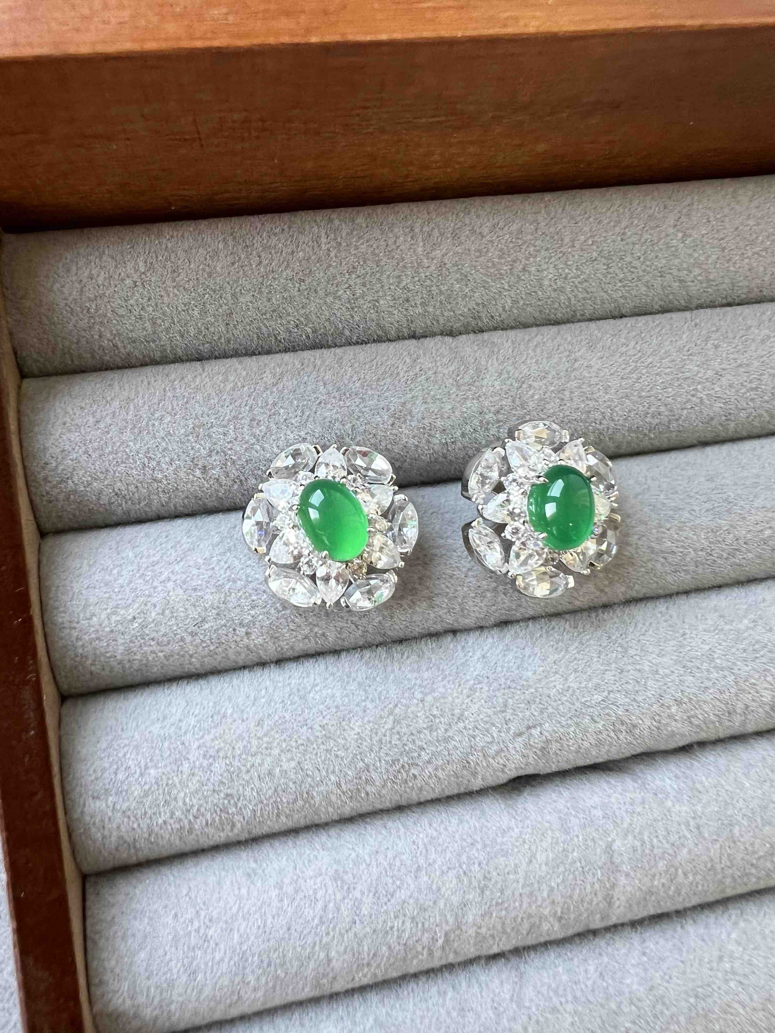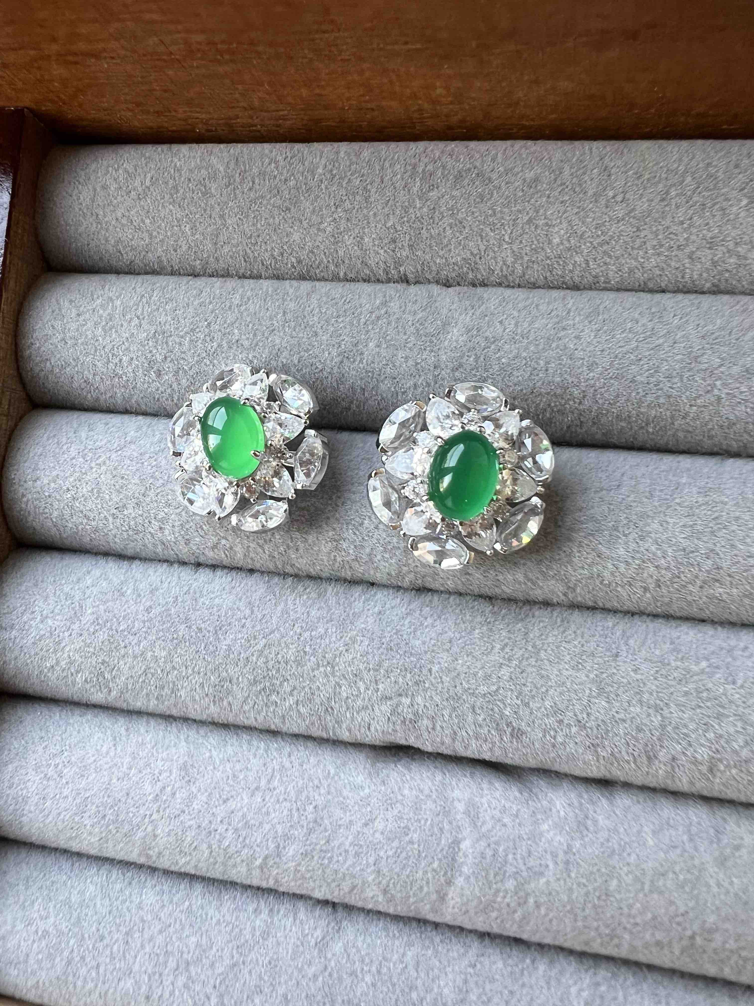烟花易冷,绿玉髓烟花耳钉不会冷,你们看过视频的,这个底托要分件一点点打磨,即便是如此小蛋面,也是一个个挑选,三分之二不能用,分件+全手镶,天花板级别的绿玉髓用料,这一点而言是有点难度在的