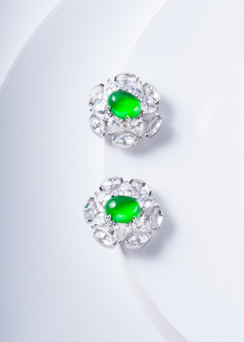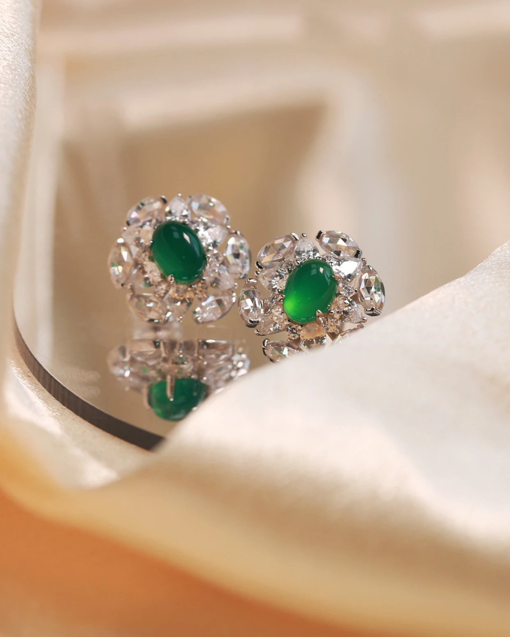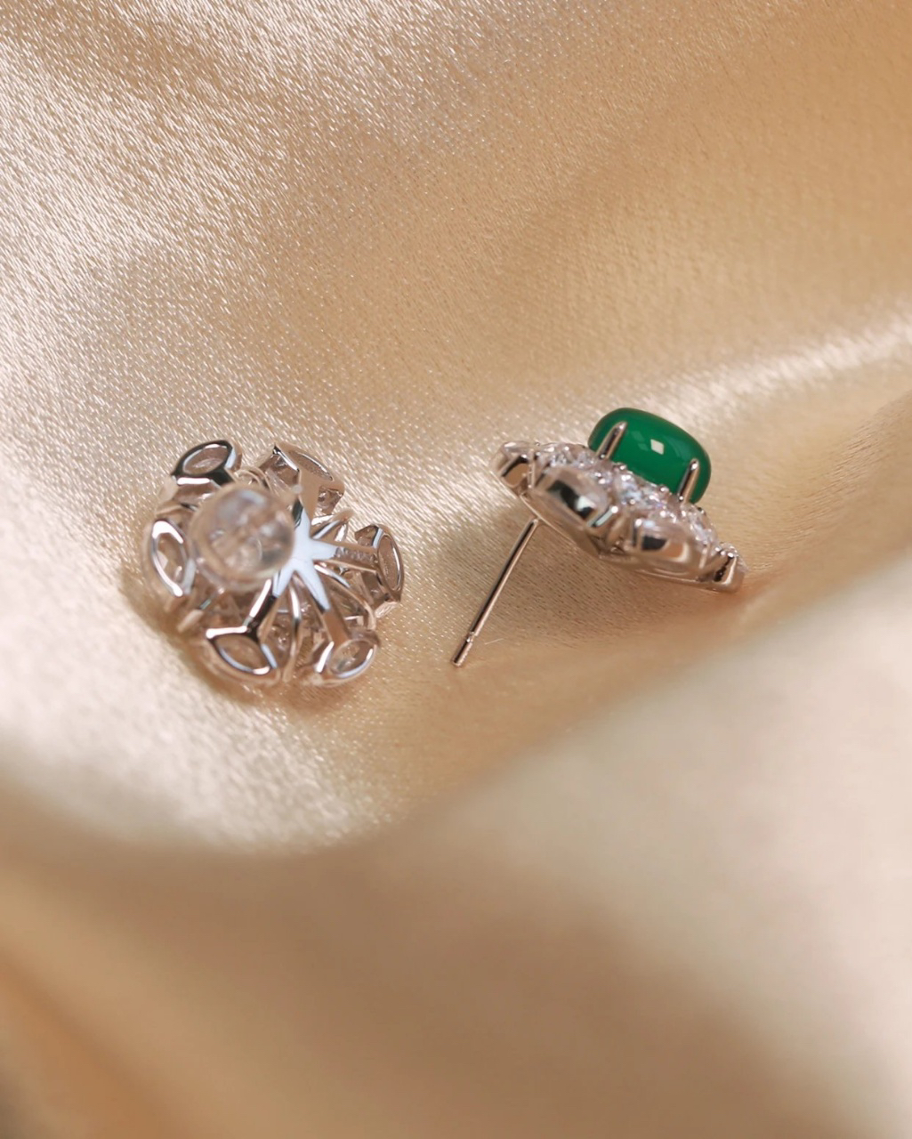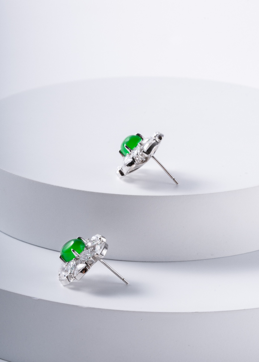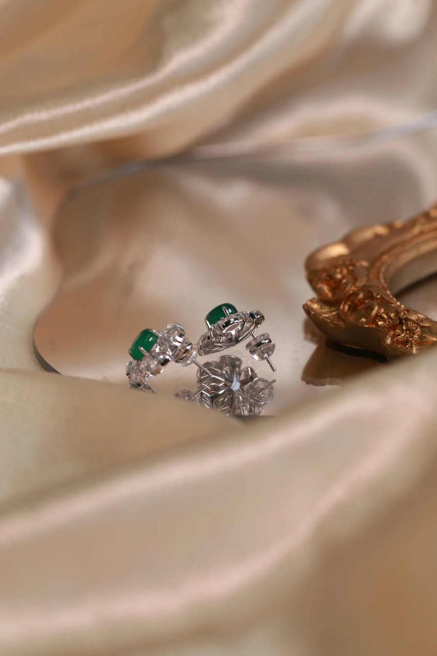 烟花易冷,绿玉髓烟花耳钉不会冷,你们看过视频的,这个底托要分件一点点打磨,即便是如此小蛋面,也是一个个挑选,三分之二不能用,分件+全手镶,天花板级别的绿玉髓用料,这一点而言是有点难度在的
