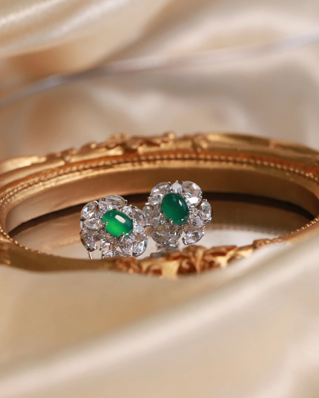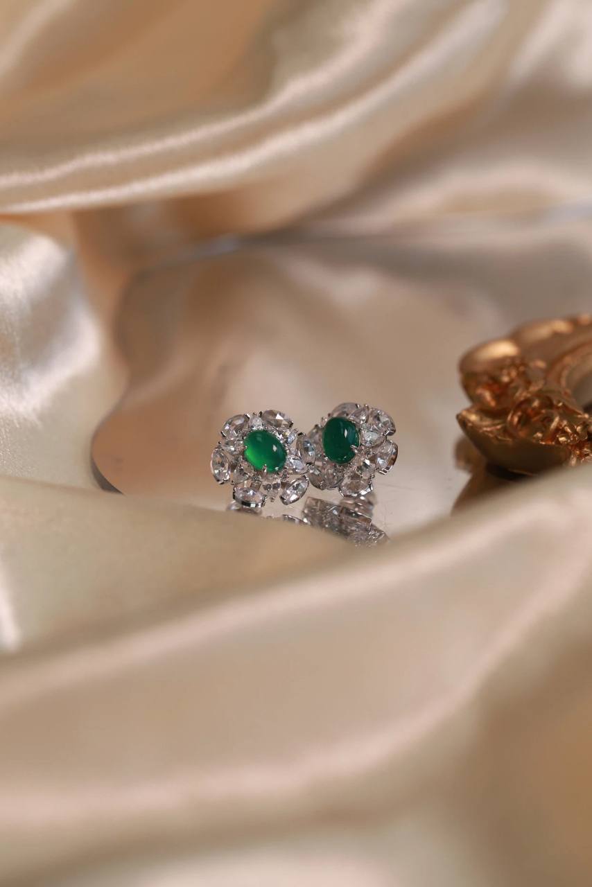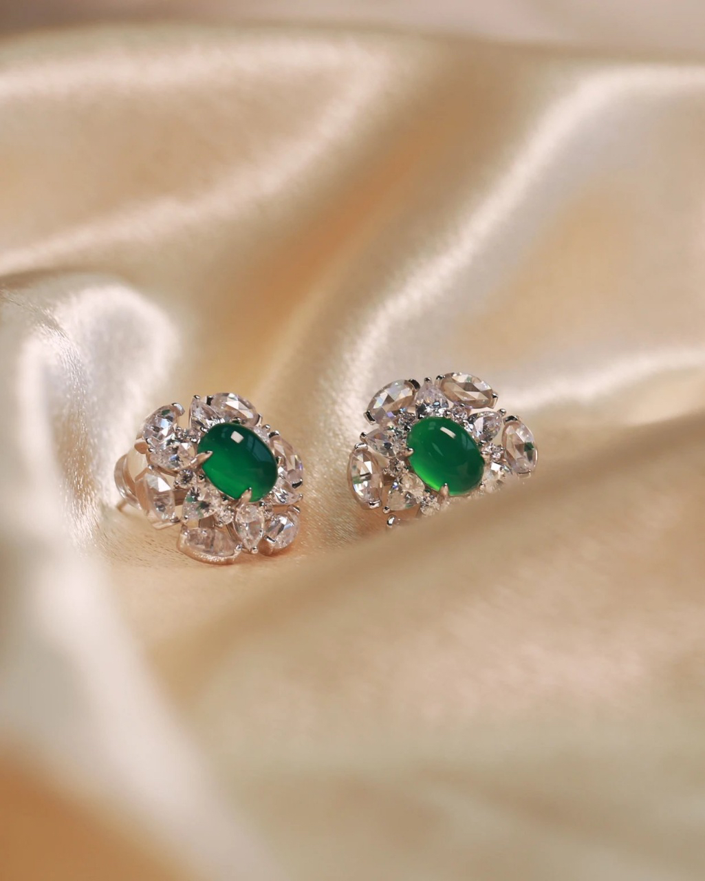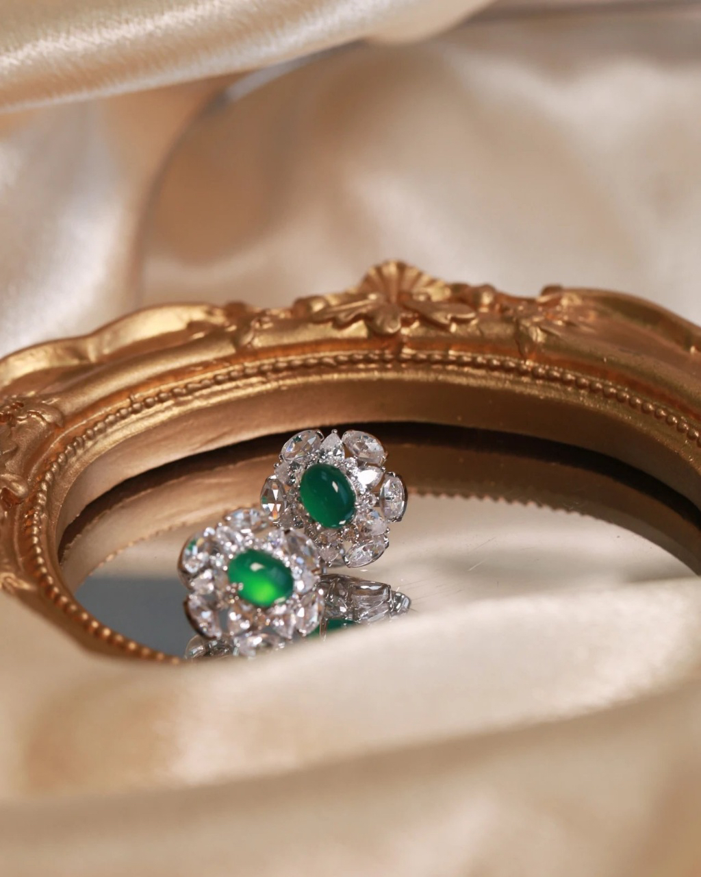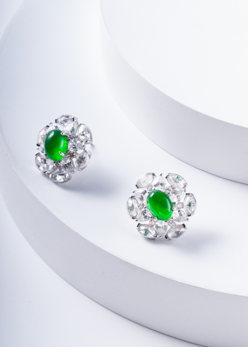 烟花易冷,绿玉髓烟花耳钉不会冷,你们看过视频的,这个底托要分件一点点打磨,即便是如此小蛋面,也是一个个挑选,三分之二不能用,分件+全手镶,天花板级别的绿玉髓用料,这一点而言是有点难度在的