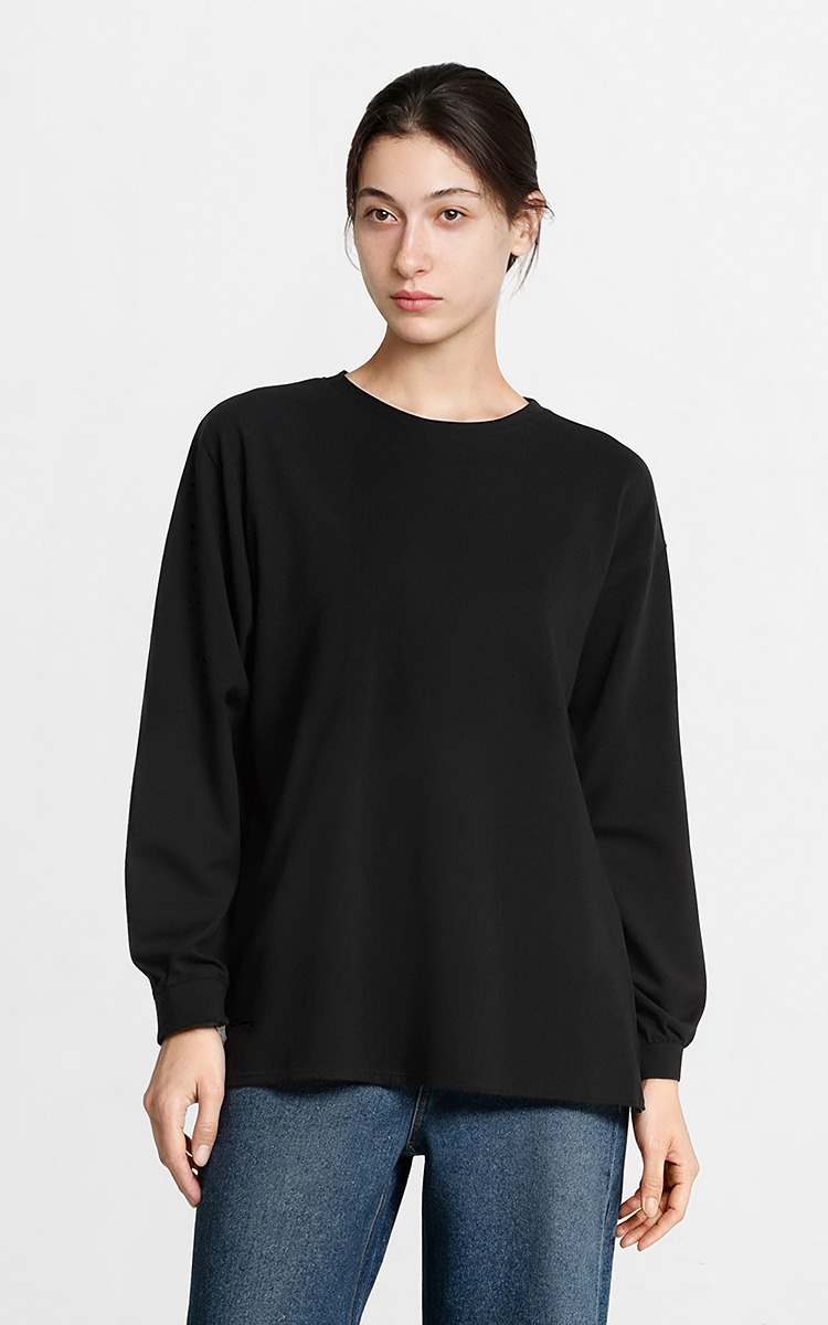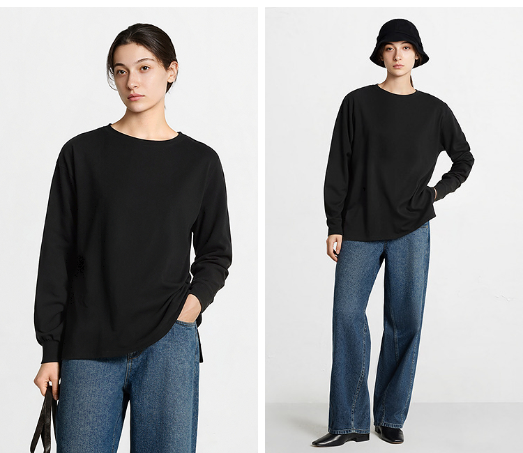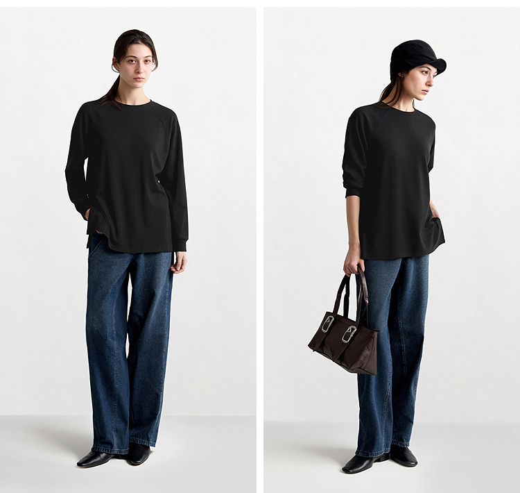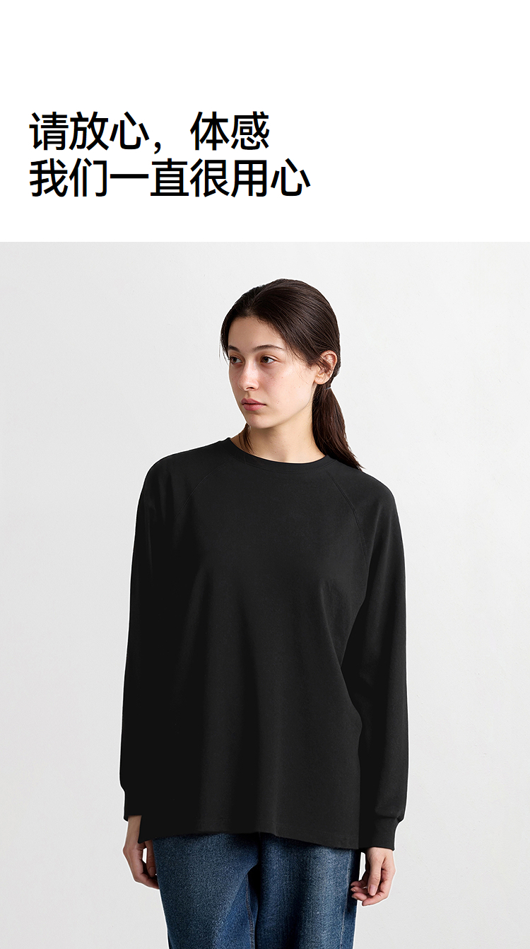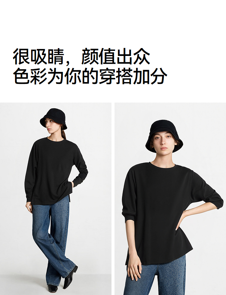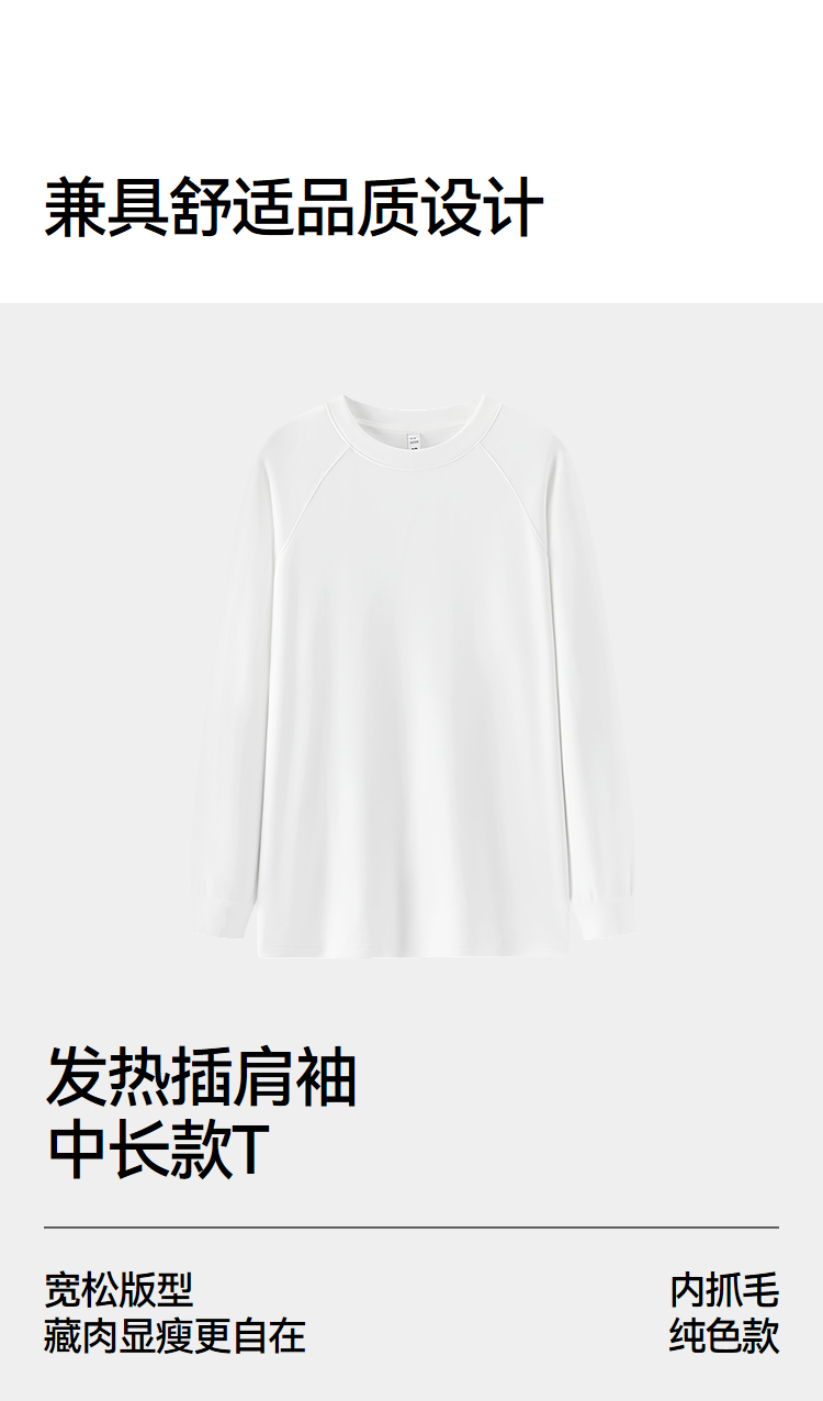 森马长袖T恤女中长款宽松发热纯色插肩袖2025冬新款抓毛开叉上衣