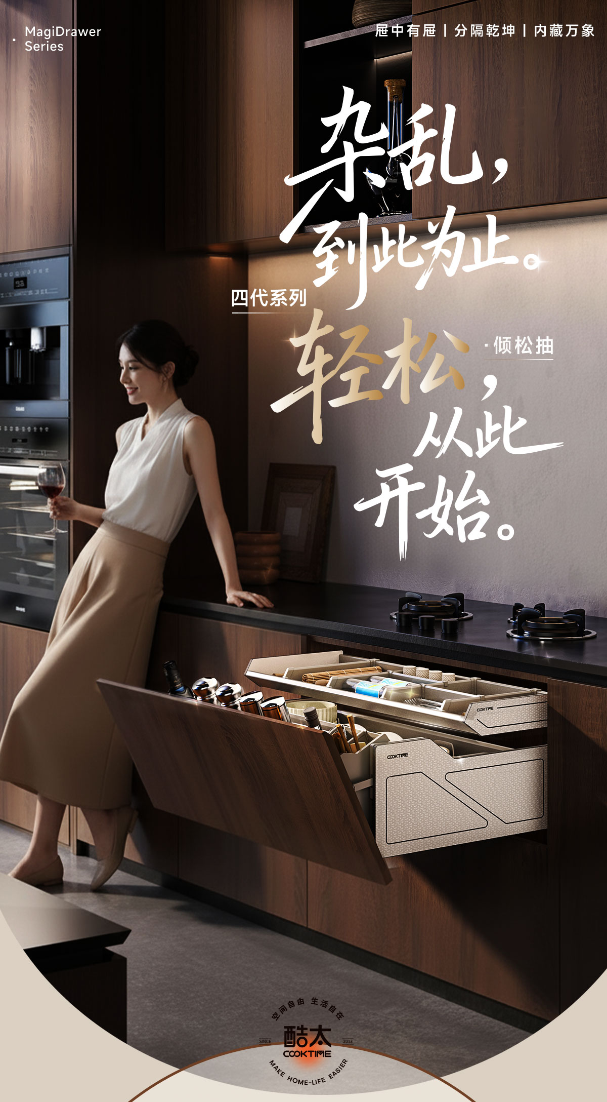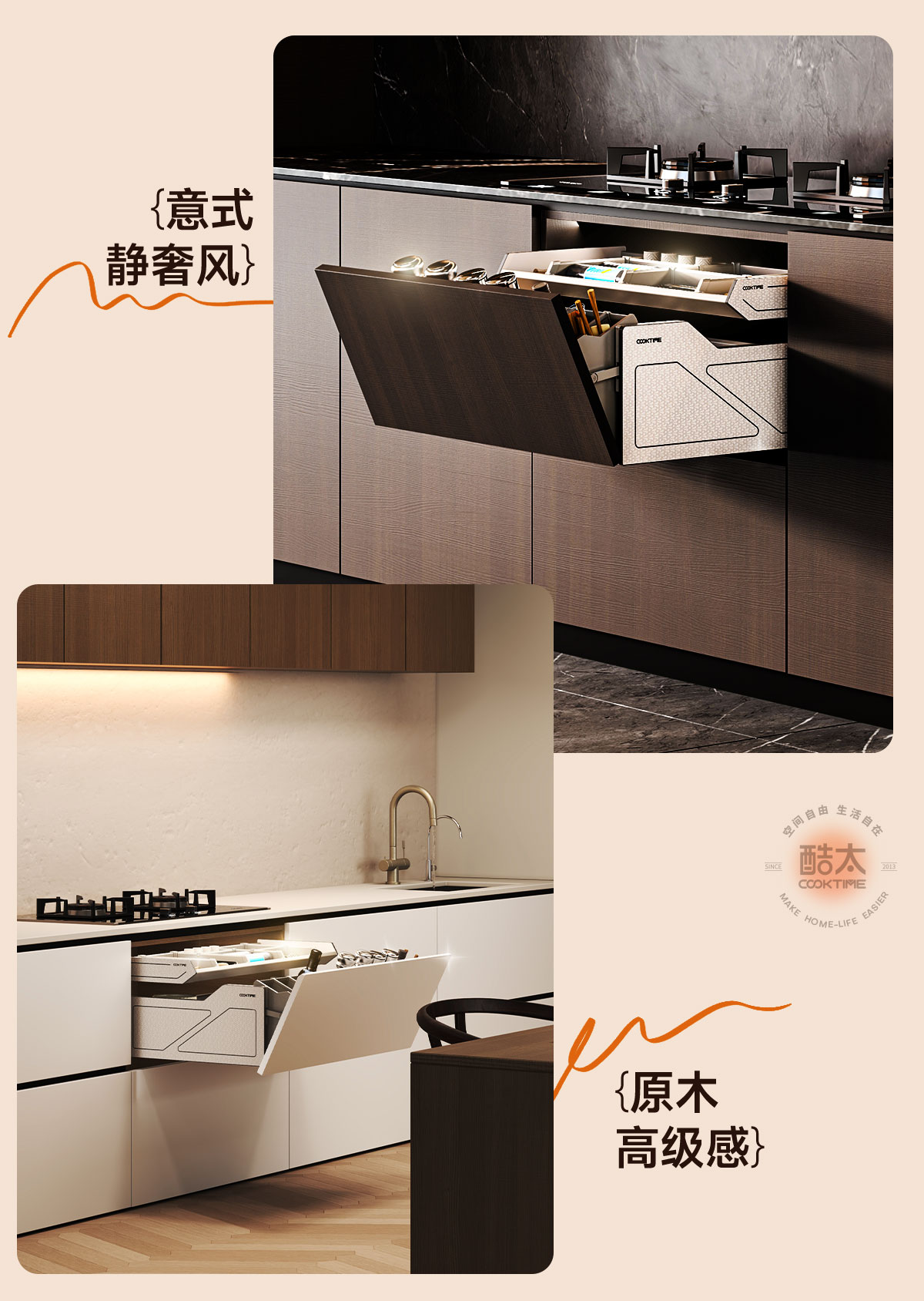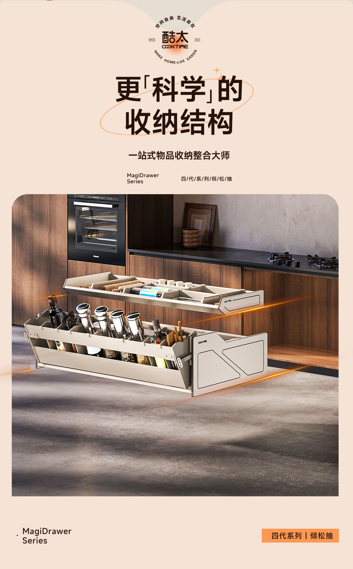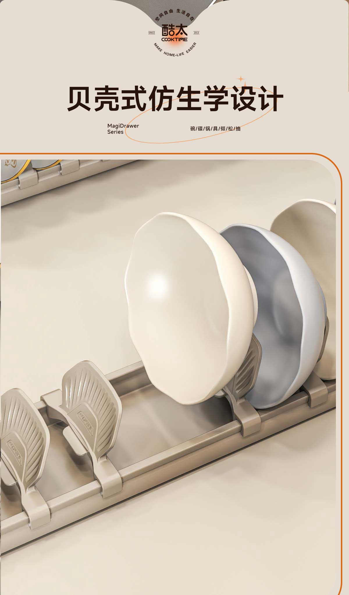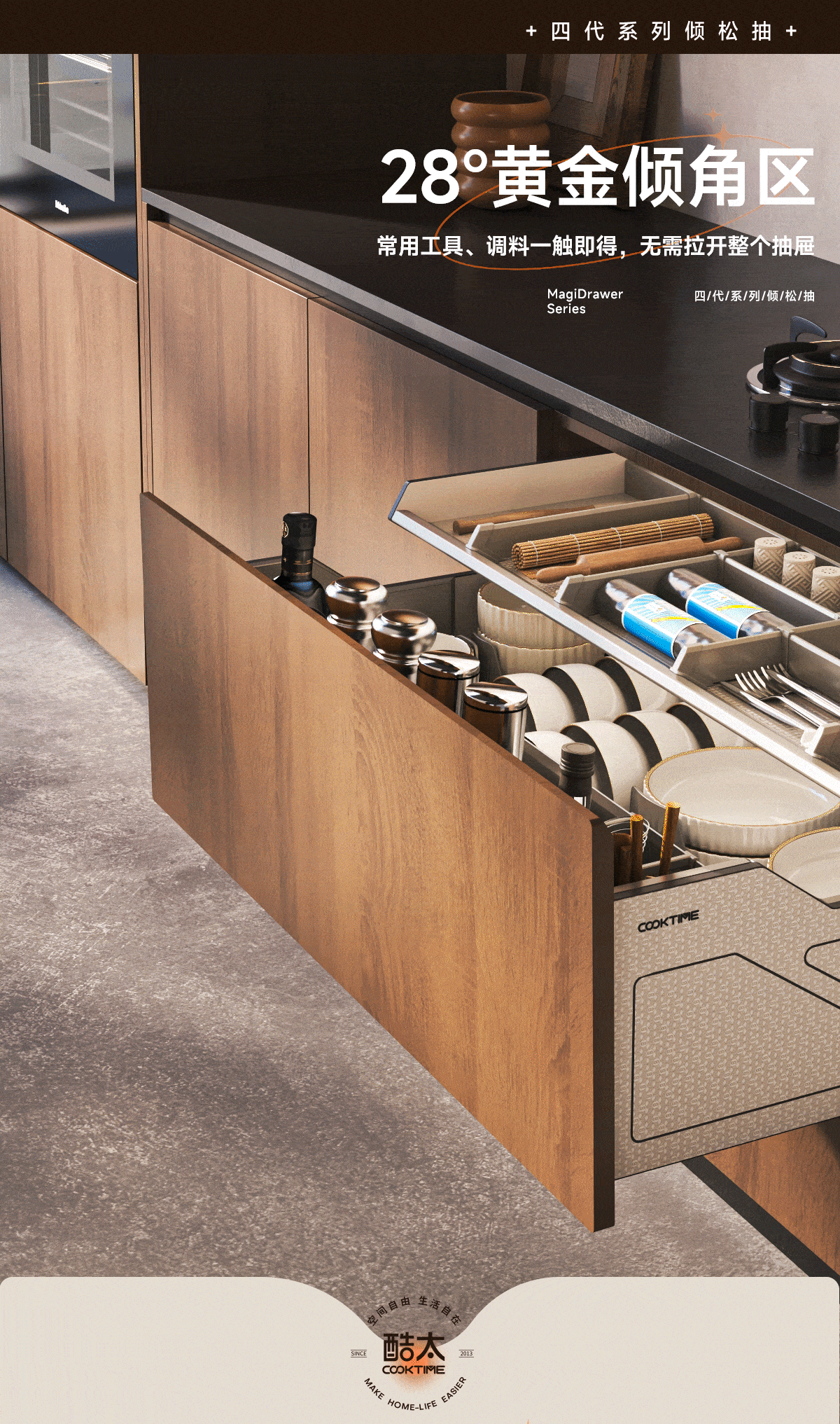 - 酷太坚持8年自主研发,已获得专利证书130项,拥有一套领先市场的厨房收纳系统,为千万中国家庭解决厨房脏乱差,缔造厨房新生活。