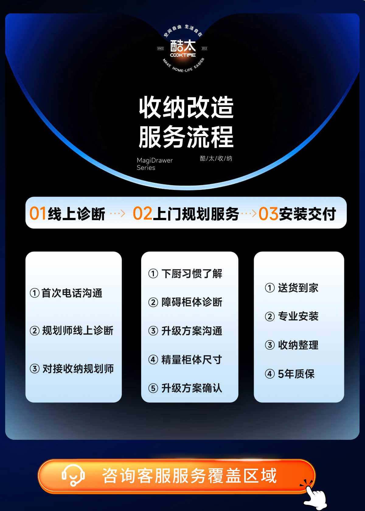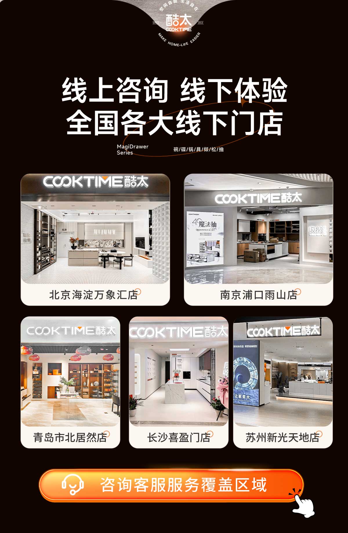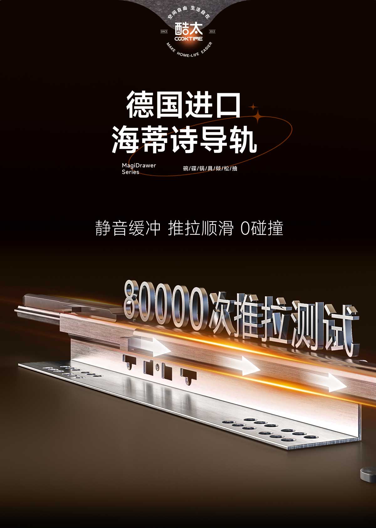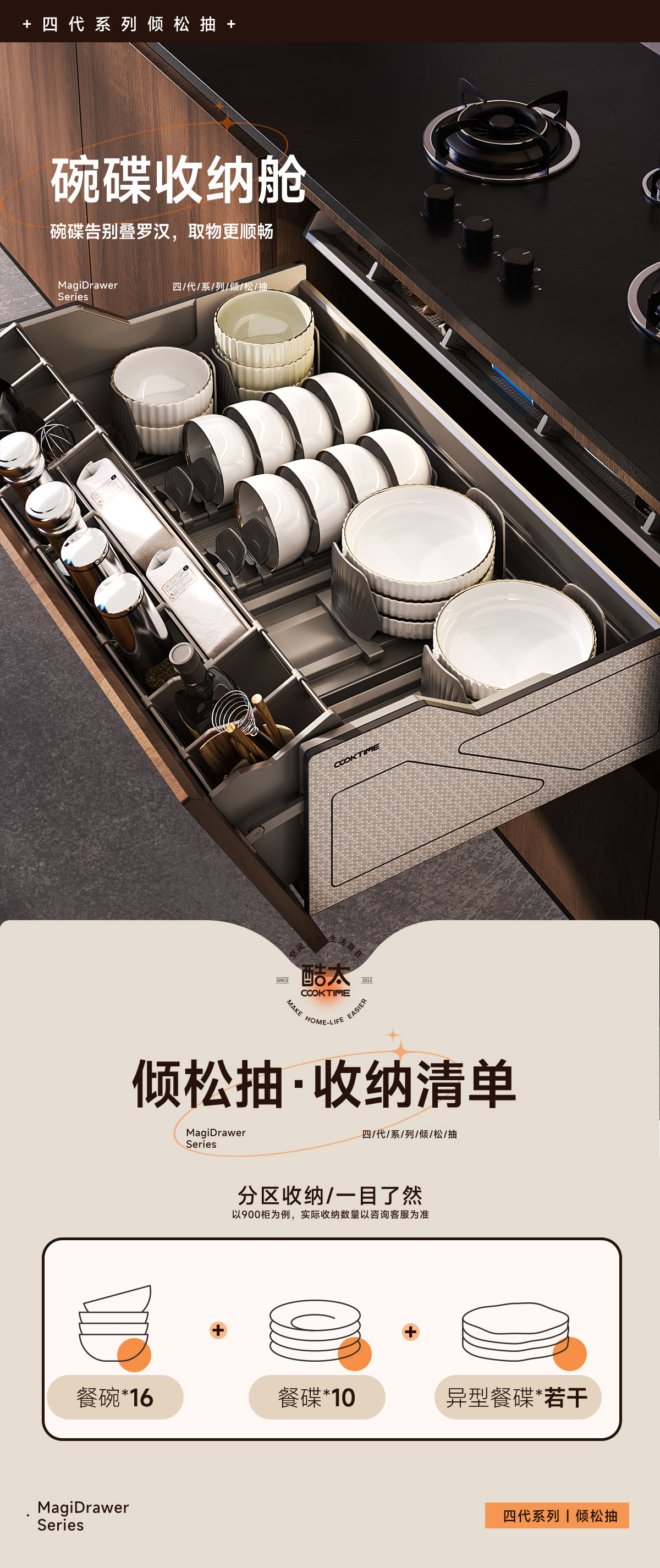 - 酷太坚持8年自主研发,已获得专利证书130项,拥有一套领先市场的厨房收纳系统,为千万中国家庭解决厨房脏乱差,缔造厨房新生活。