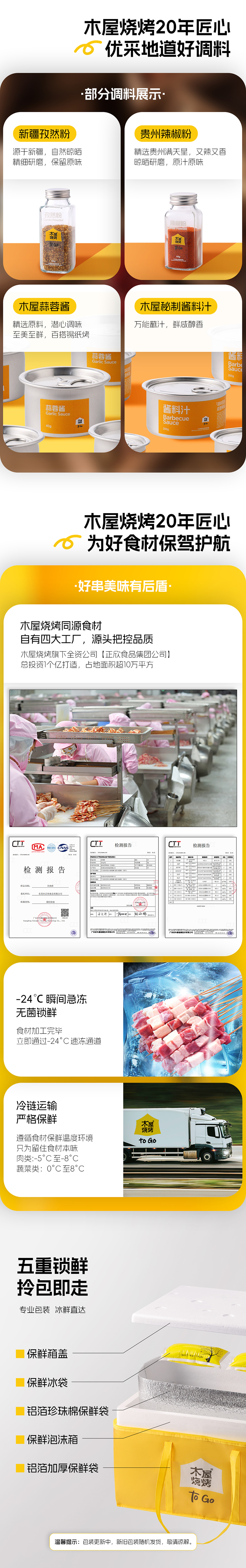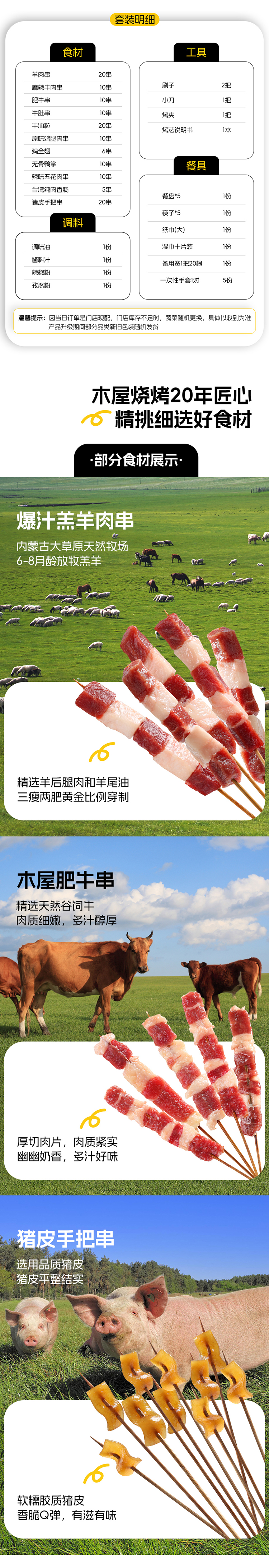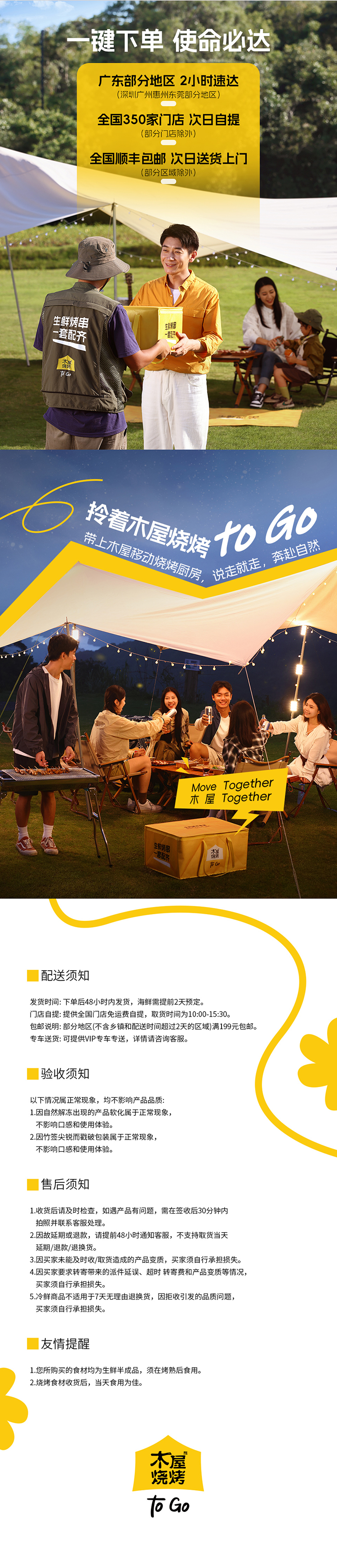 - 木屋烧烤半成品套装,一键下单,使命必达。 -全国300家门店支持次日到店自提 -全国顺丰包邮,当日下单,次日顺丰送货上门(部分区域除外,实际以顺丰时效为准)