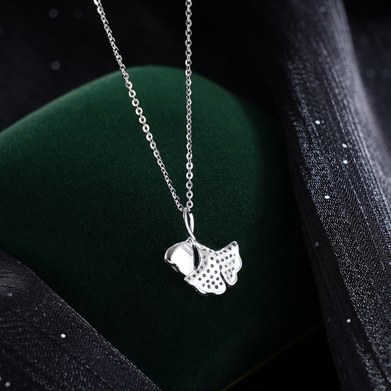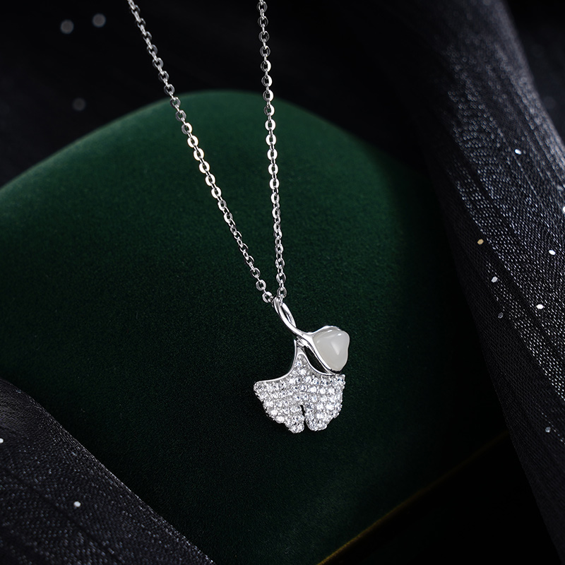 【寓意】:项链设计灵感源自银杏。银杏叶一分为二,一半镶嵌锆石, 一半镶和田玉。 材质交融,对比鲜明。寓意吉祥永驻。