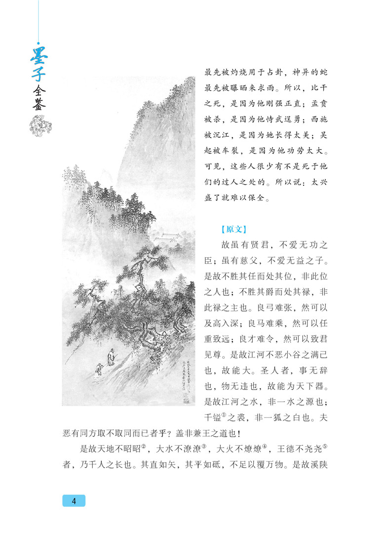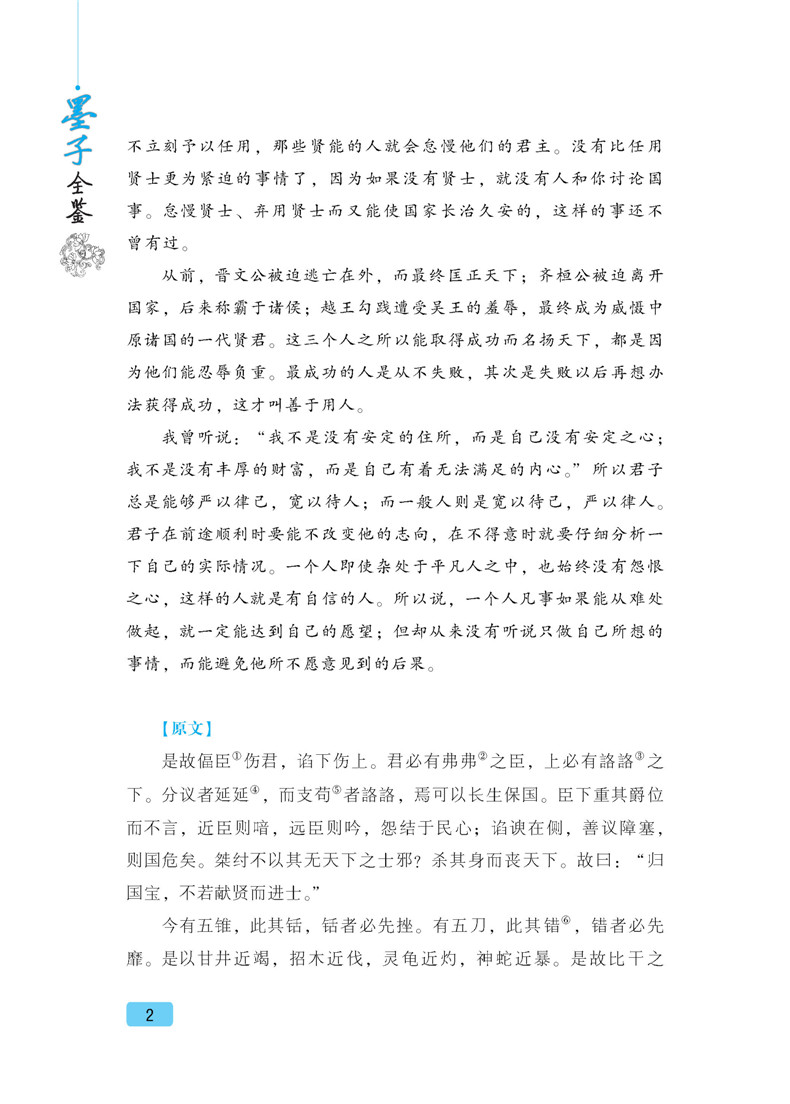 《墨子》就是记载墨翟言论和墨家学派思想资料的总集,全书倡导尚贤、尚同、兼爱、非攻、节用、节葬等主张,基本反映了广大劳动阶层的呼声。《墨子》一书思想非常丰富,其中政治思想、伦理思想、哲学思想、逻辑思想和军事思想都比较突出,尤其是它的逻辑思想,是先秦逻辑思想史的奠基作。书中的许多思想与观点在当今社会仍有积极的意义,值得我们去借鉴与学习。《墨子全鉴》是在总结前人研究成果的基础上,再次加以精校精注精解,内容包括原文、注释、译文、解析五部分。