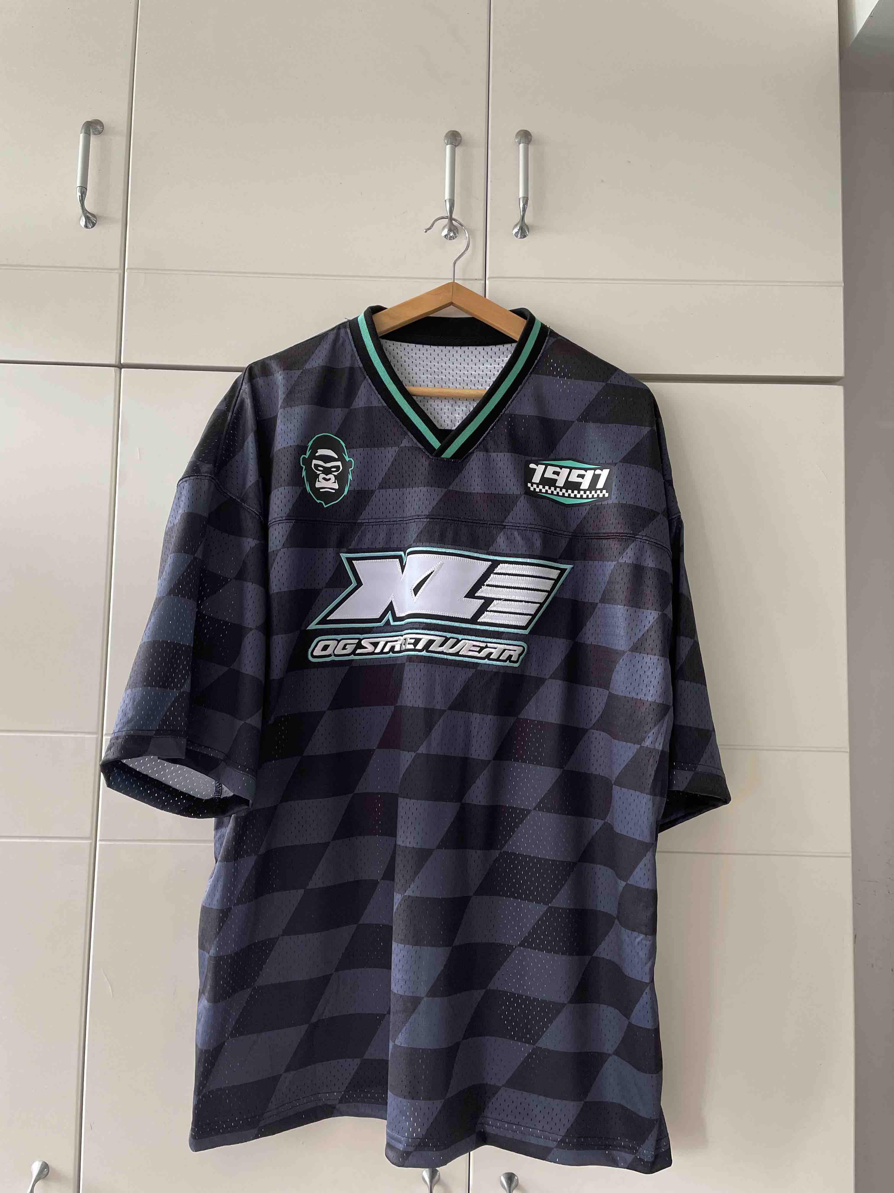 官方还没上。看类似款,是叫football shirt。旗舰店大概600多块钱。因为是美国品牌,世界上只有美国把橄榄球叫football,把足球叫soccer。所以,这应该是个橄榄球t恤。国内旗舰店也没研究这个,就叫宽松针织T恤,但是咱得把来龙去脉说清楚了。橄榄球加了很多时尚元素,oversize,菱格,大面积刺绣,标志猿人头,整体就很街头,很美式,很阳刚,很帅!!!在美国高校,橄榄球校队中锋,一定是校草,兄弟会成员,美国总统感觉有一半大学是橄榄球校队的。。。就这么帅!