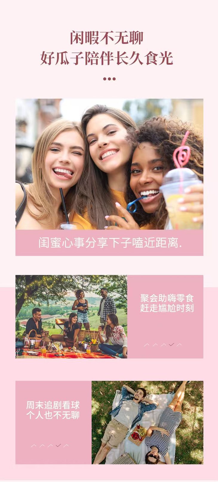 🔻追剧/看电影时:沙发上放几包,剧情精彩时嗑一颗,紧张刺激时嗑一颗,嘴巴不闲着,快乐加倍🎉 🔻朋友聚会时:把瓜子倒在盘子里,大家边吃边聊,气氛瞬间活跃起来,再也不用担心冷场了🙅 🔻出门旅行/野餐时:小包装方便携带,放在包里不占地方,在景区休息或者野餐的时候拿出来,边欣赏风景边嗑瓜子,惬意又自在😌 🔻回老家看爸妈时:带几包回去,爸妈坐在院子里晒太阳,边嗑瓜子边聊天,满满的幸福感,这才是回家的感觉🏡