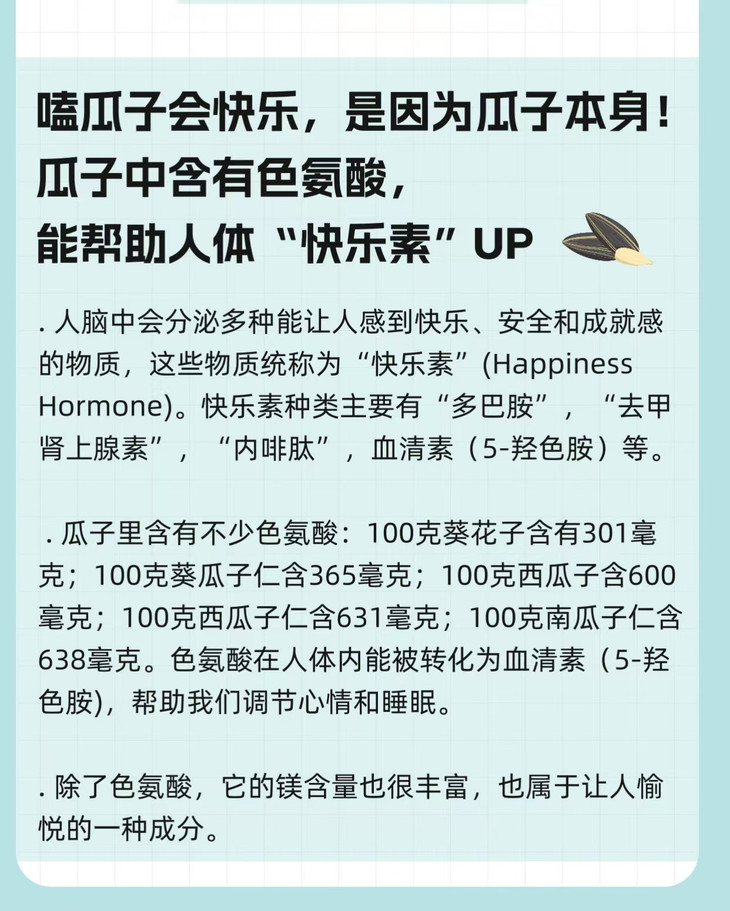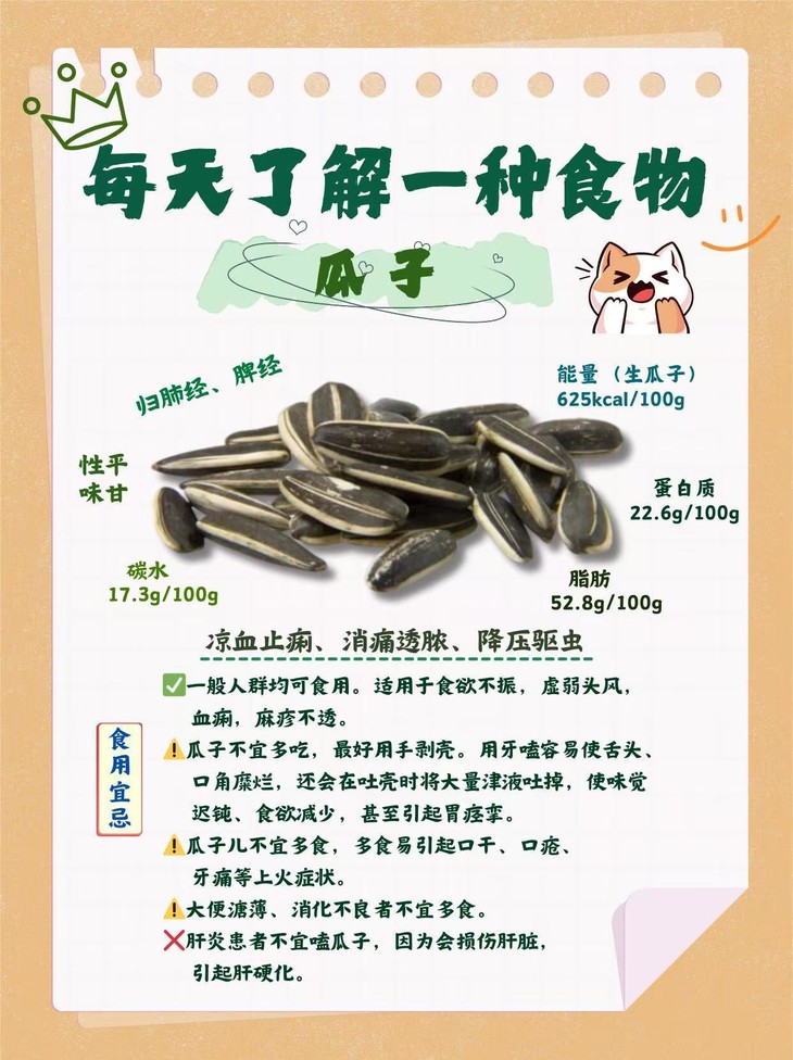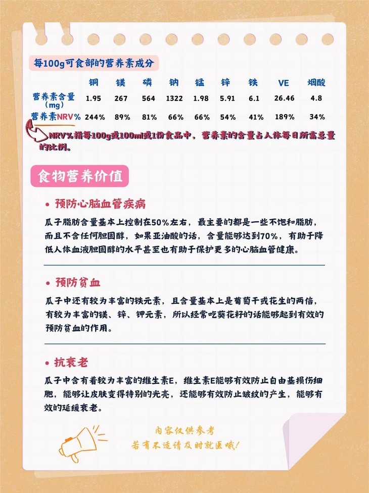 瓜子不只是好吃,营养也不少🥳 葵花籽本身就富含不饱和脂肪酸、维生素E、B族维生素 以及多种矿物质,比如钾、镁、铁等🔬 这些都是身体需要的营养成分 适量食用对身体有益💪