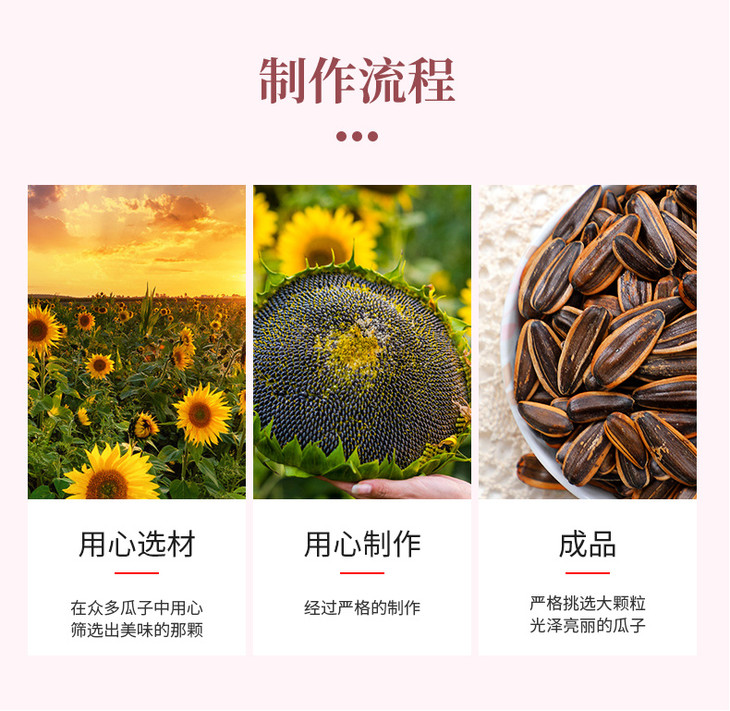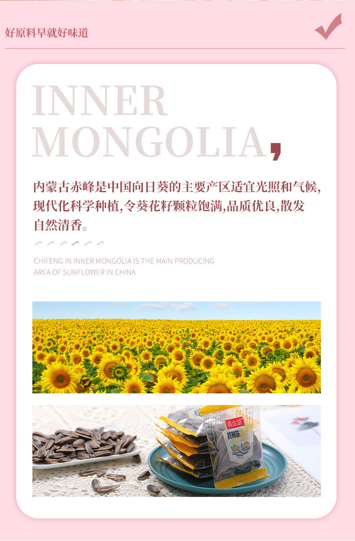 它的品质真的没话说👍 堪称瓜子中的上品! 原料都是来自黄金葵园的当季葵花籽🌻 内蒙古赤峰是中国向日葵的主要产区🌍 适宜的光照和气候☀️ 那里土地肥沃、日照充足、温度适宜🌡️ 是葵花籽生长的天堂 精选的大盘株,果盘直径超35cm 结出来的葵花籽少空壳坏籽❌ 颗粒饱满,自带阳光的味道☀️