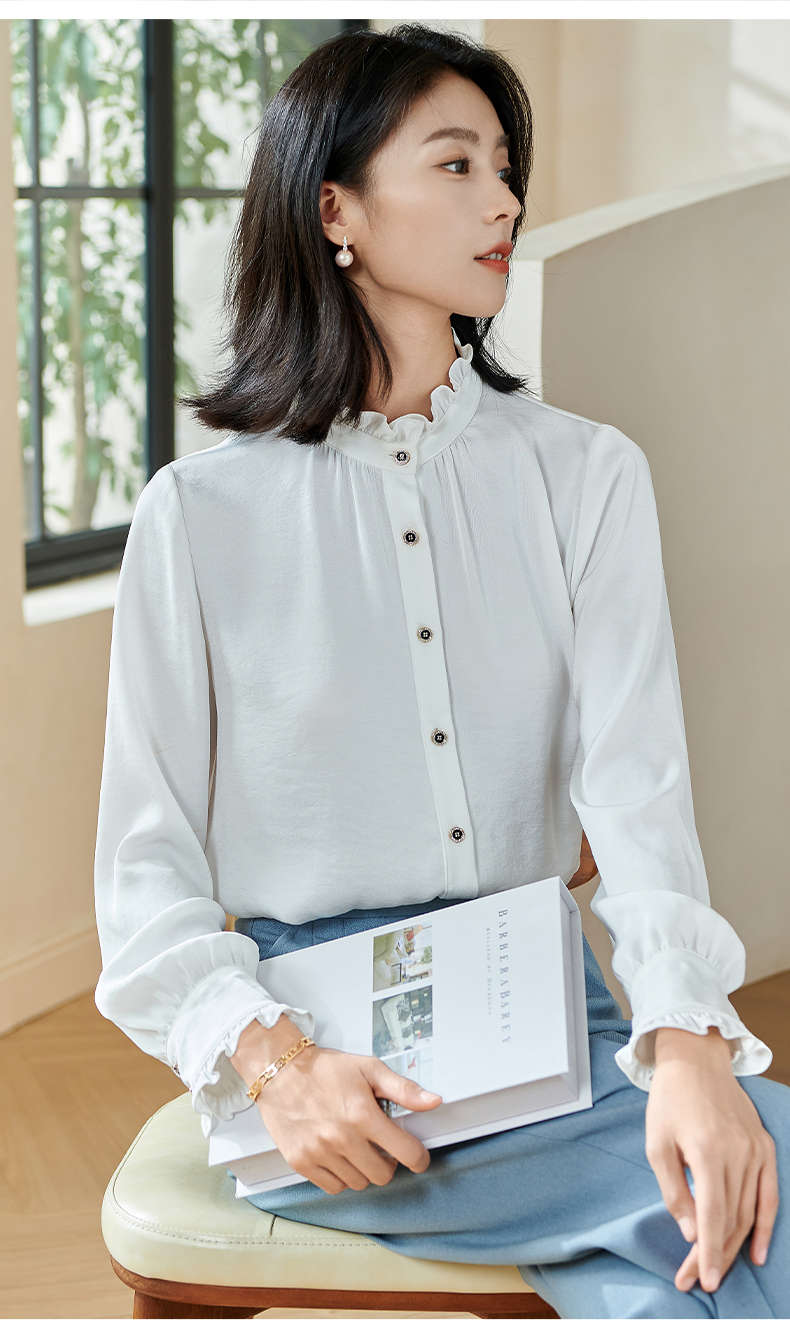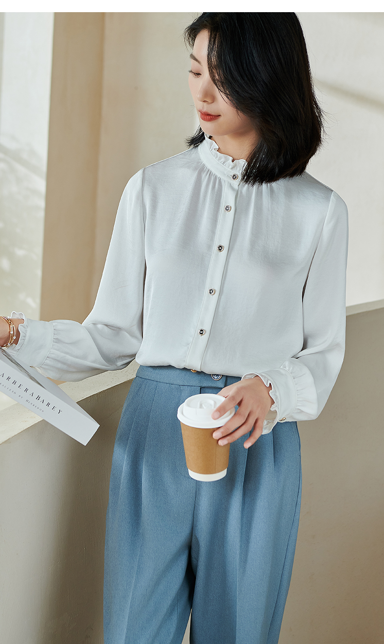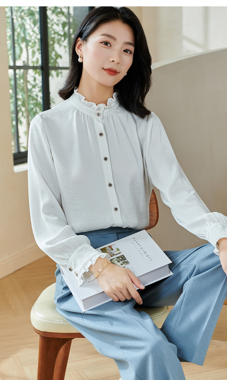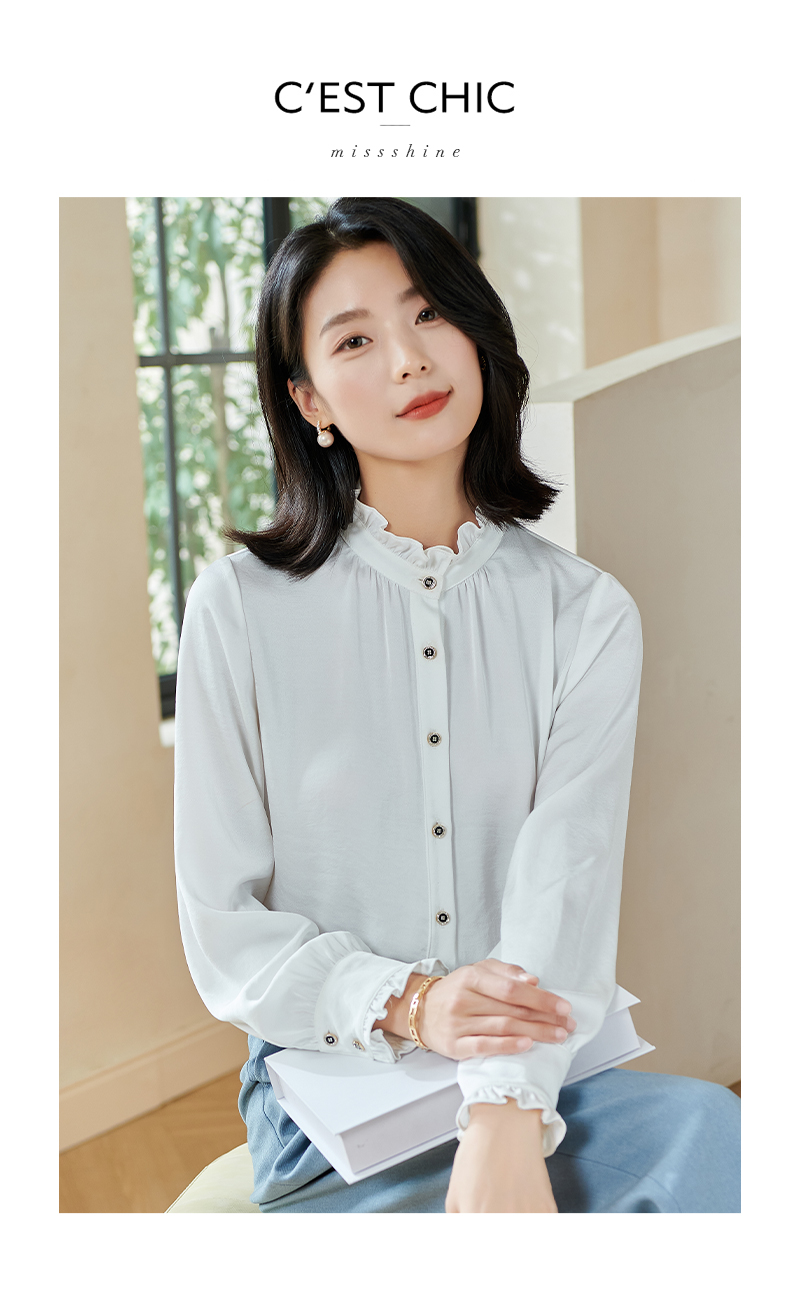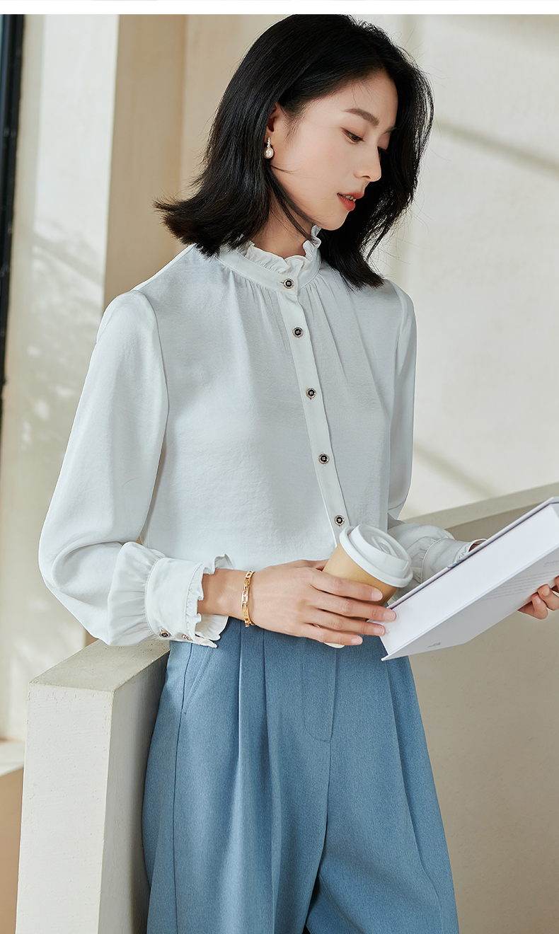 米思阳2026春季新款法式时尚纯色宽松衬衫荷叶领弹力开衫上衣0026