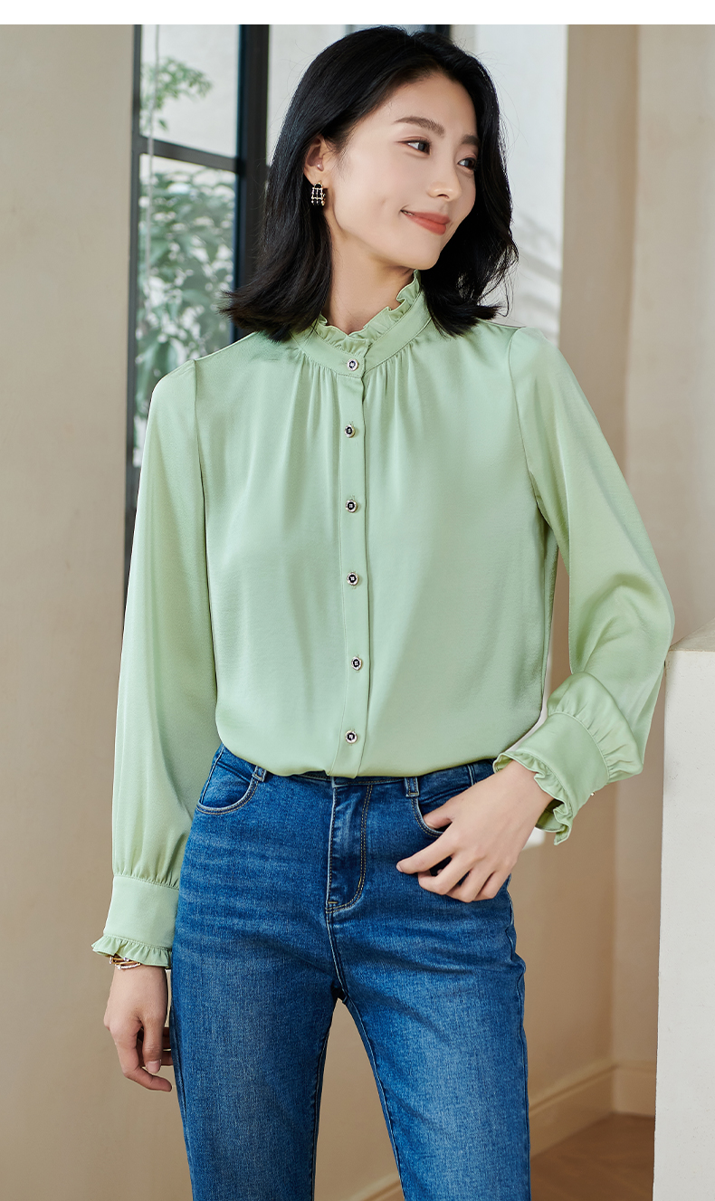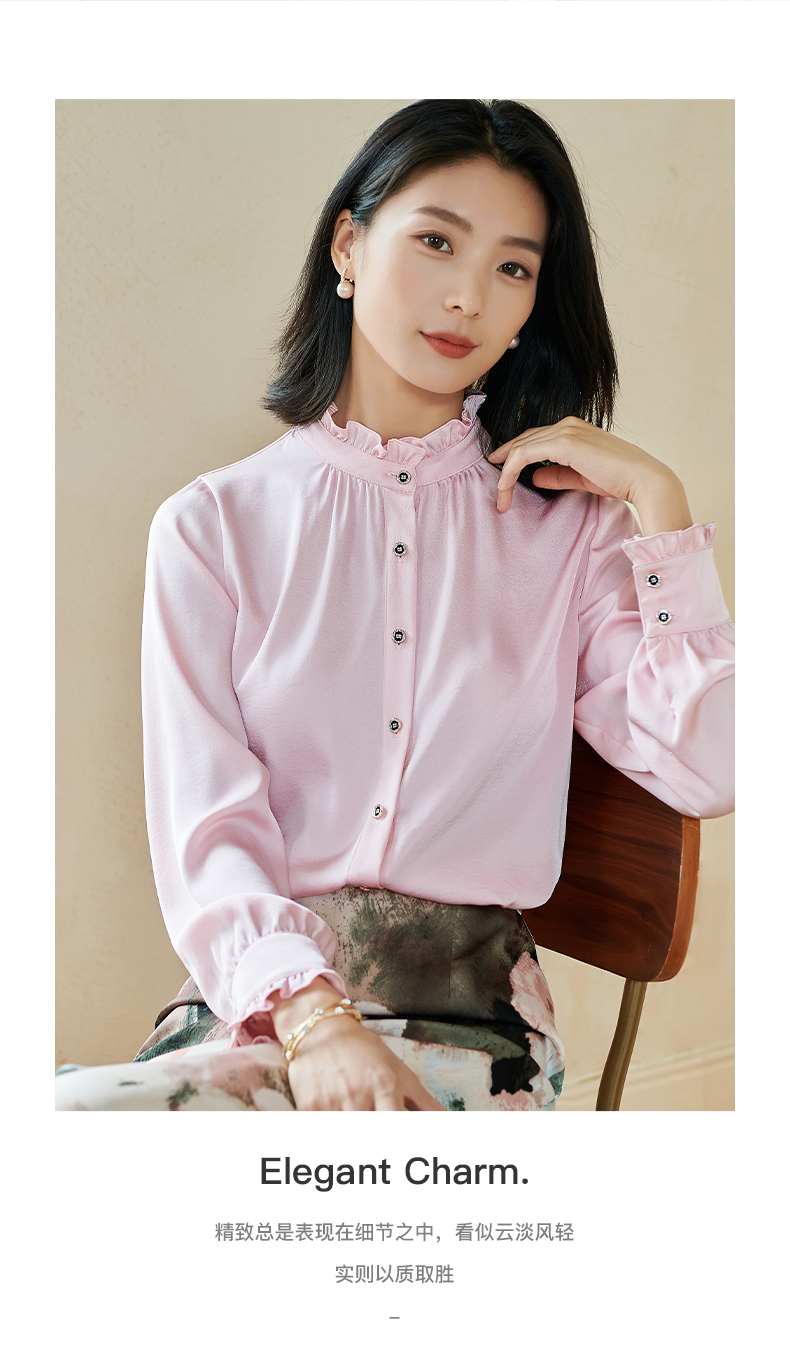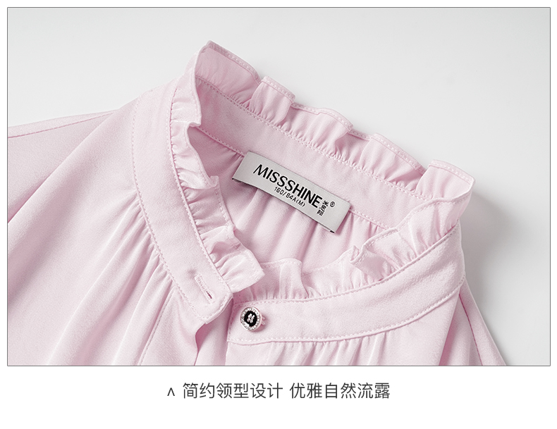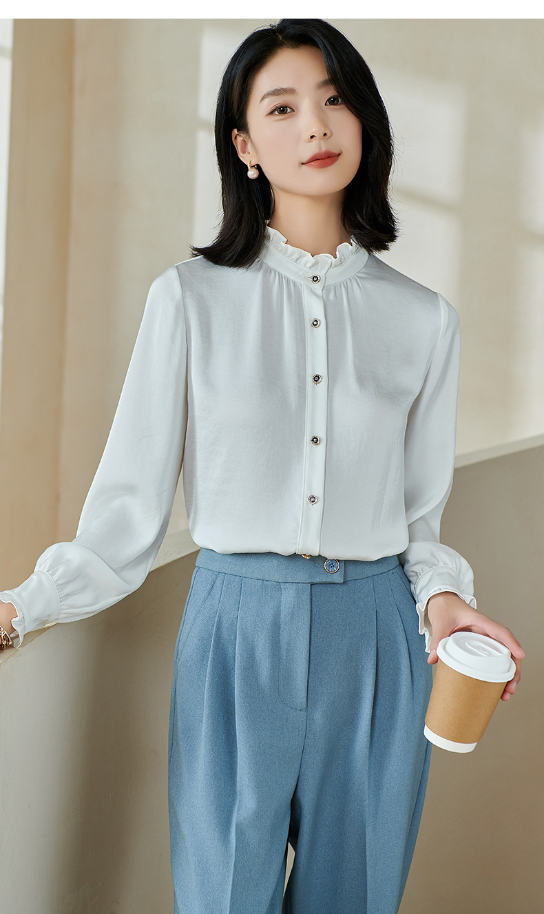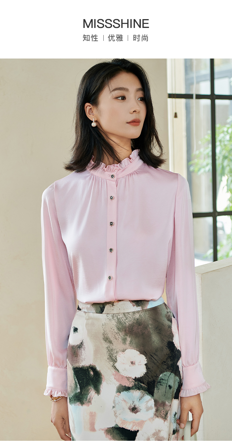 米思阳2026春季新款法式时尚纯色宽松衬衫荷叶领弹力开衫上衣0026