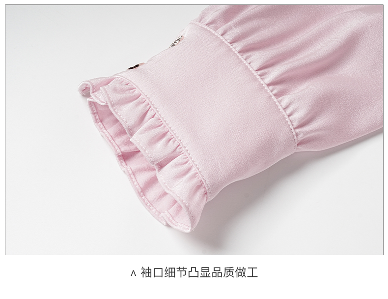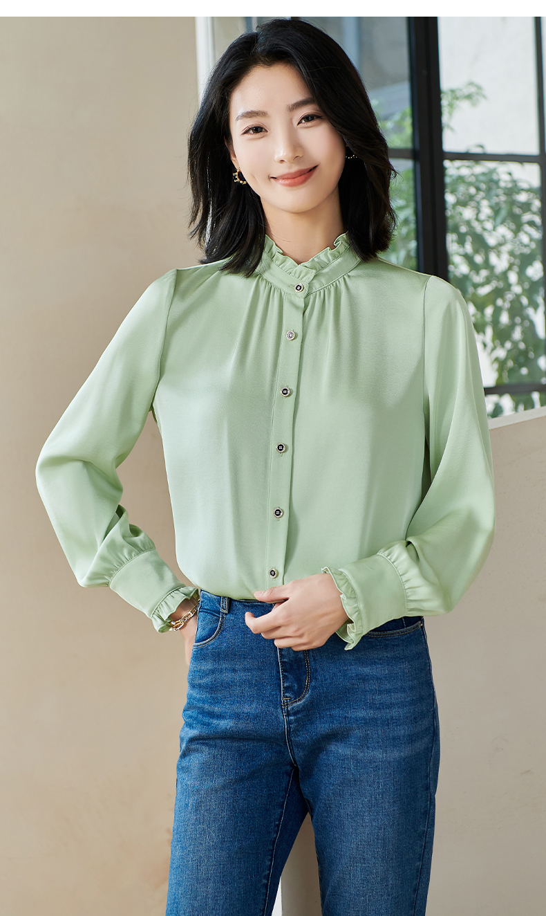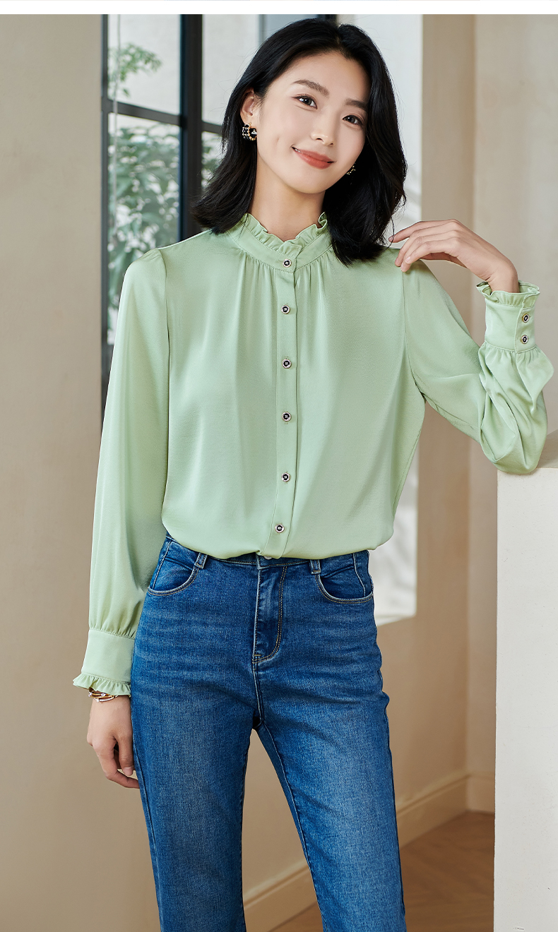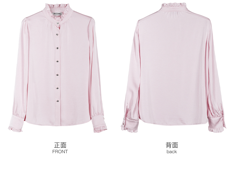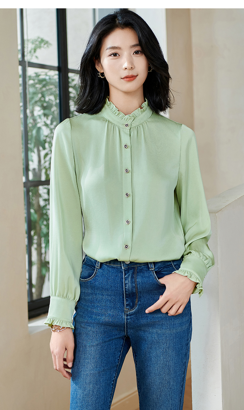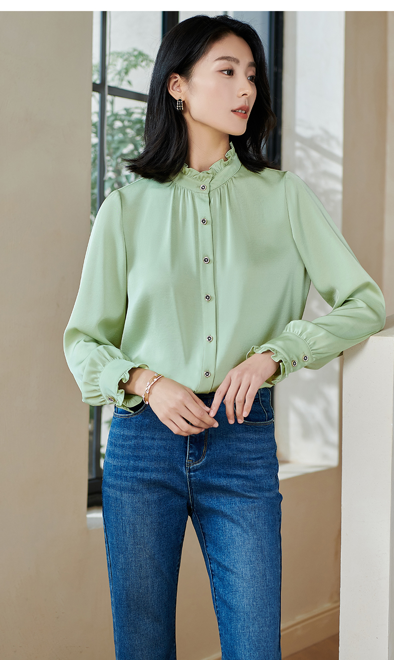 米思阳2026春季新款法式时尚纯色宽松衬衫荷叶领弹力开衫上衣0026
