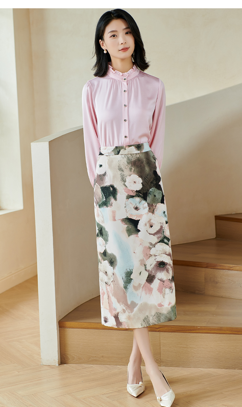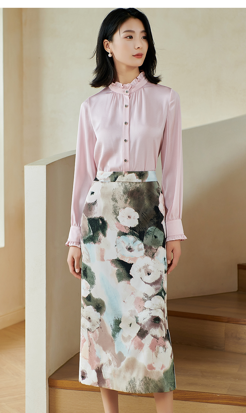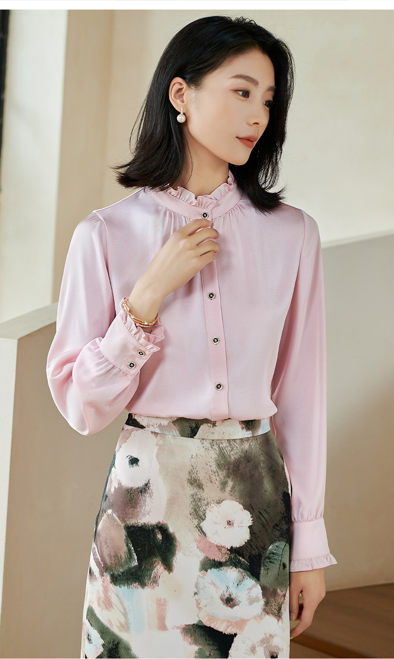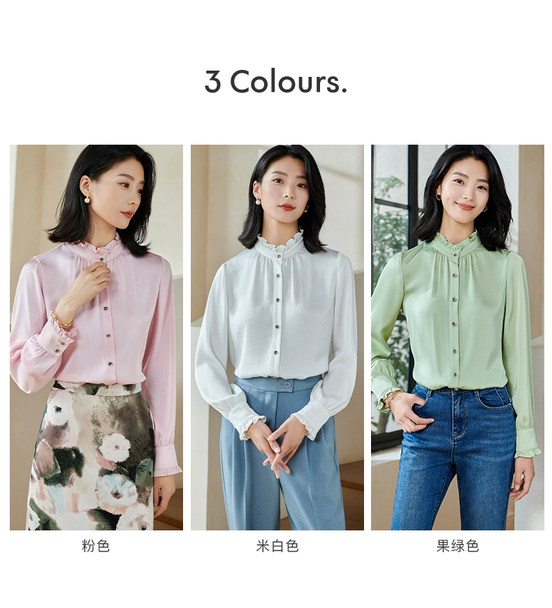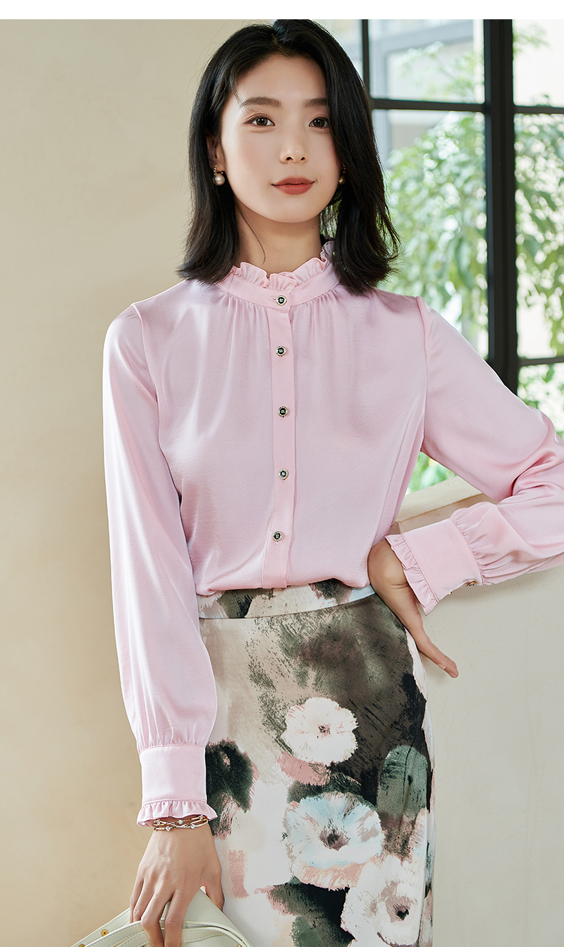 米思阳2026春季新款法式时尚纯色宽松衬衫荷叶领弹力开衫上衣0026