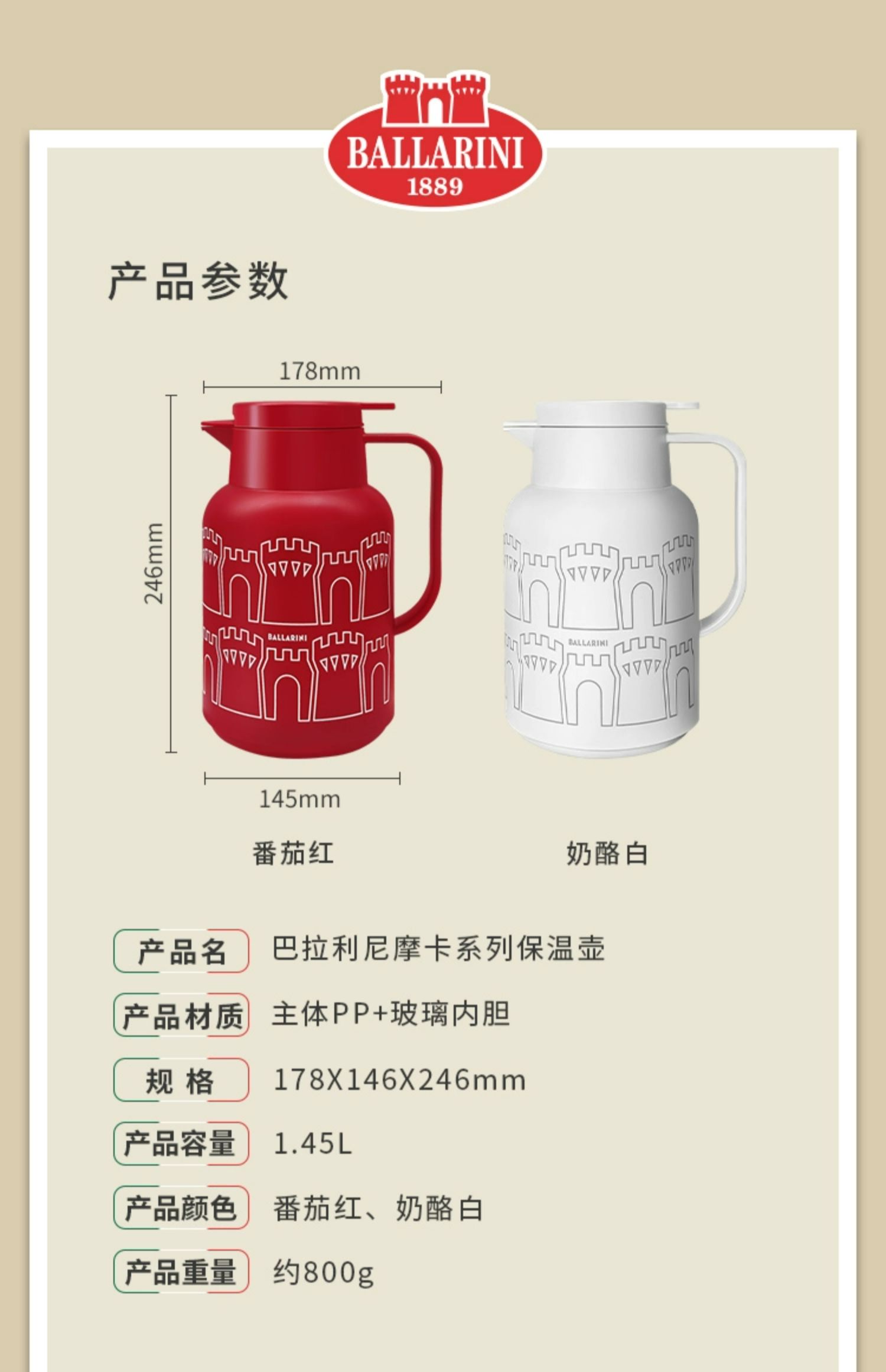 【柏联B1】双立人巴拉尼利摩卡系列保温壶1.45L(奶酪白/番茄红)(满2000元包邮)