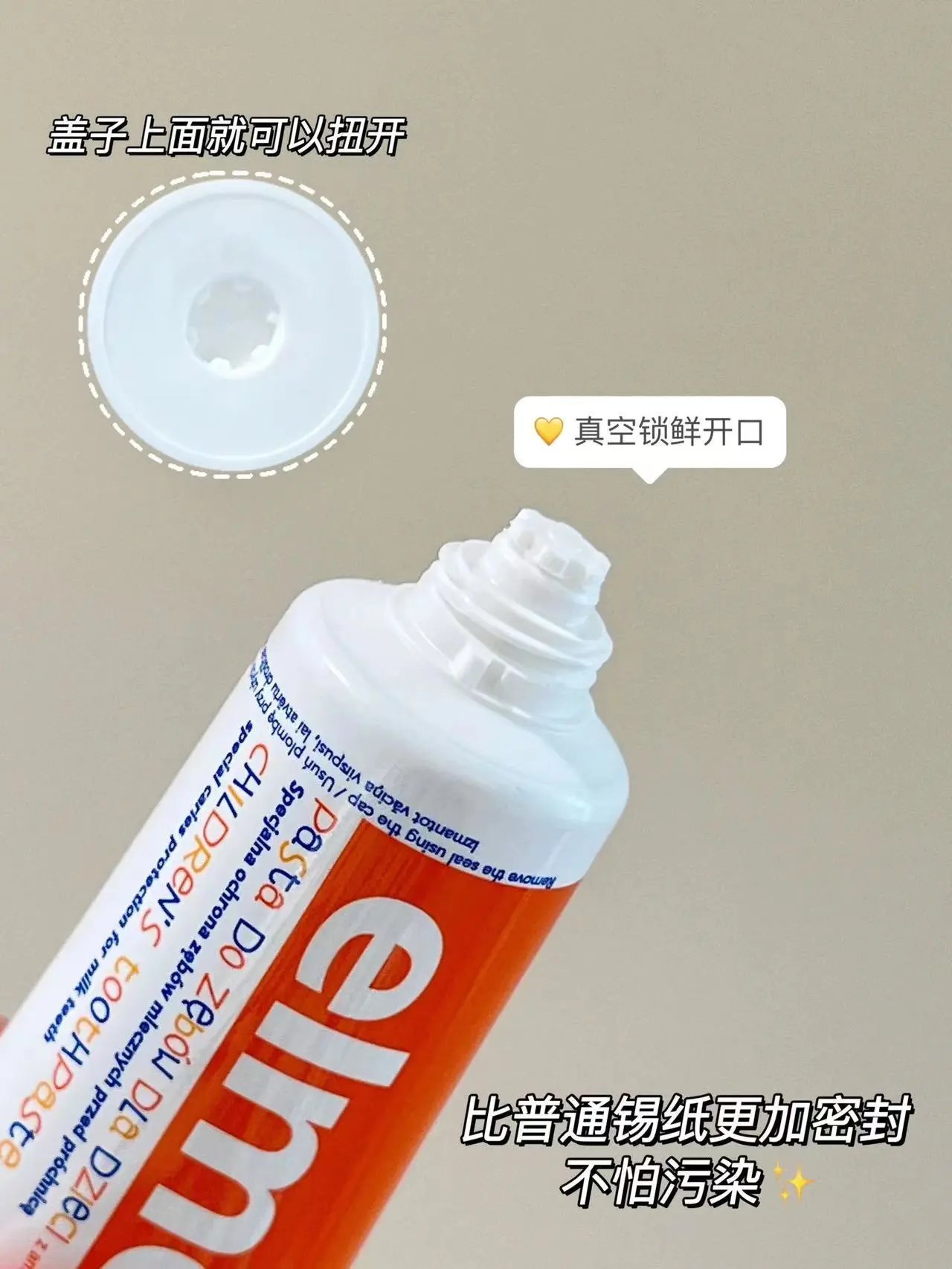 在德国权威检测机构 Stima 防龋齿检测(就是检查牙膏的含氟物)中 它的奥拉氟成分,评测结果为最高的一档:「SEHR GUT」(非常好) 成分温和,低泡配方,可吞咽 给娃买牙膏的时候,最好是选低泡沫配方的 艾美适的这款儿童牙膏就采用了低泡设计 每次刷牙时的泡沫不多不少,刚好能洁净宝宝的小牙齿 它同时还拥有非常出色的水溶性和延展性 小宝宝刷牙时及时擦掉嘴里的泡沫,大点儿的宝宝直接漱口 牙膏的味道是甜甜的 膏体是白色,没有添加任何着色剂 宝宝不抗拒~ 关键是,好用还不贵! 独特的开口设计,用起来超方便 细心一点就会发现 它的牙膏盖旋钮装置是五边形 把牙膏的盖子倒扣过来 一拧就开,用起来真的超级方便