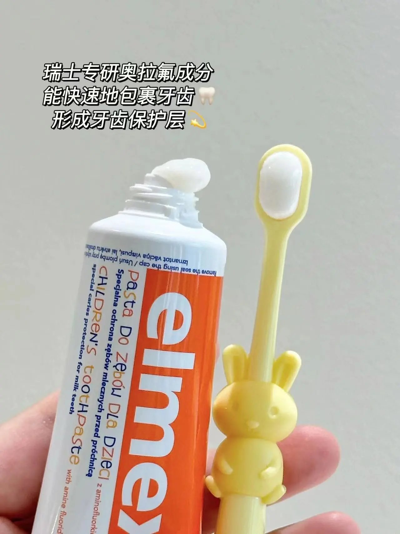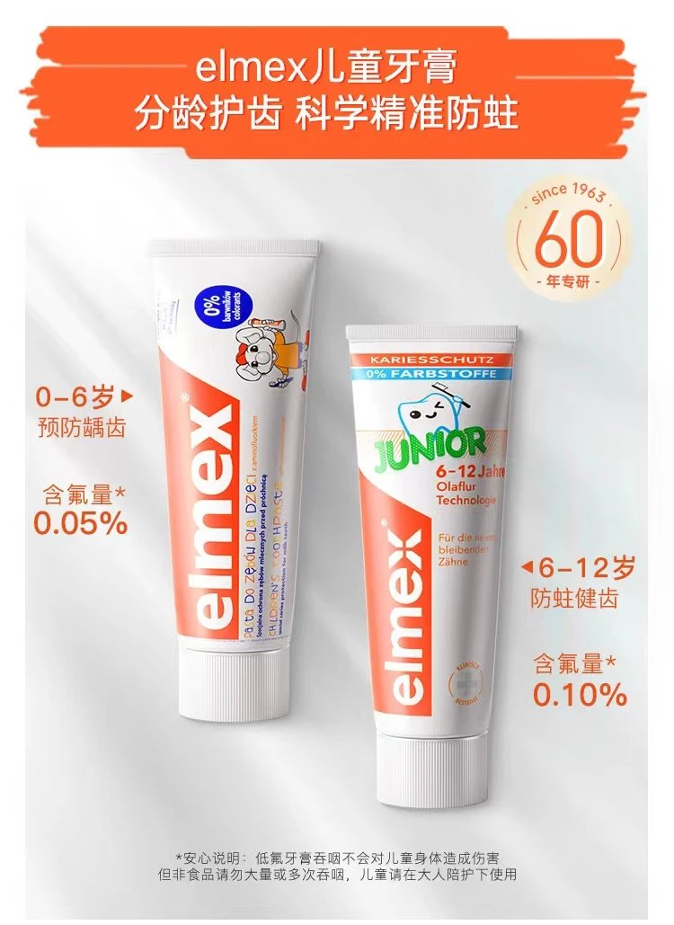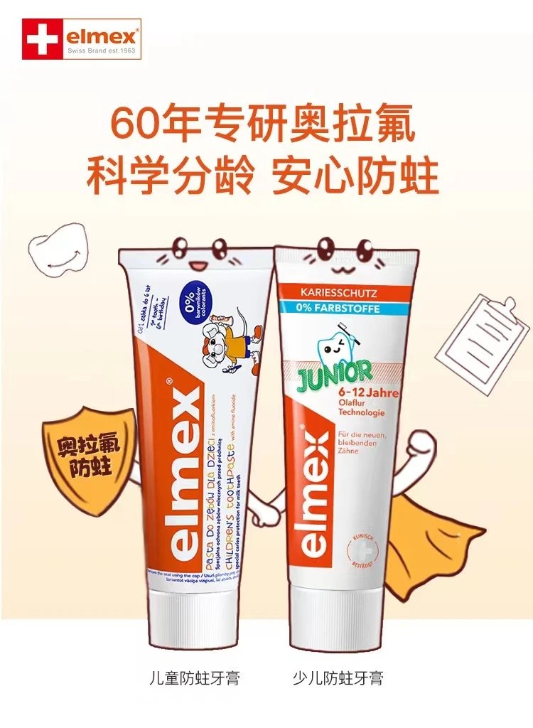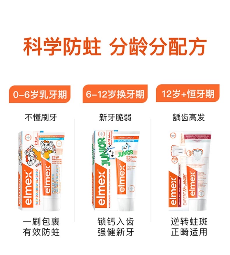 小朋友越小口腔问题越得重视 早晚都要刷牙 ,做好清洁 宝宝从长出第一颗牙开始 建议就开始使用专业的含氟儿童牙膏 适量的氟可以有效防蛀牙,还可以保护牙釉质 做了很多功课最终选择了 央视网都推荐过的elmex艾美适儿童牙膏 还是瑞士 进口品牌,身边很多麻麻都在用 它家的牙膏针对不同年龄的儿童做了分龄处理 0-6岁儿童低氟防蛀牙膏更适合乳牙期的宝宝 6-12岁换牙期的孩子可用含氟量高点的少儿防蛀牙膏 姐妹们可以根据自家宝宝年龄去选择啦 满足不同年龄的宝宝刷牙需求忒贴心了 !