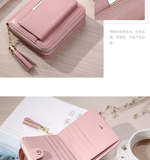 薇妮(viney)头层牛皮女士钱包短款拉链两折简约叠皮夹子情侣零钱包女韩版小钱包(粉色)