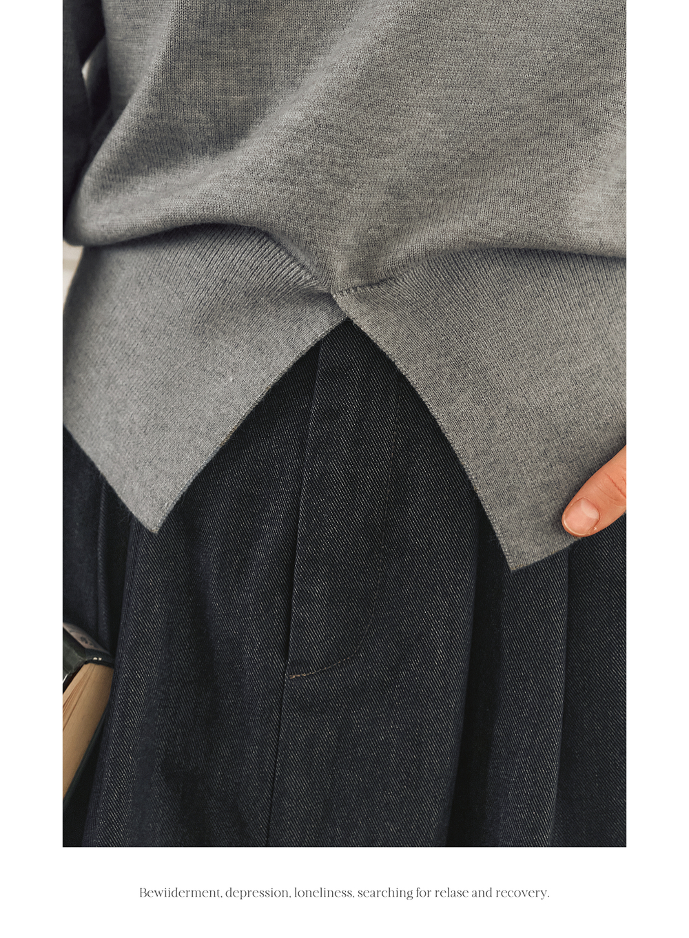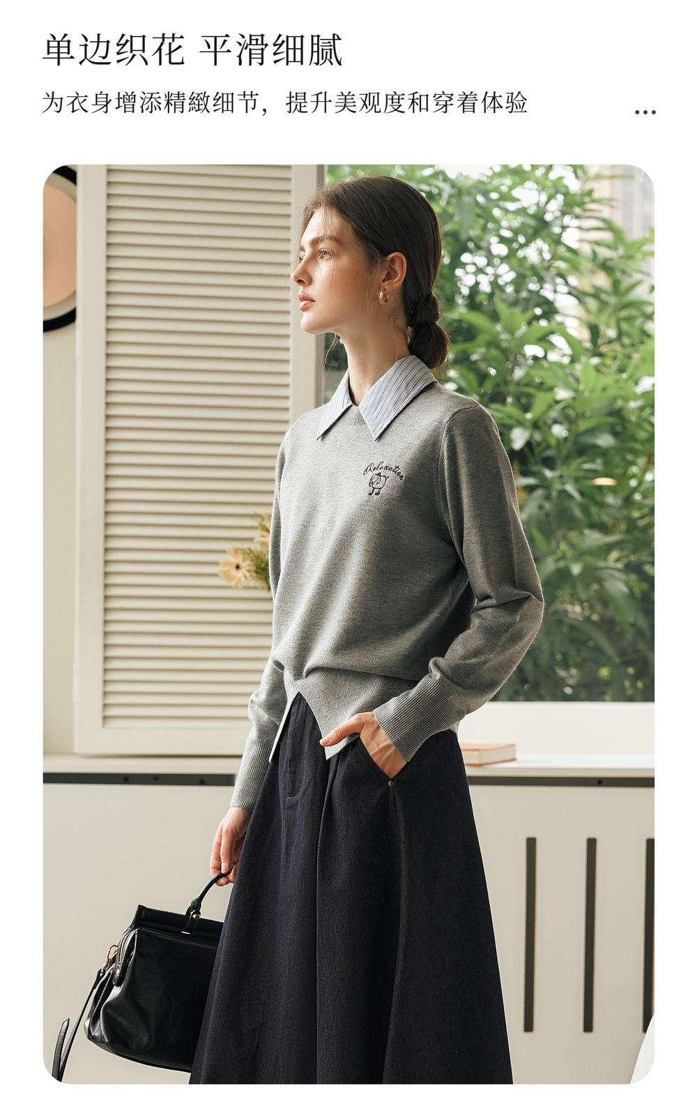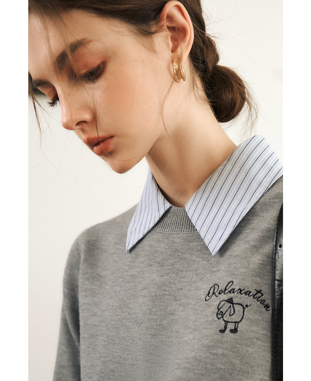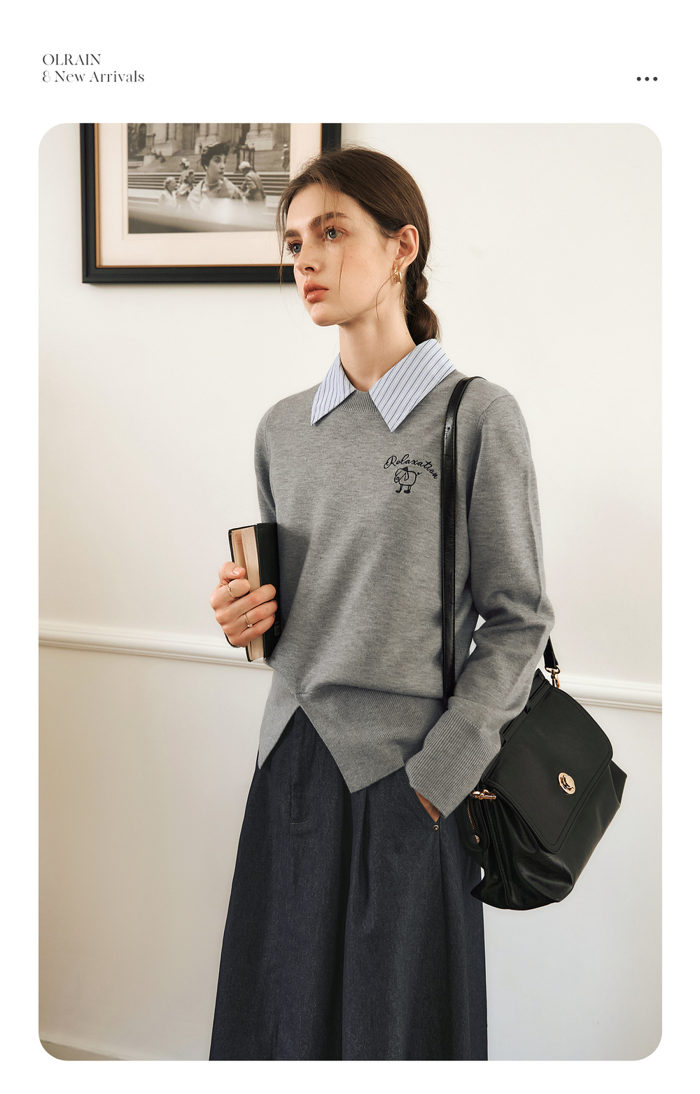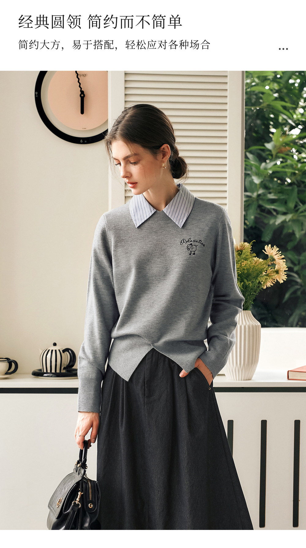OLrain欧芮儿灰色套头针织衫女冬季2024年新款通勤开叉圆领长袖