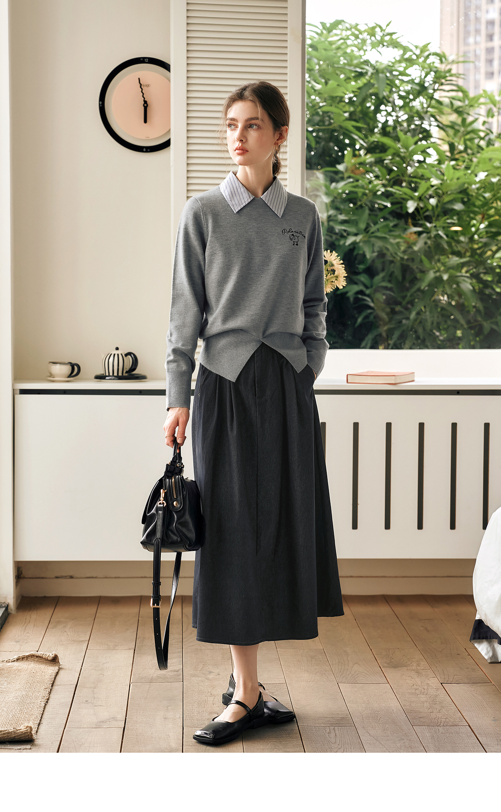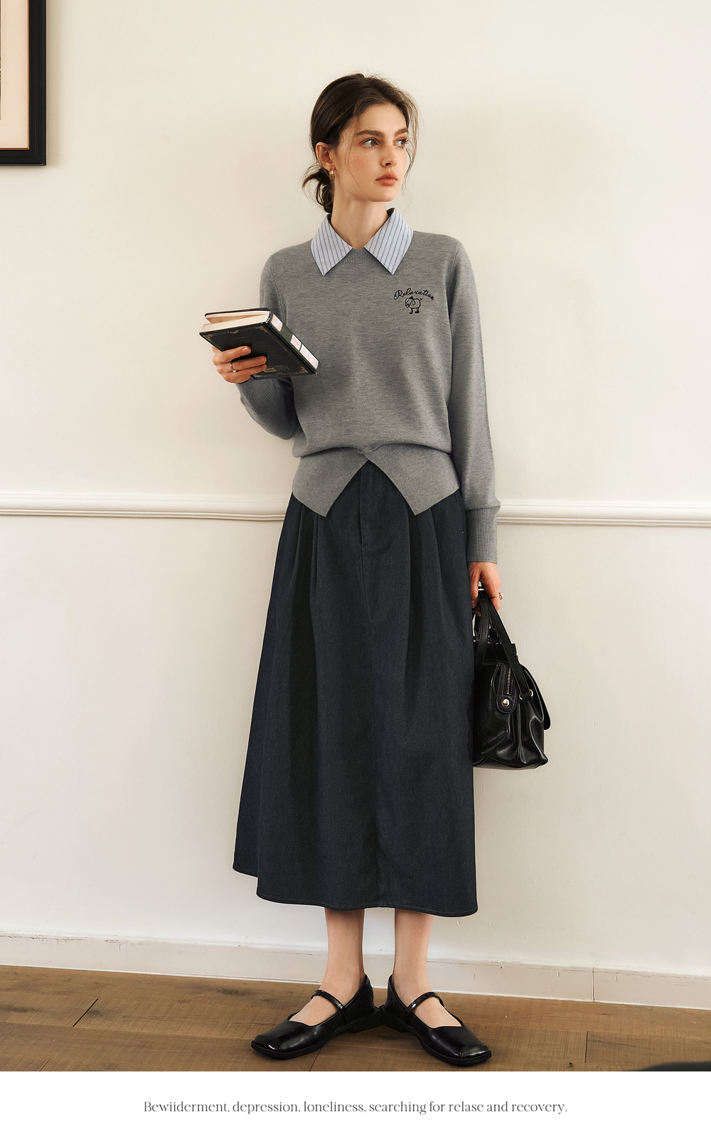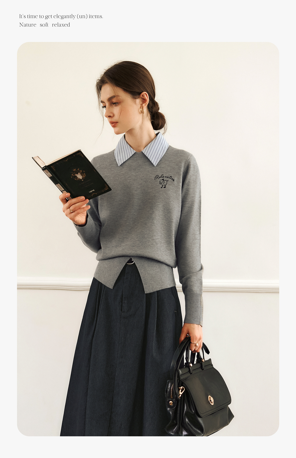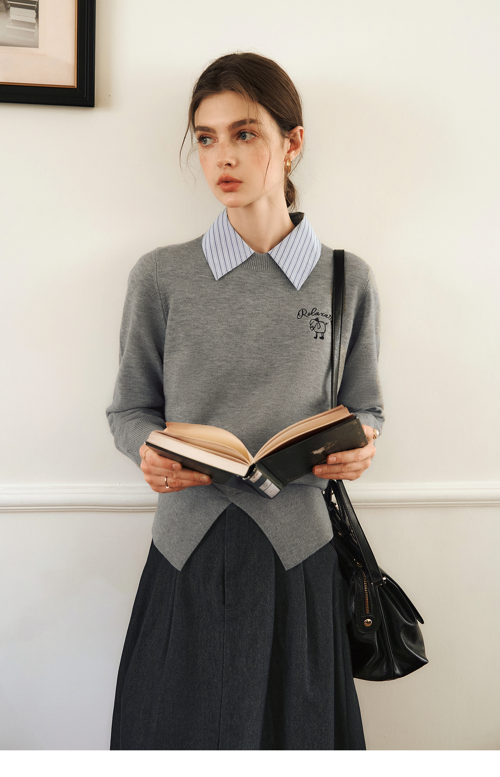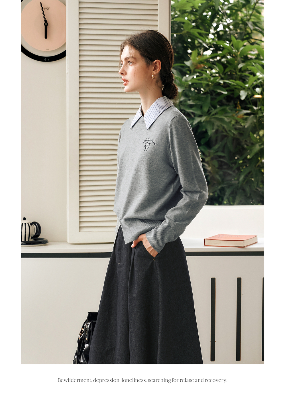 OLrain欧芮儿灰色套头针织衫女冬季2024年新款通勤开叉圆领长袖