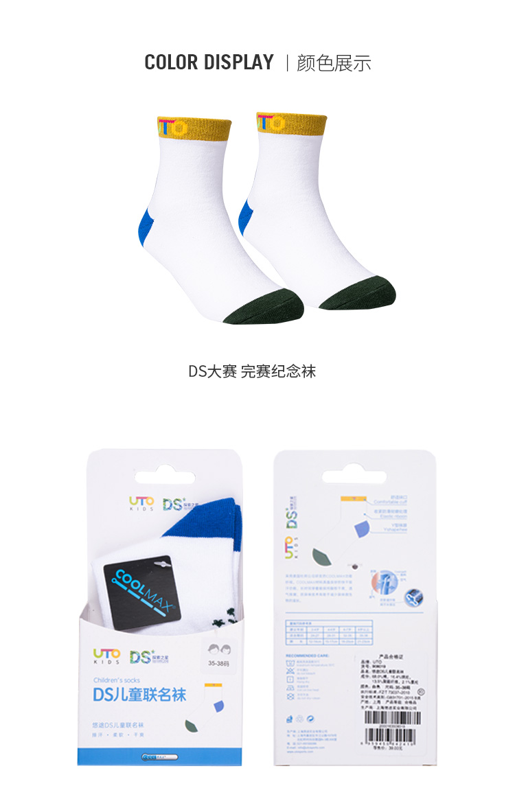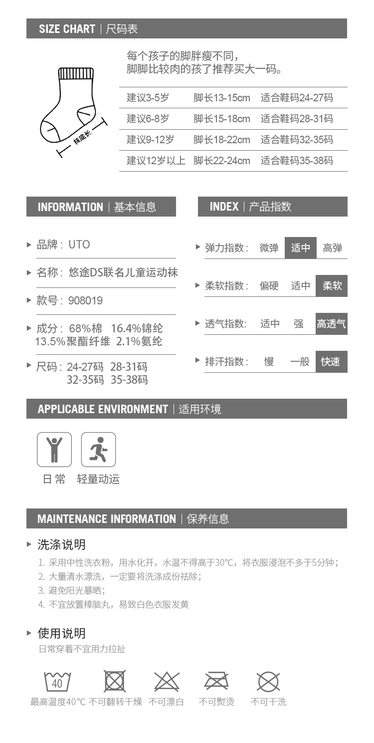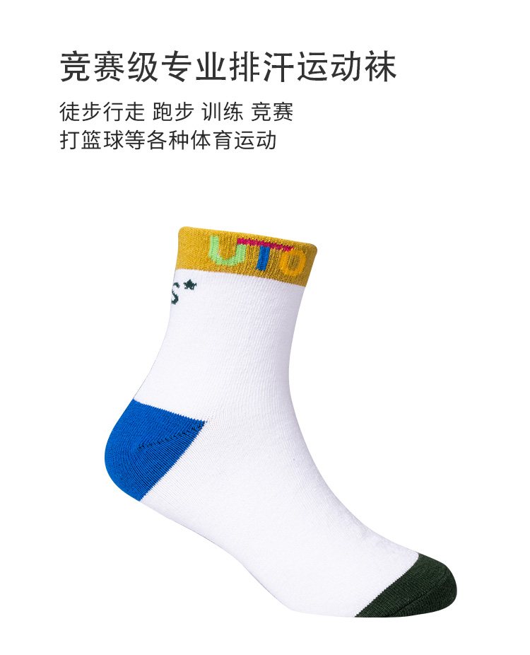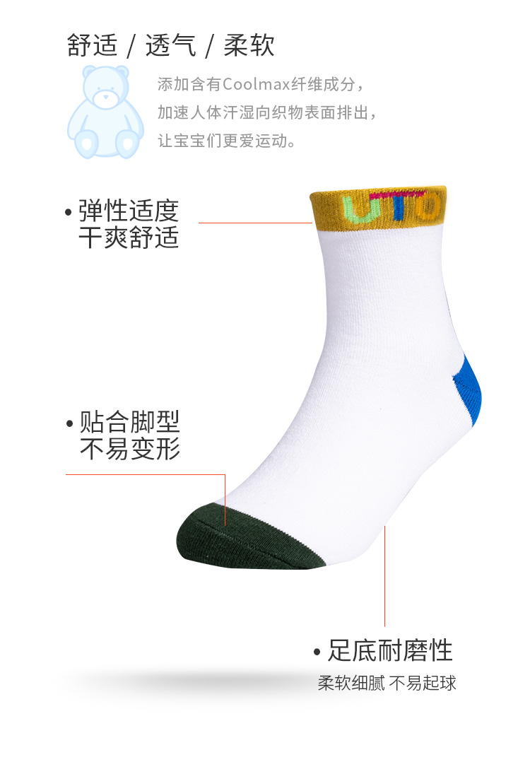 UTO/悠途儿童袜中帮运动袜男童排汗透气袜女童学校短袜【2双装】