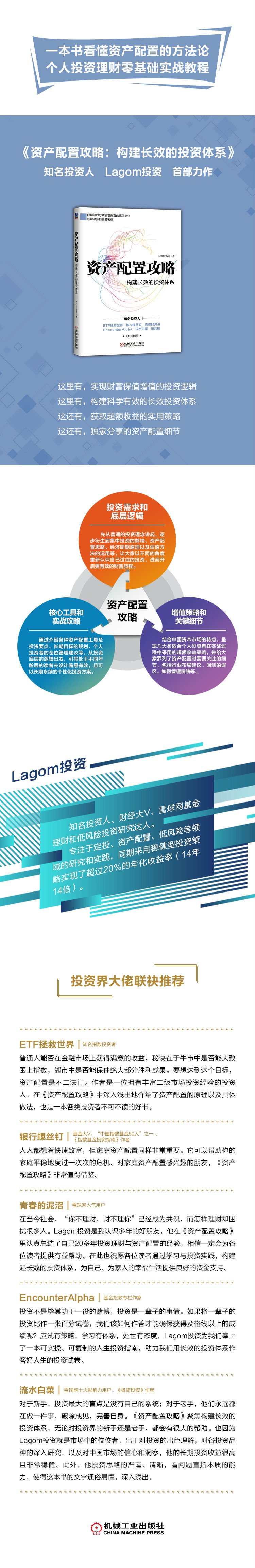 在我看来,“Lagom投资”用十几年时间尝试了一条在国内可复制、可推广,且风险相对可控的资产配置路径。此前,“Lagom投资”也不时在微博、雪球撰文介绍自己的投资经验,此次成书既是对他自己的投资体系的一次全面梳理,也是普通投资者一窥投资门径的难得机会。