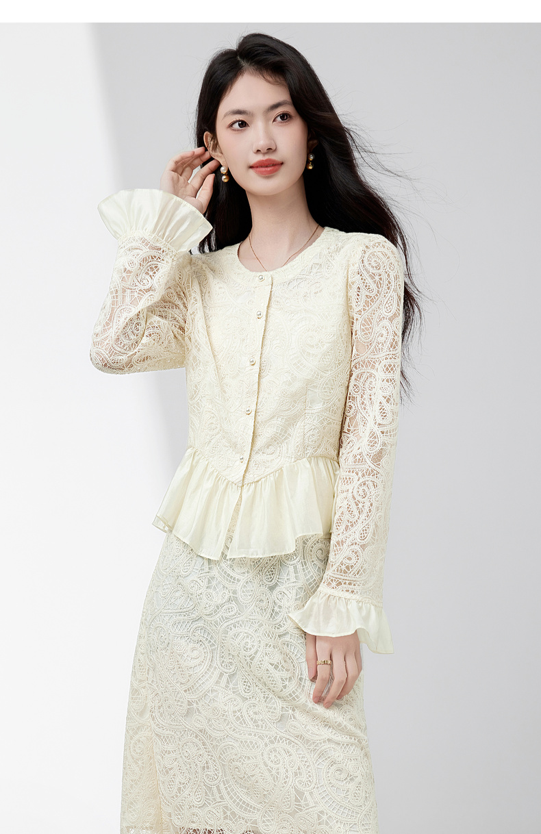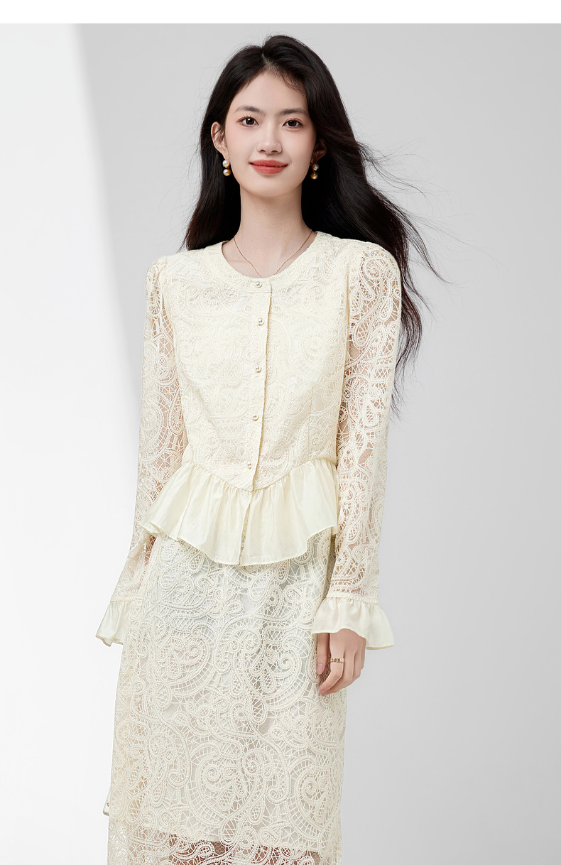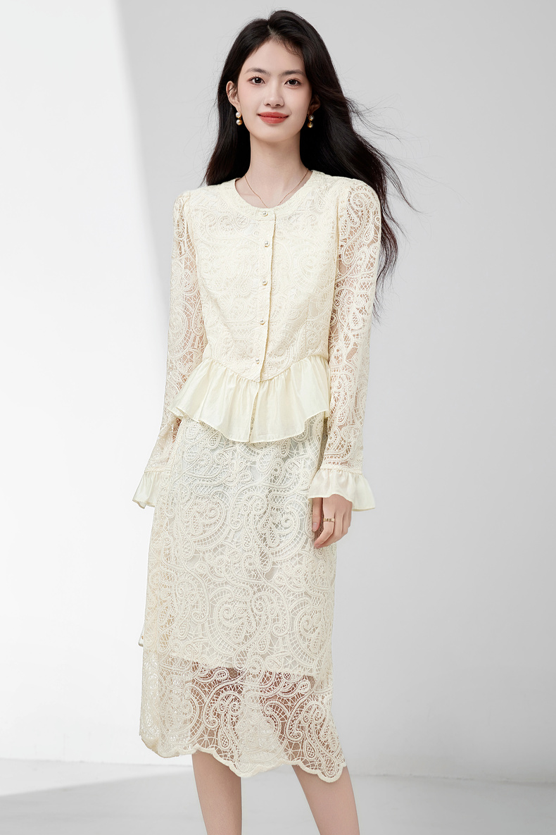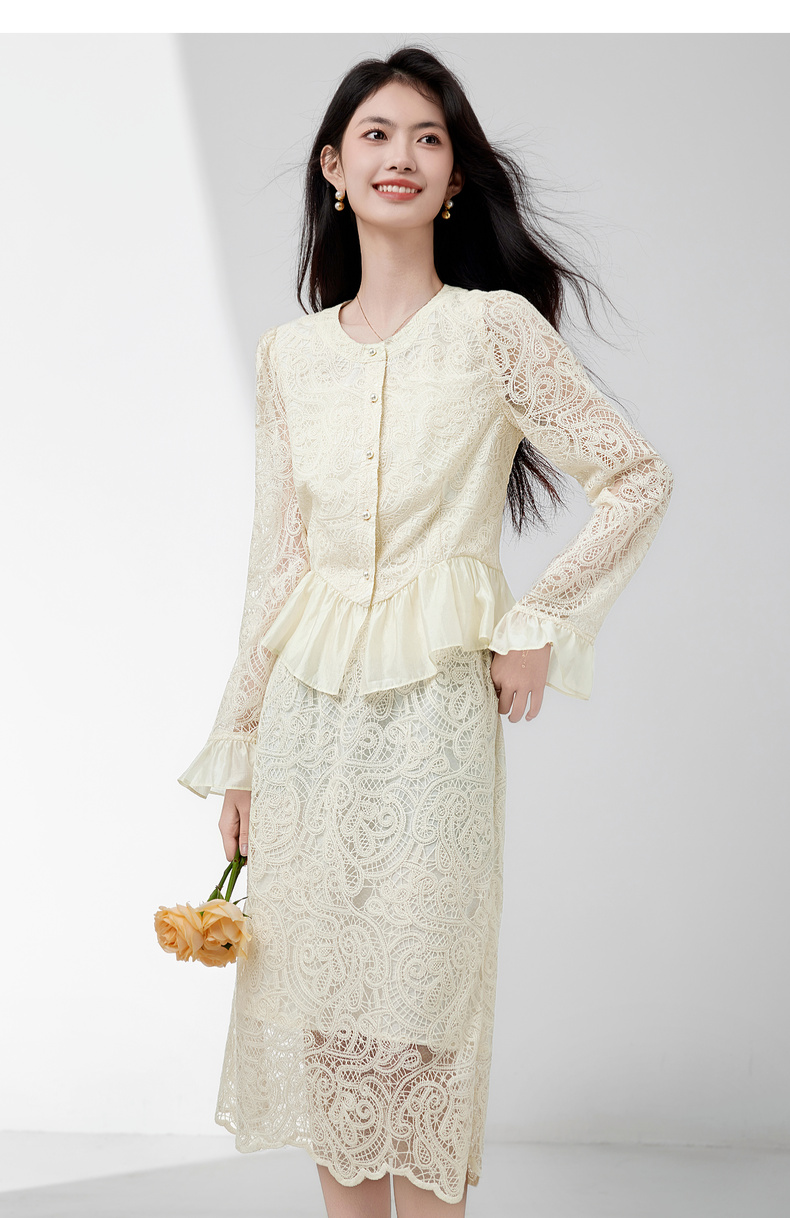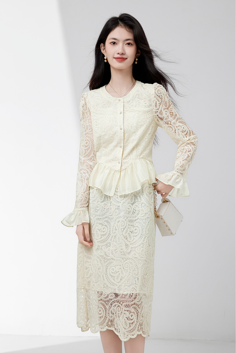 【内购】【懒人套装】优雅通勤镂空蕾丝绣花长袖上衣&松紧腰直筒半身裙-153ZA2637