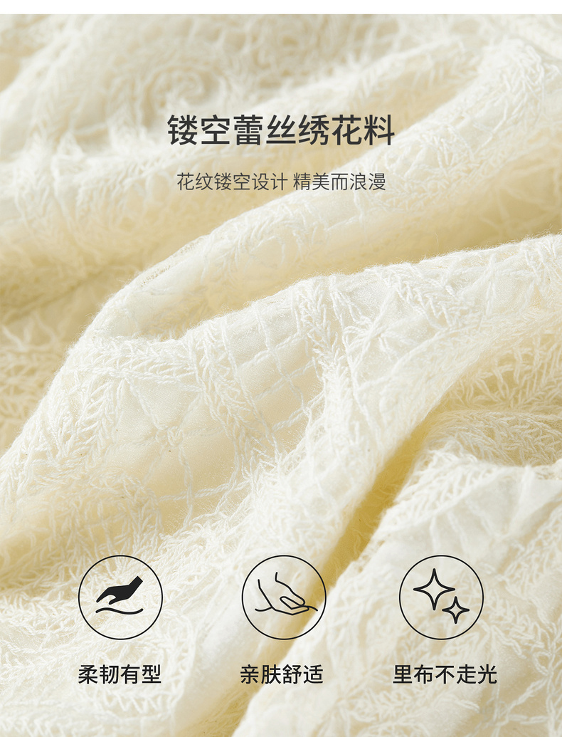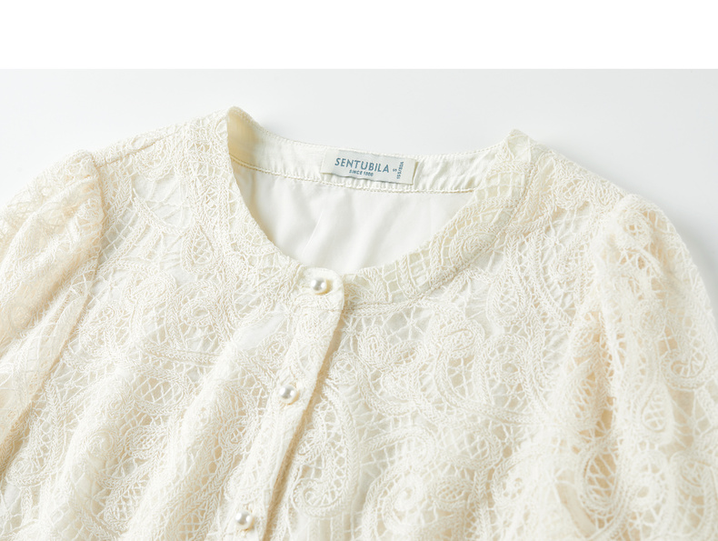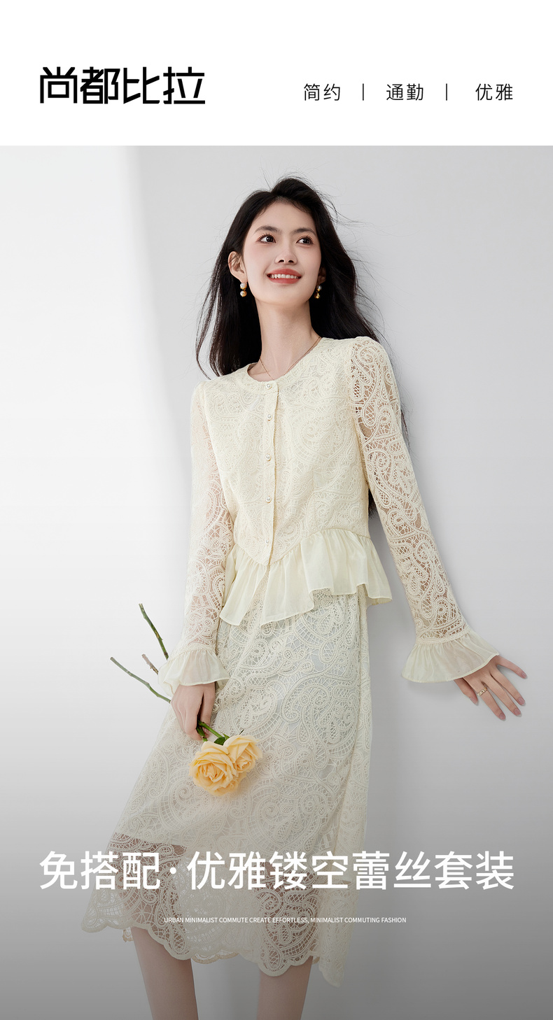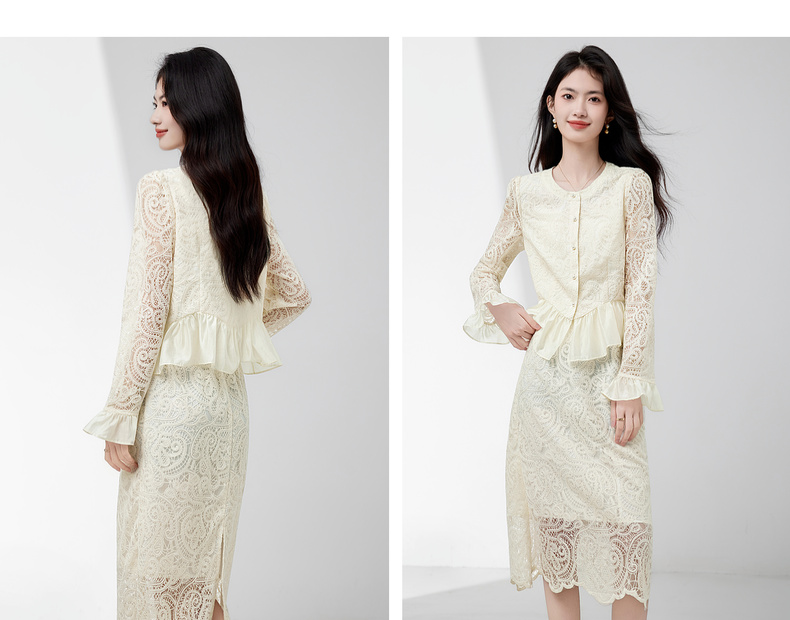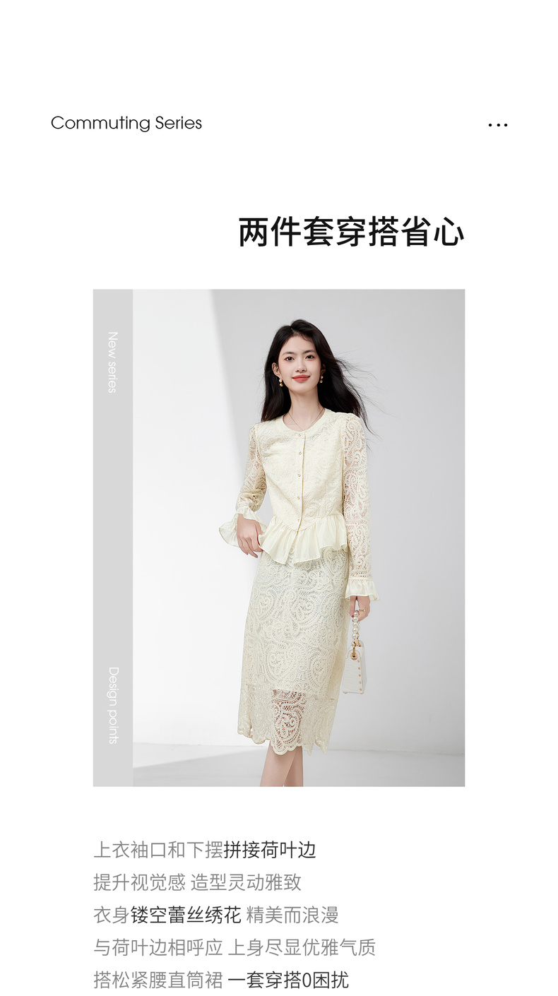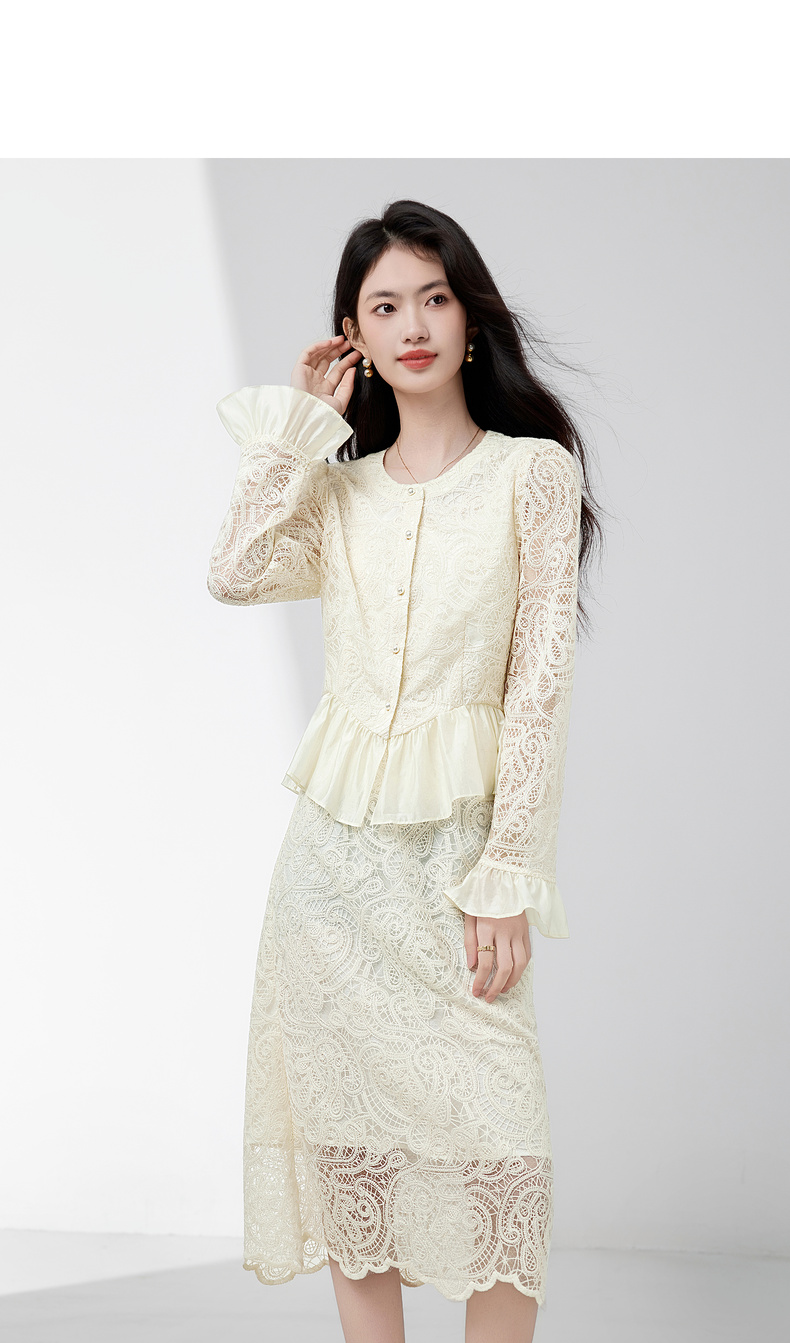 【内购】【懒人套装】优雅通勤镂空蕾丝绣花长袖上衣&松紧腰直筒半身裙-153ZA2637