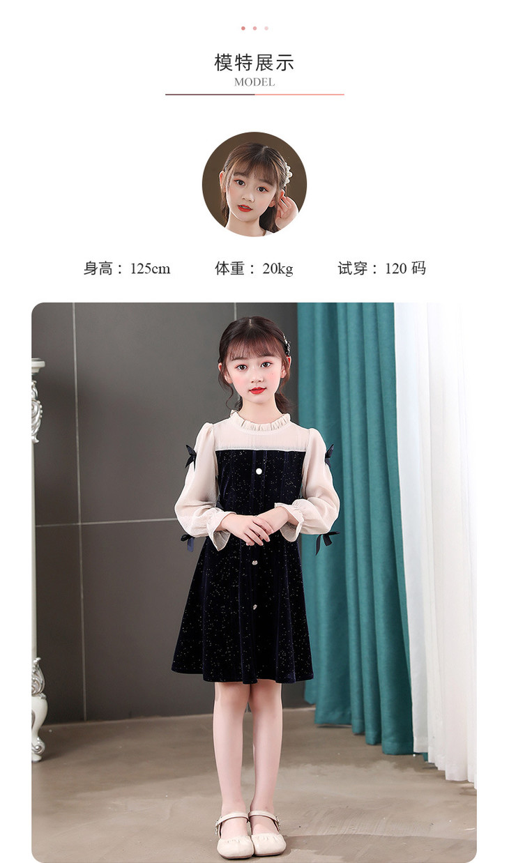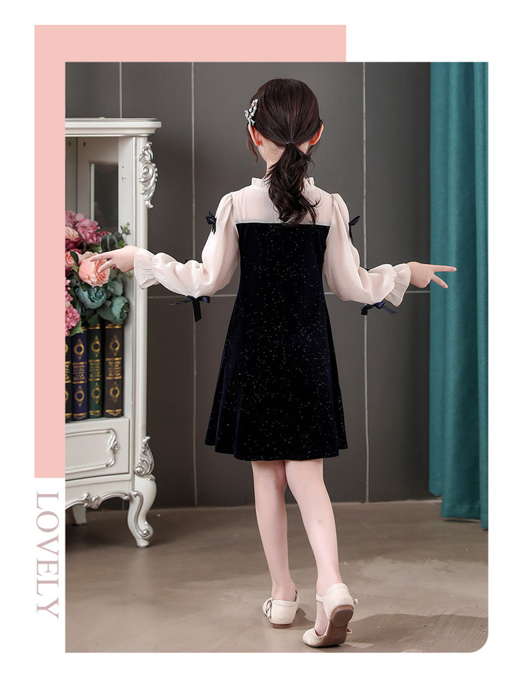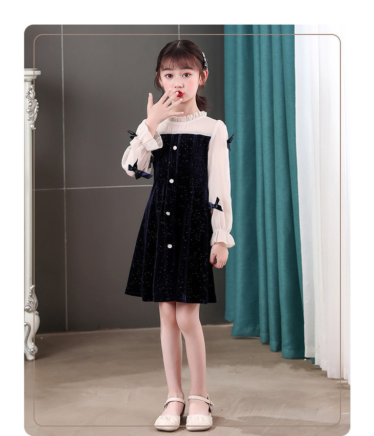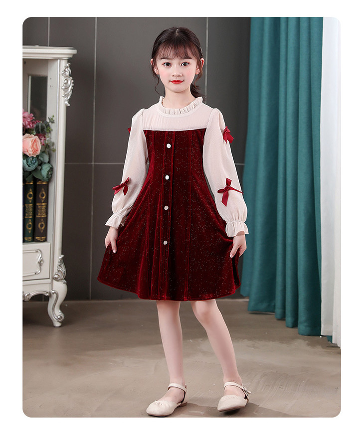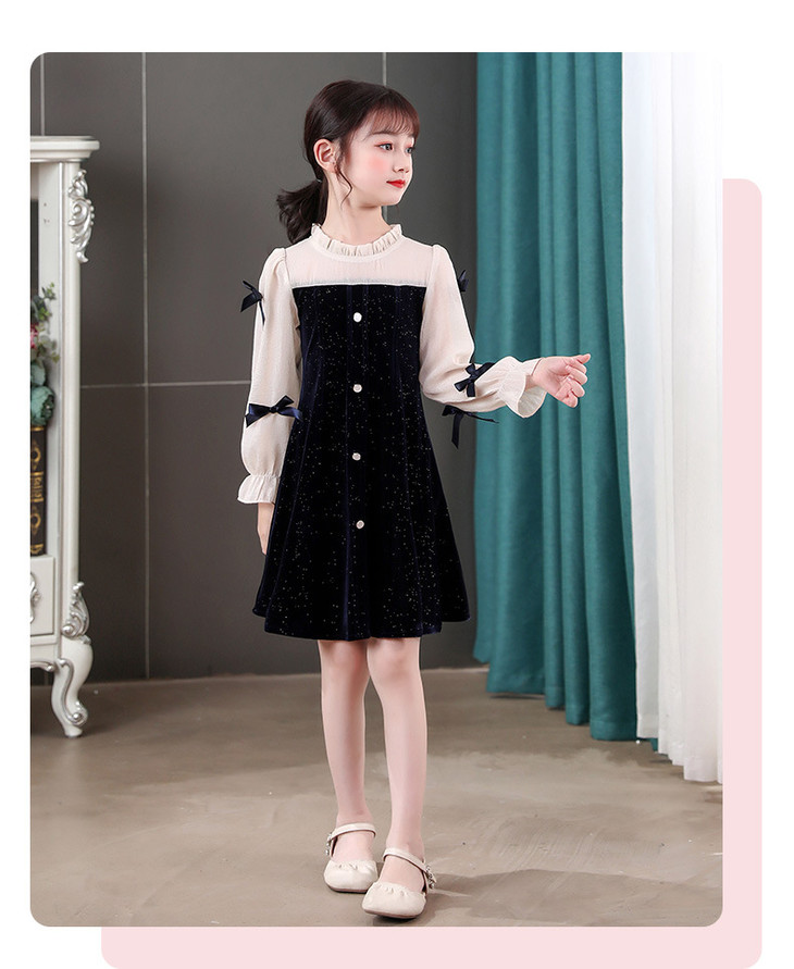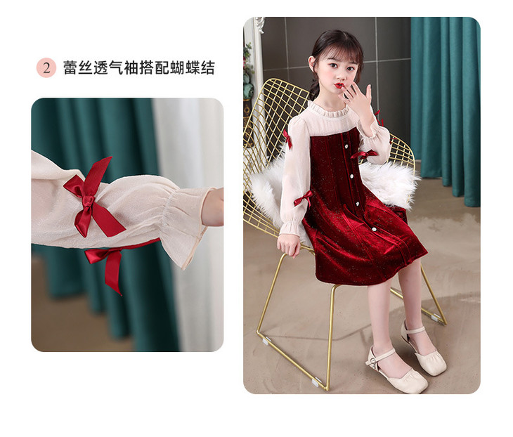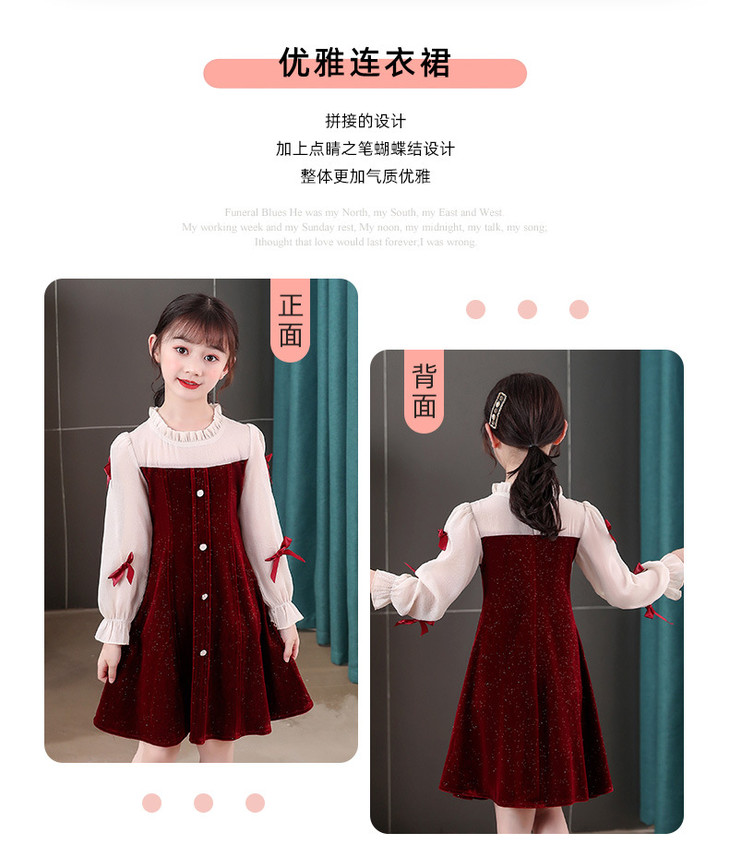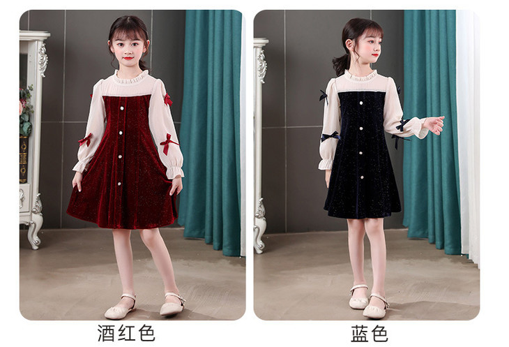 甜美洋气女童公主连衣裙,金丝绒长袖拼接蕾丝蝴蝶结儿童公主裙XWN-2520