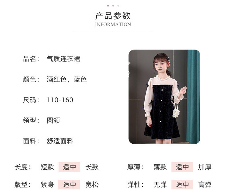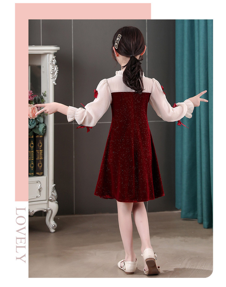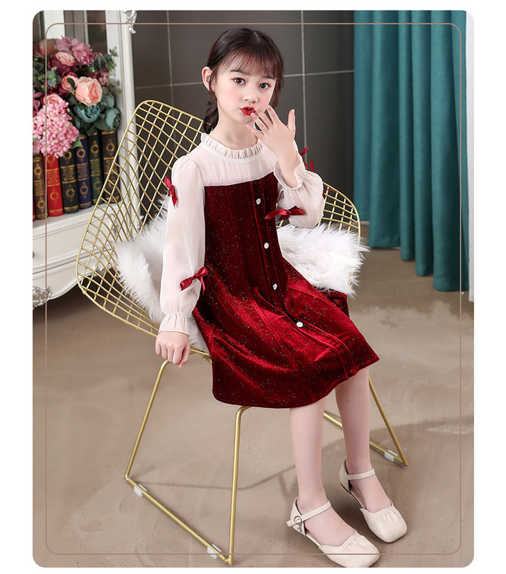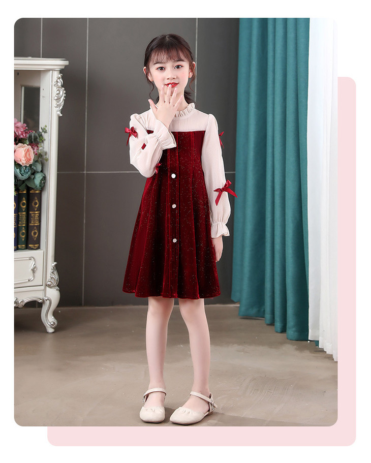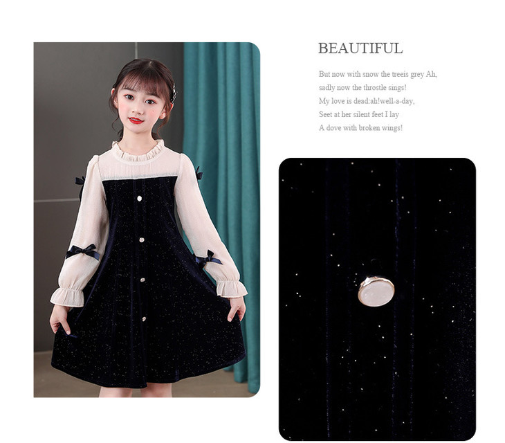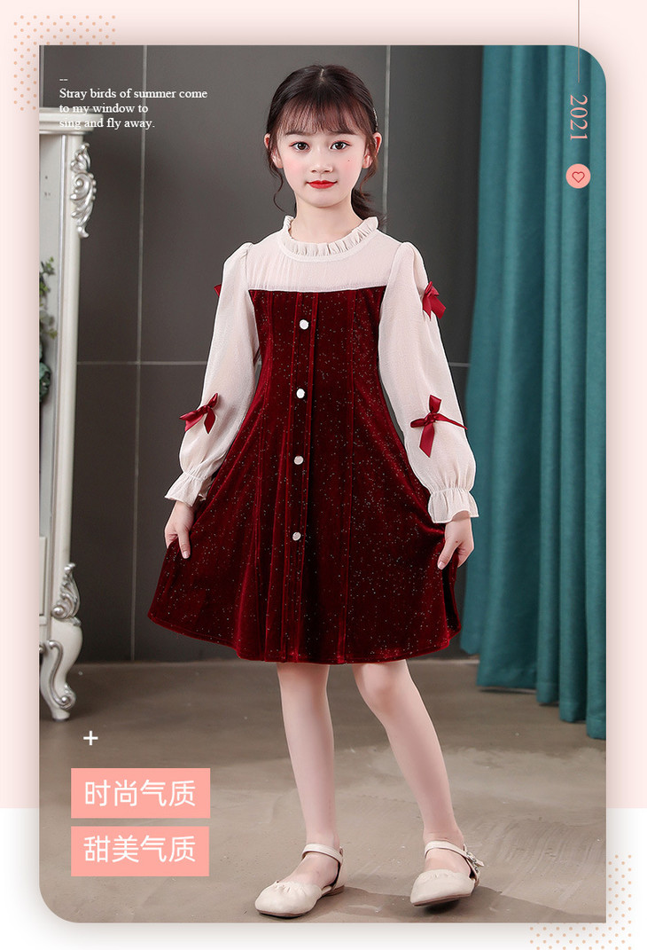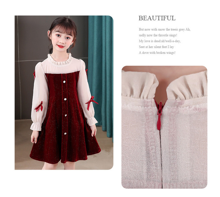 甜美洋气女童公主连衣裙,金丝绒长袖拼接蕾丝蝴蝶结儿童公主裙XWN-2520
