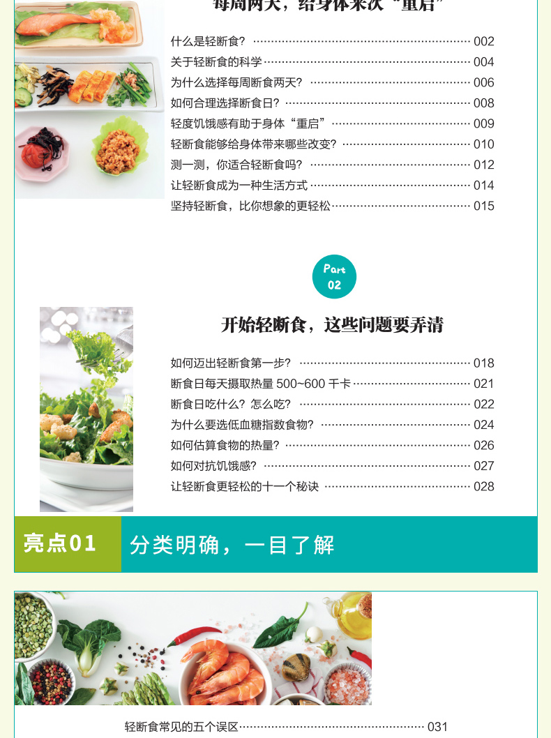 本书为生活类图书。近年来,轻断食风靡全球,已经成为一种生活方式。本书概括了什么是轻断食,关于轻断食的科学,轻断食能够给身体带来哪些改变等,让读者全面了解轻断食的起源、功效以及科学原理。并介绍了如何迈出轻断食第一步、如何对抗饥饿感、轻断食常见的误区等,从而打消读者关于轻断食的疑虑,更加坚定加入轻断食计划。还详细剖析了人体推荐的营养素和这些营养素的食物来源,依据男女的不同特性、不同的营养需求,科学制定每周两天的轻断食食谱。