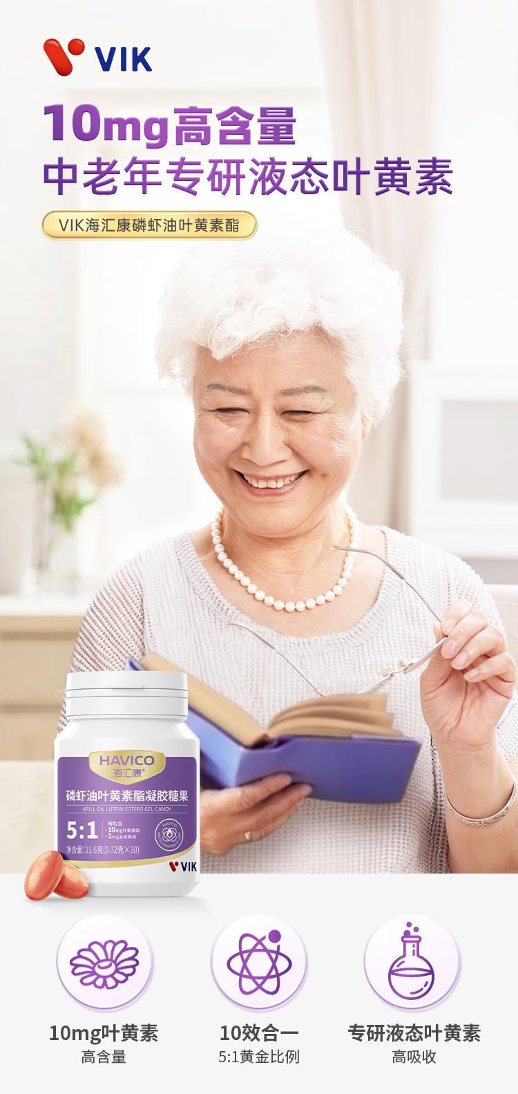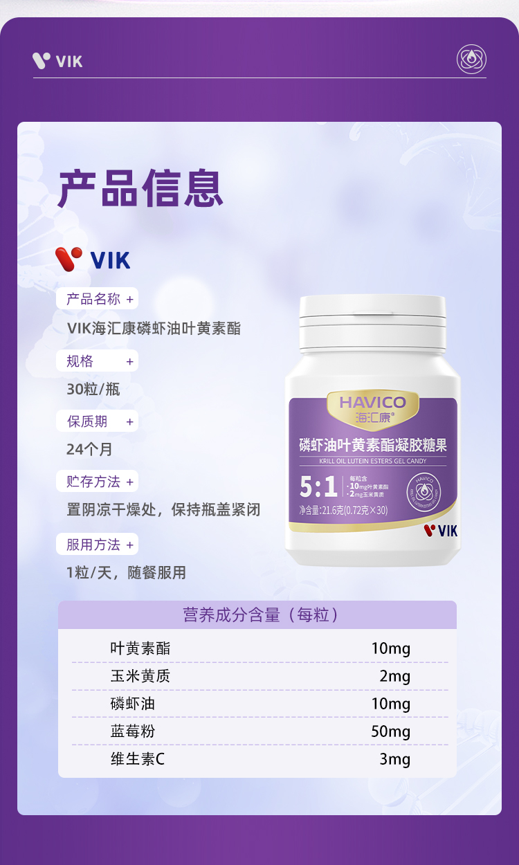 【产品名称】VIK海汇康磷虾油叶黄素酯凝胶糖果30粒