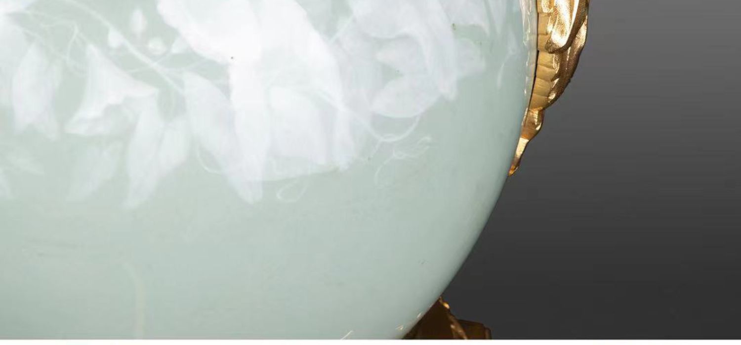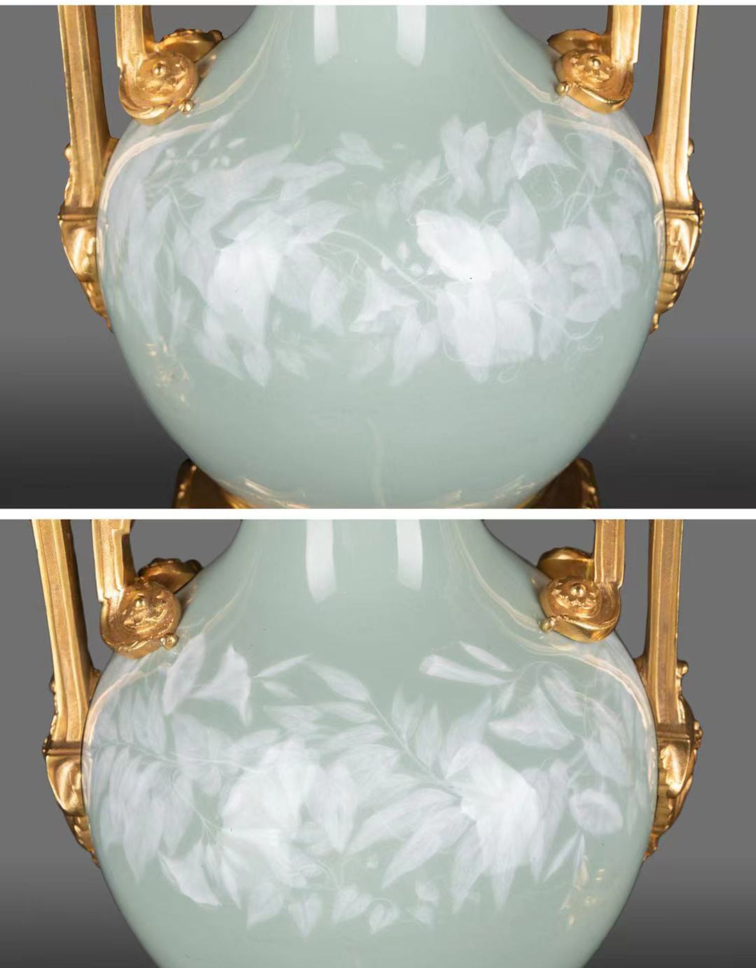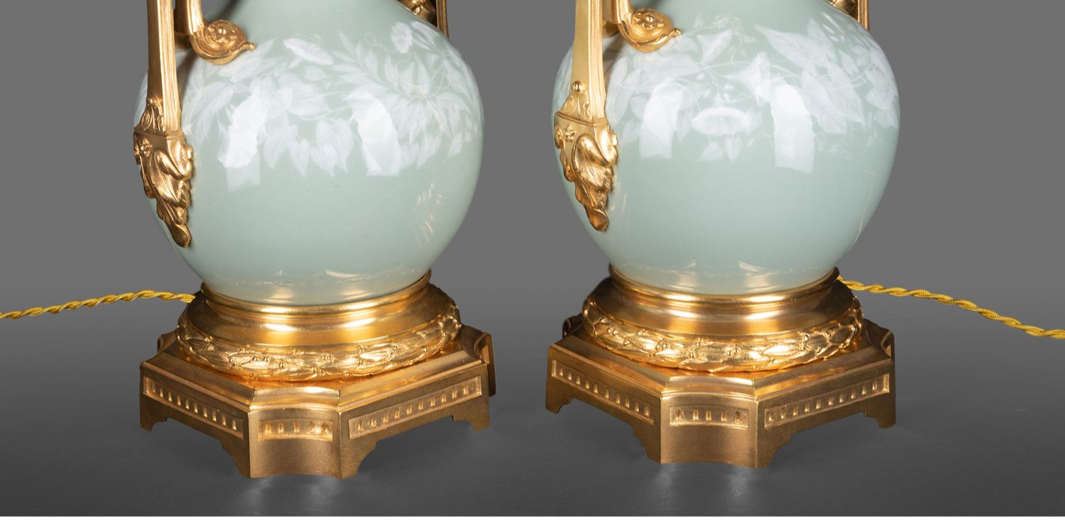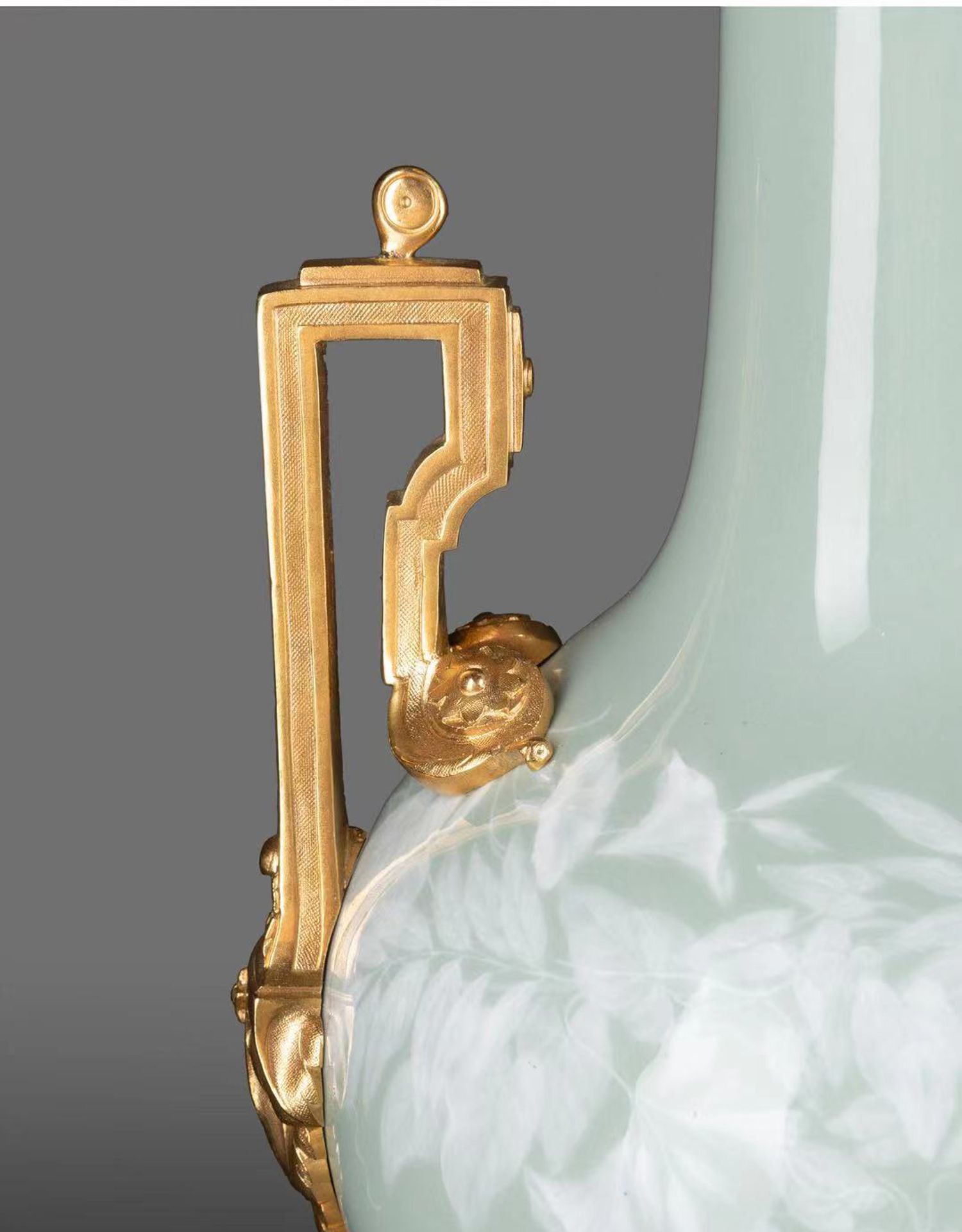 独角鹿西洋古董法国铜鎏金双耳雕饰豆青釉花卉浮雕瓷瓶台灯一对