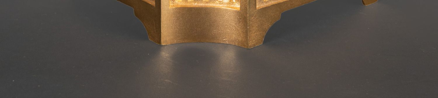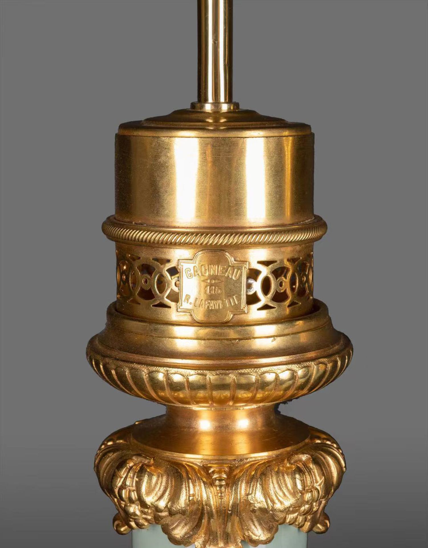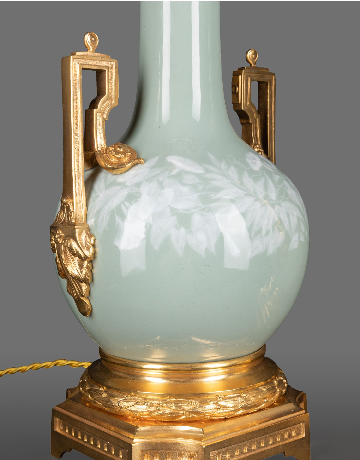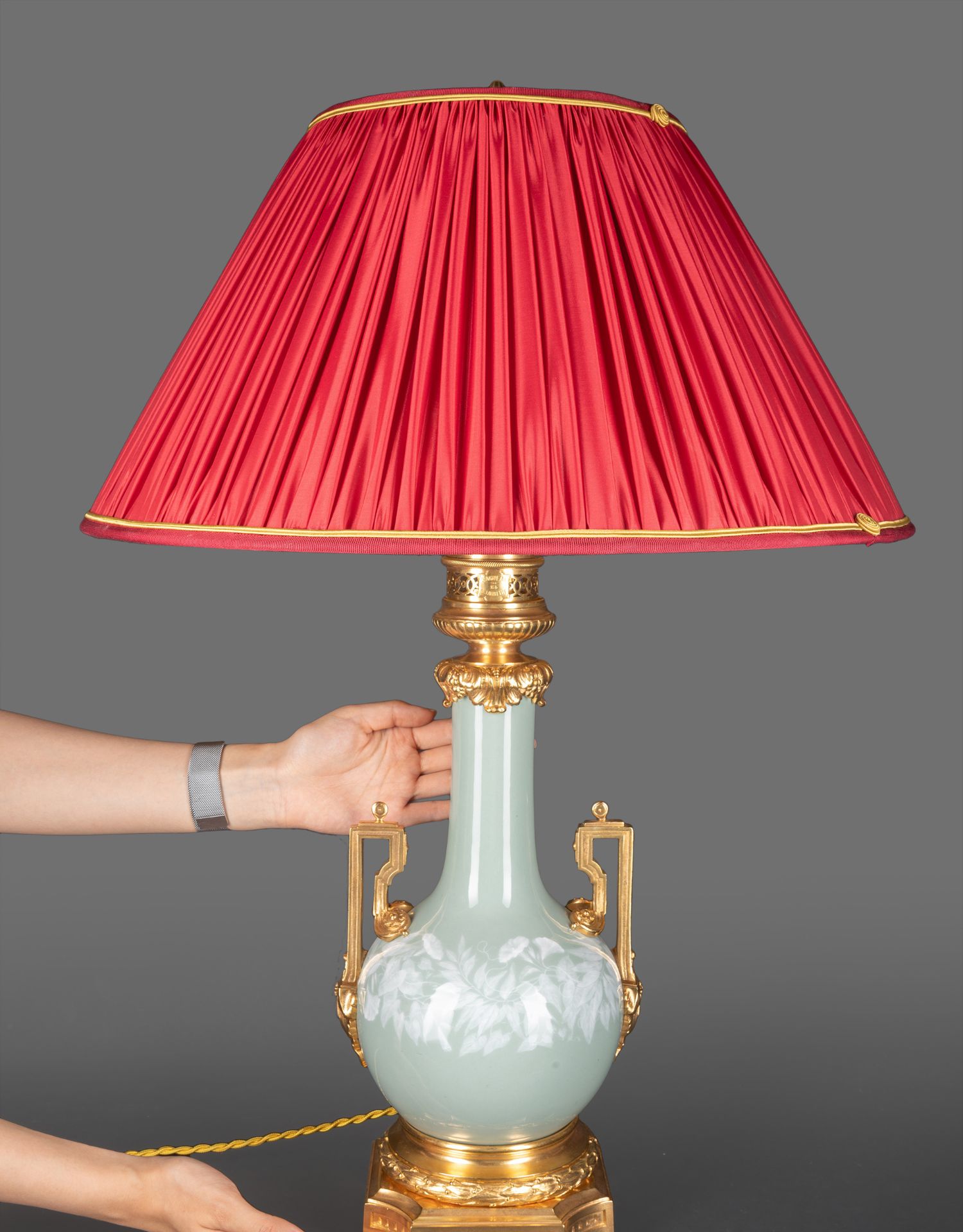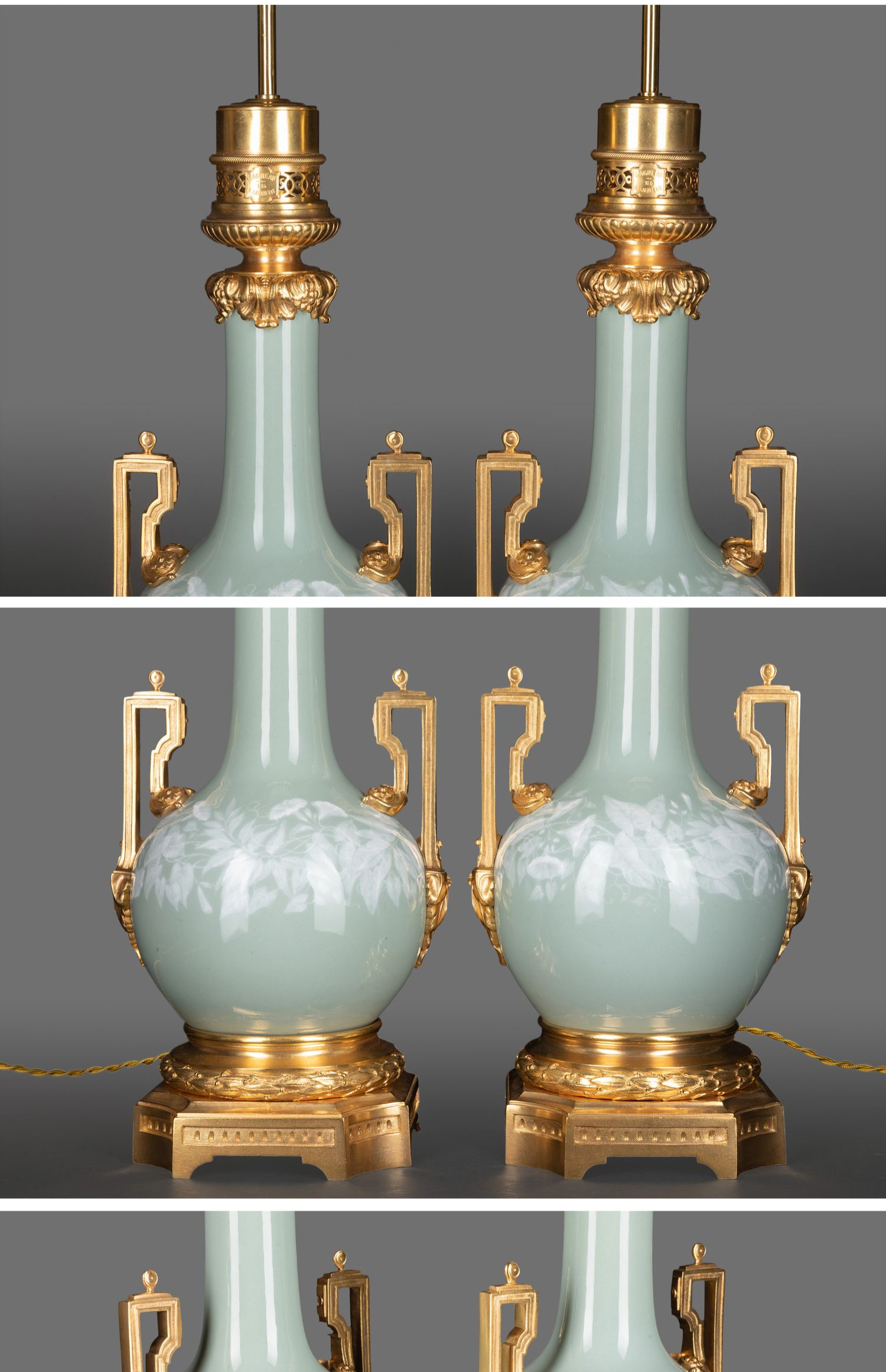 独角鹿西洋古董法国铜鎏金双耳雕饰豆青釉花卉浮雕瓷瓶台灯一对