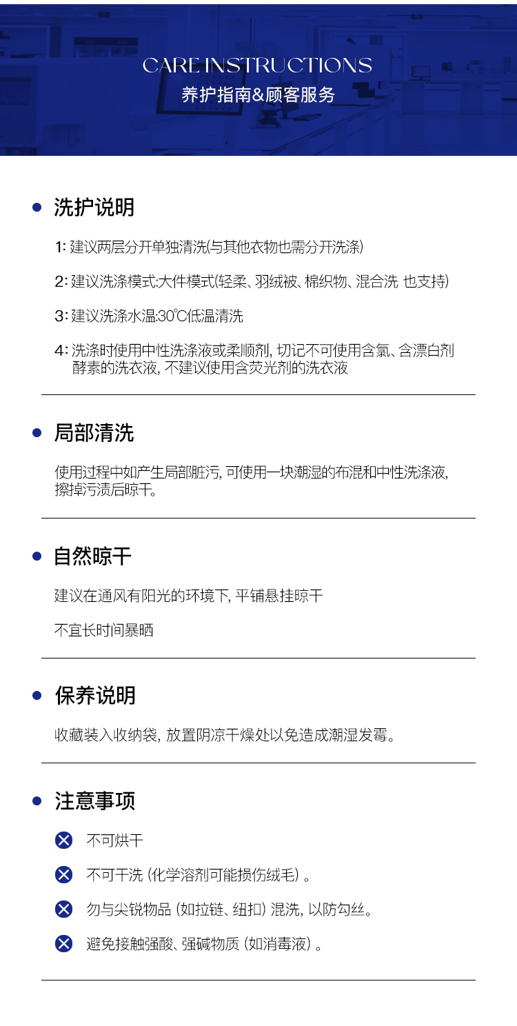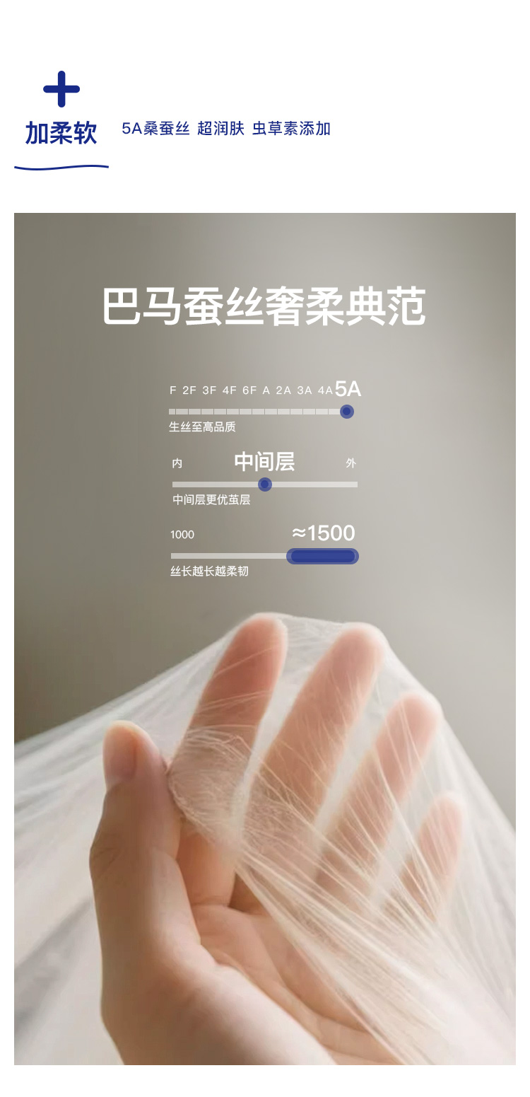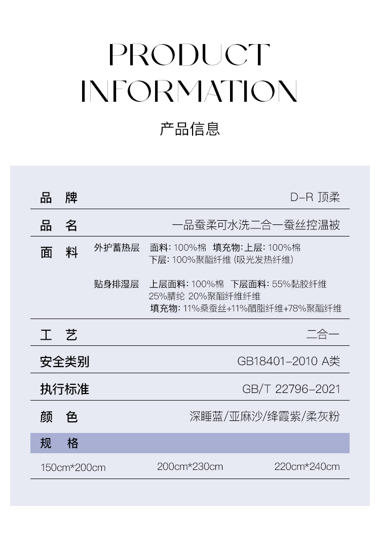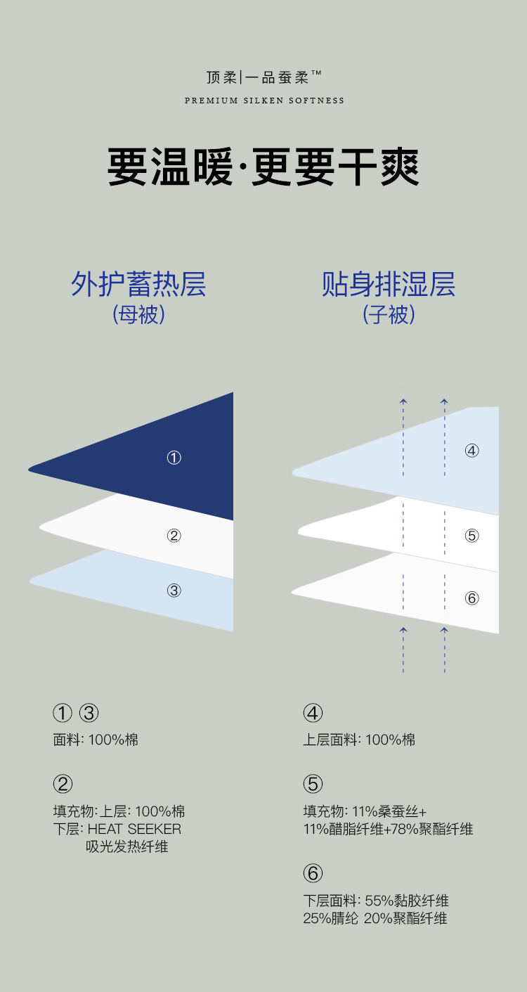 填充: 上层70%聚酯纤维+30%醋酸纤维;下层100%桑蚕丝