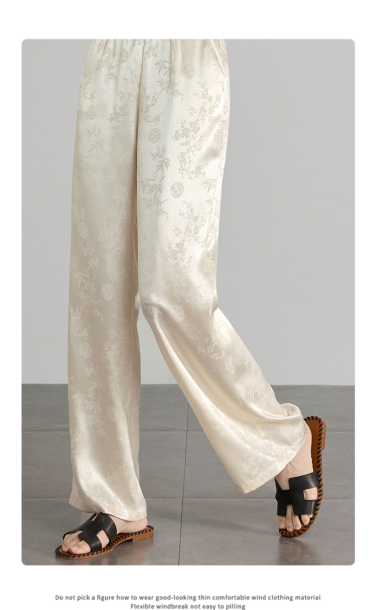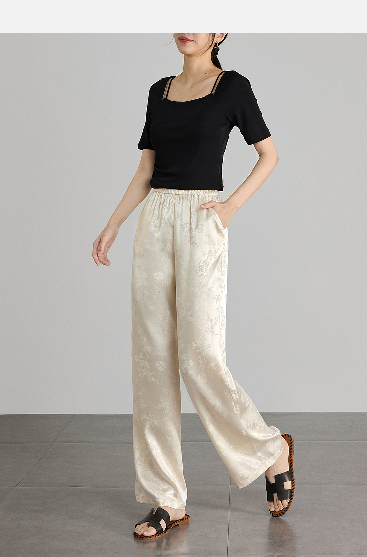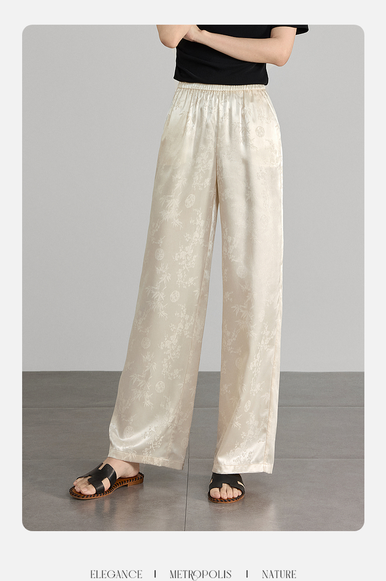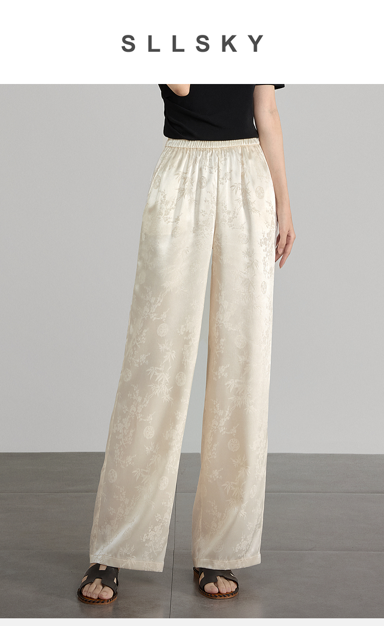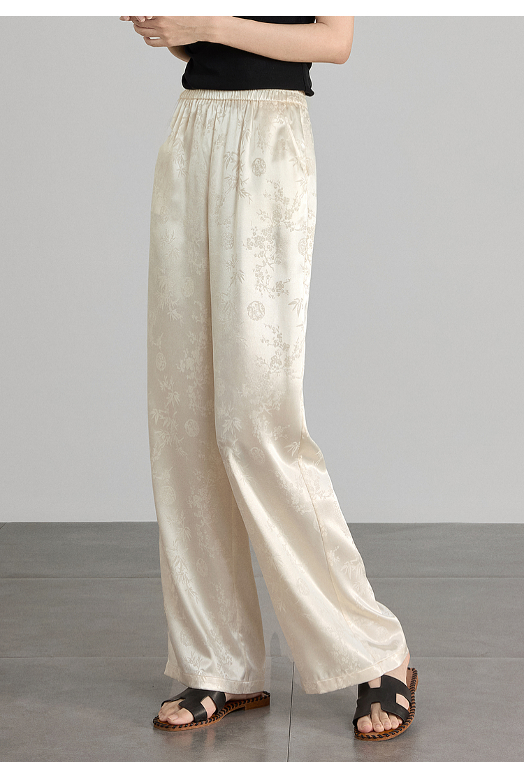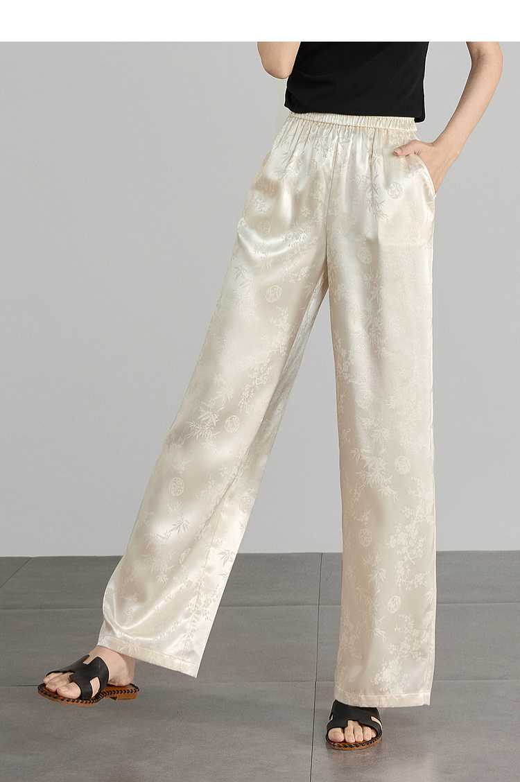 【专属特价】熙世界新中式国风提花阔腿裤夏薄款高腰宽松冰丝长裤缎面直筒裤