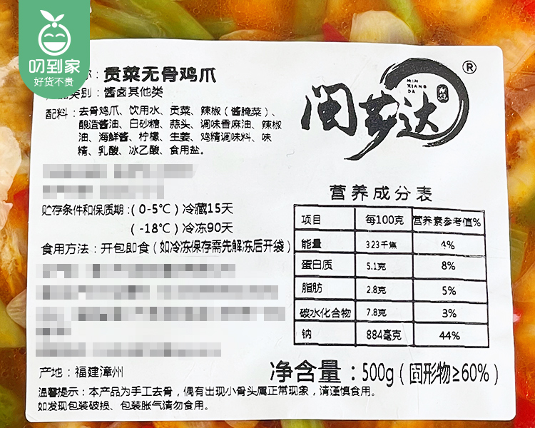 闽芗达贡菜无骨鸡爪(500g/包 固形物≥60%)生产日期:4月15日 保质期:冷藏15天