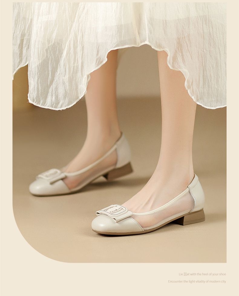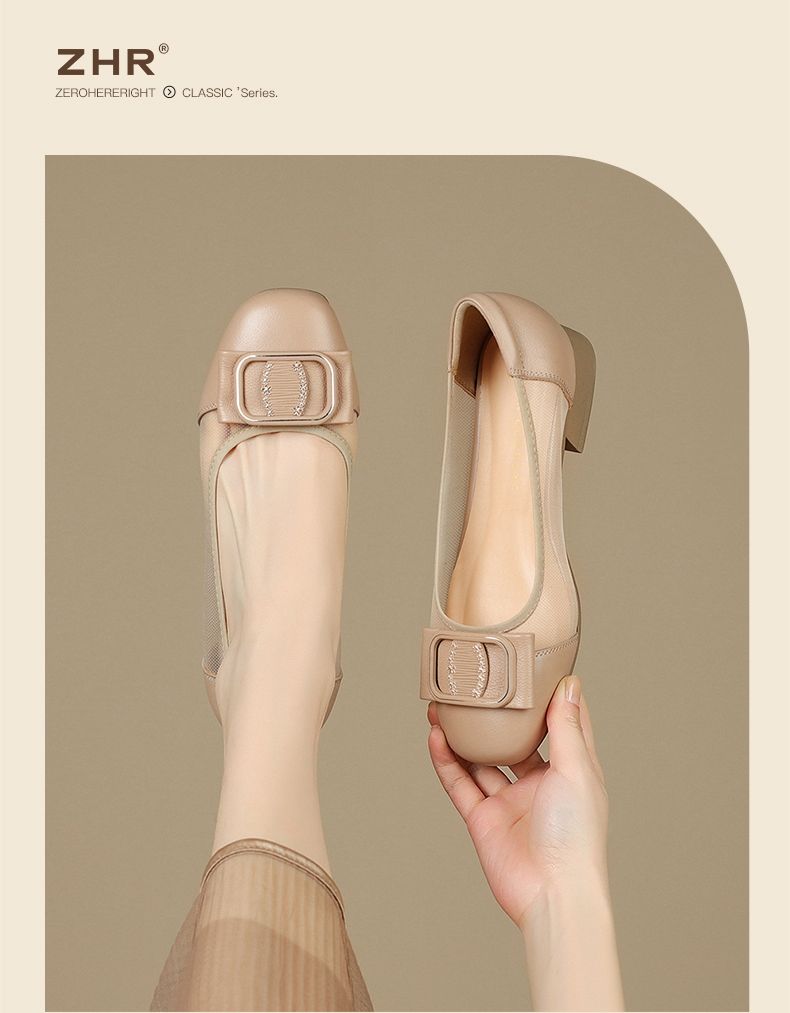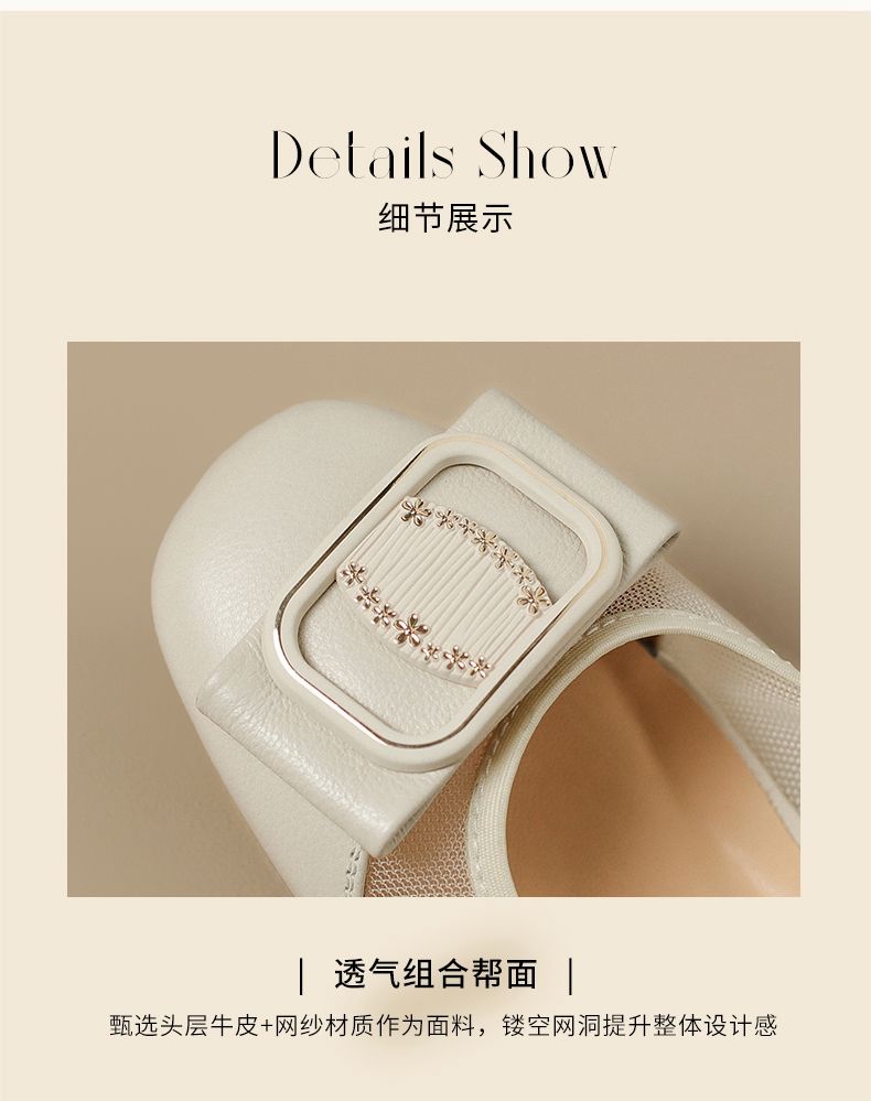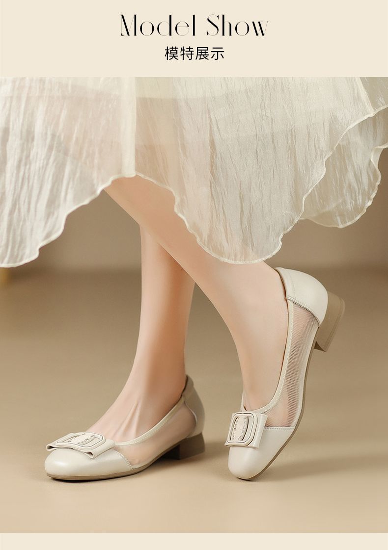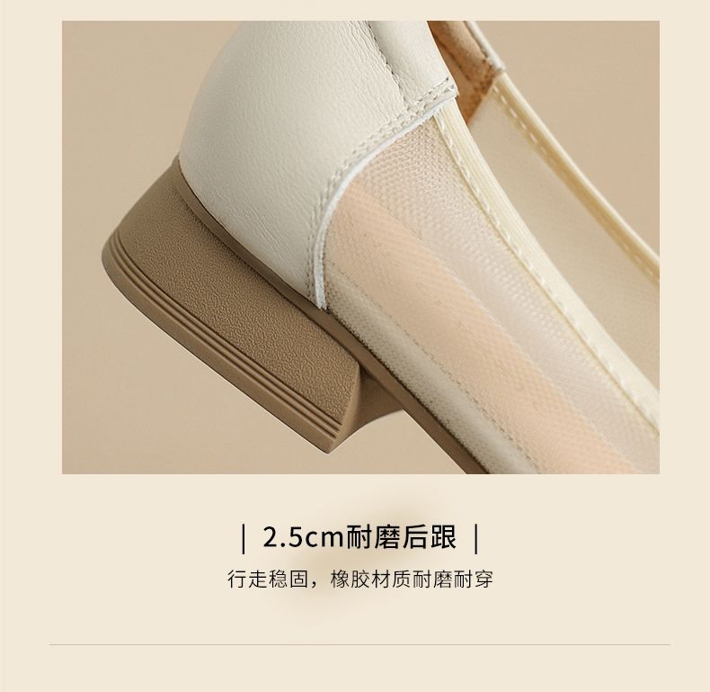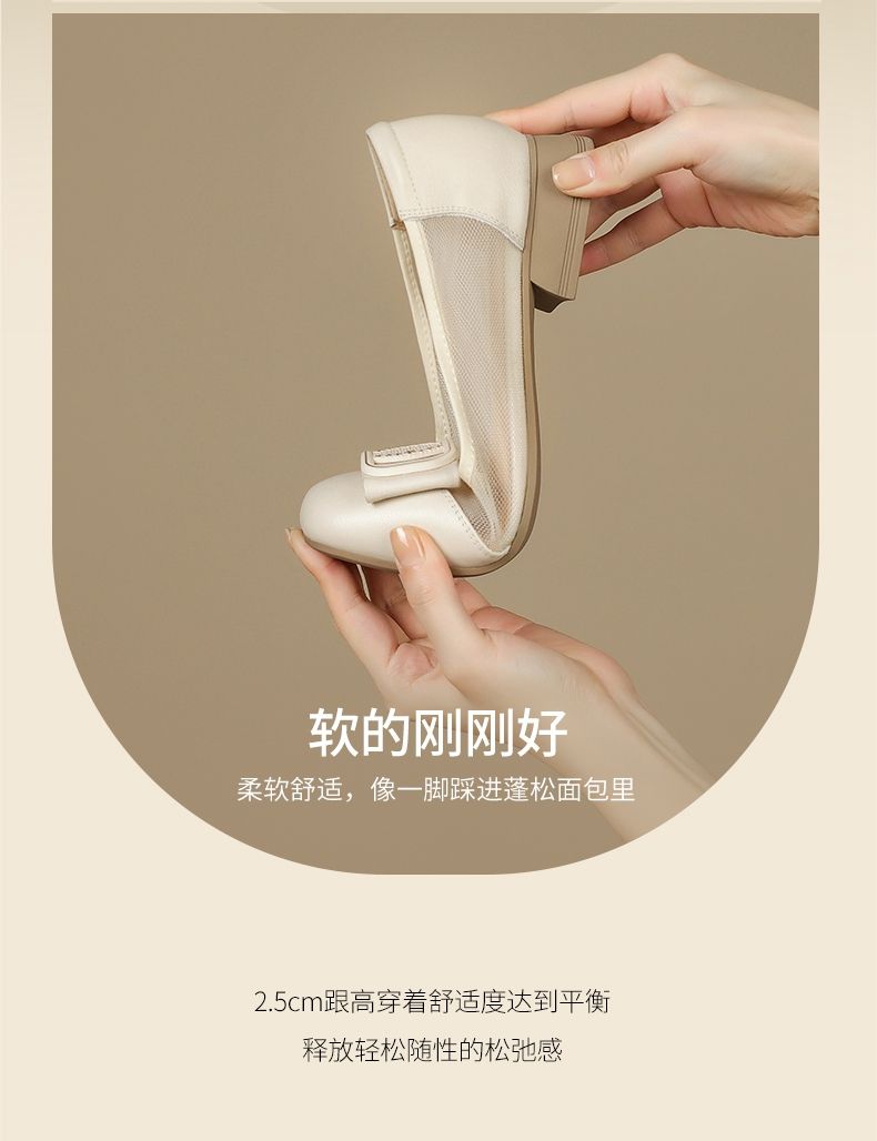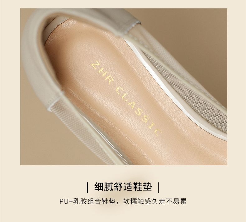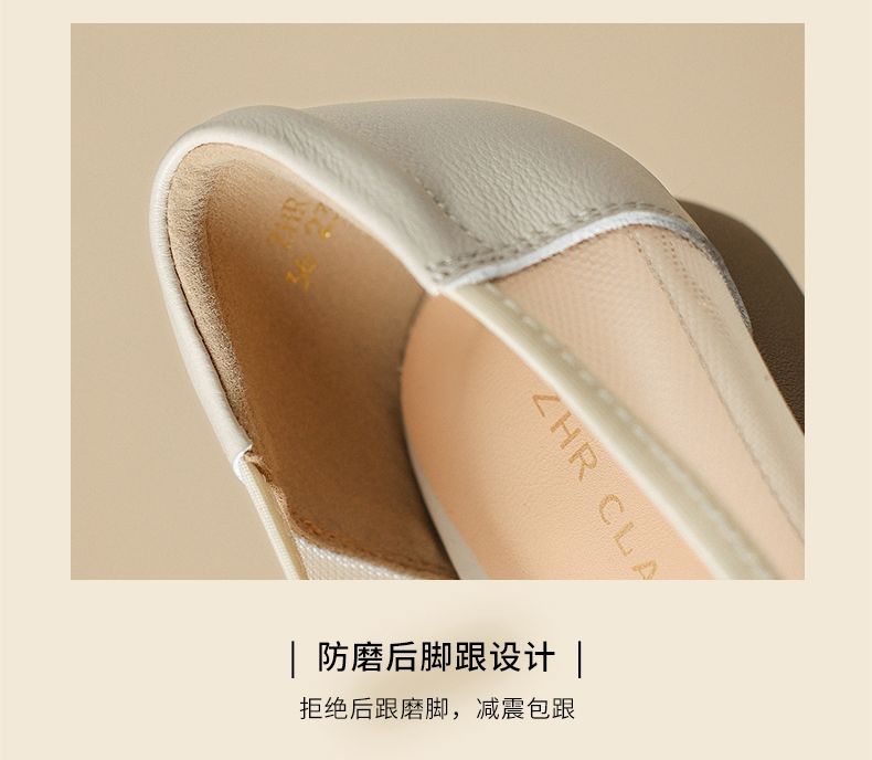 ZHR则则头层牛皮真皮透气网纱镂空浅口粗跟单鞋2025新款百搭女鞋