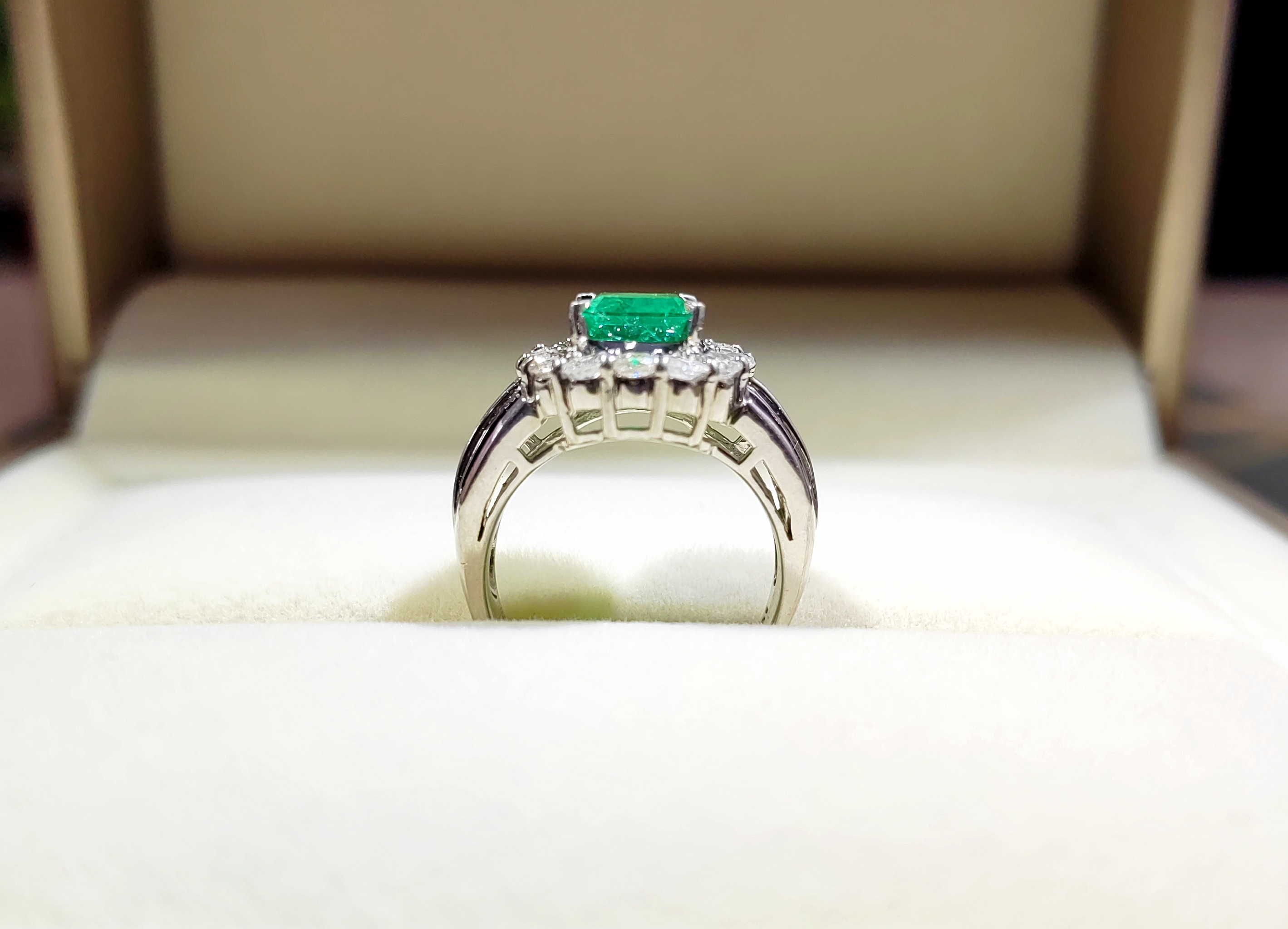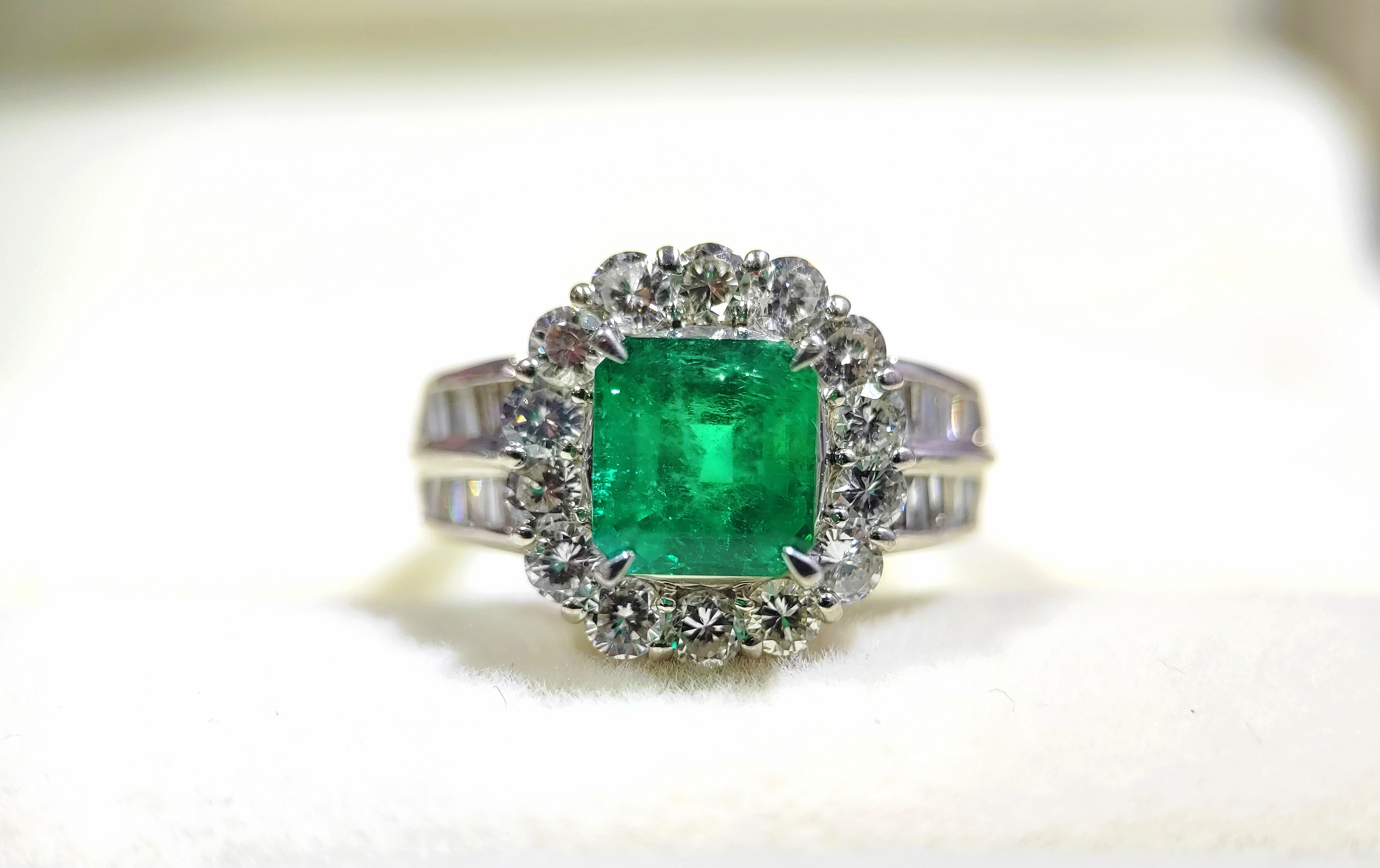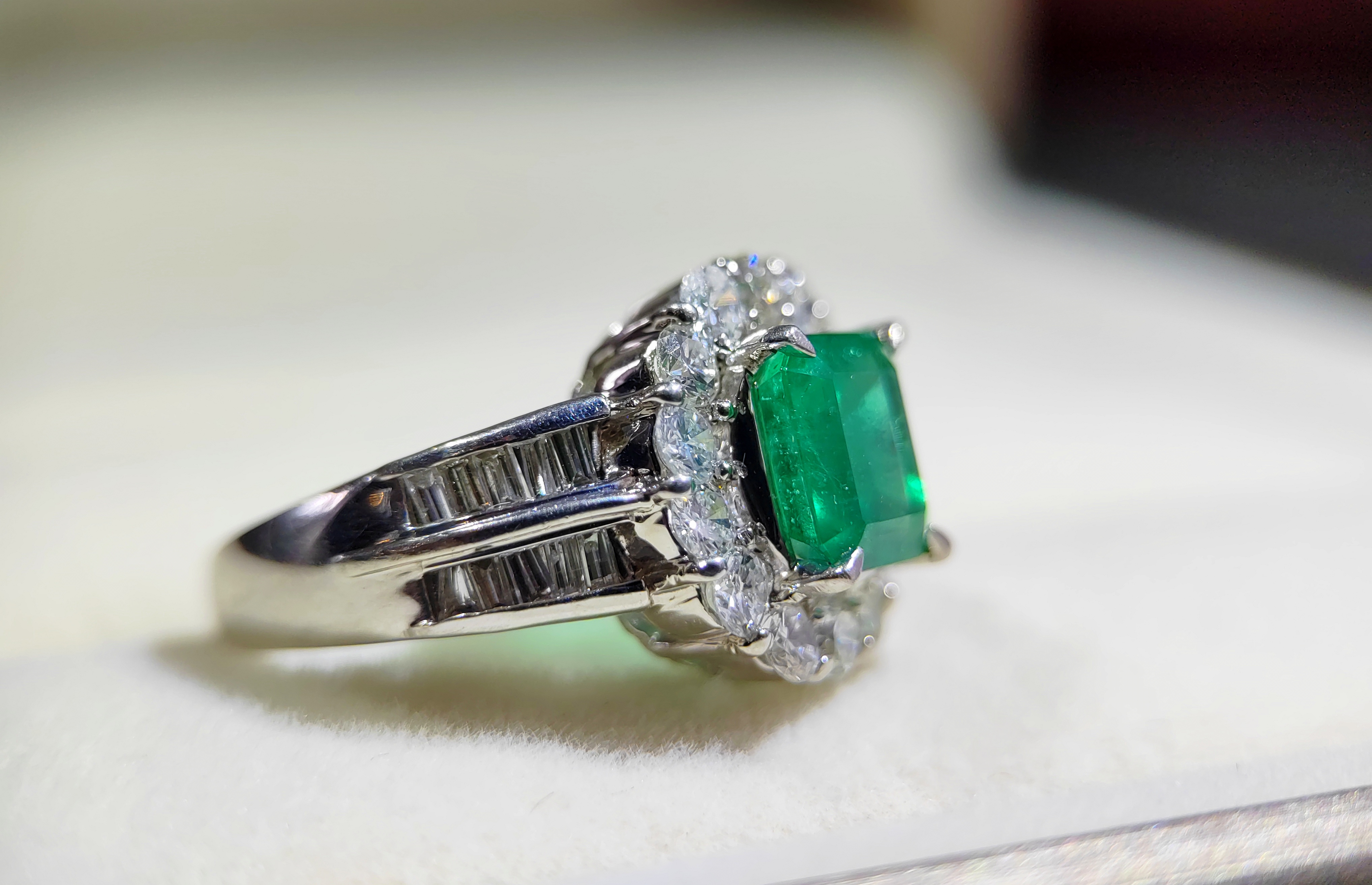 这枚祖母绿戒指,来自哥伦比亚产区,颜色达到顶vivid Green,饱和度极高。主石重量为2.01ct,配钻1.37ct,做到了真正的豪华镶嵌。
