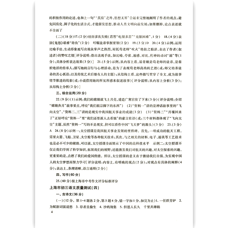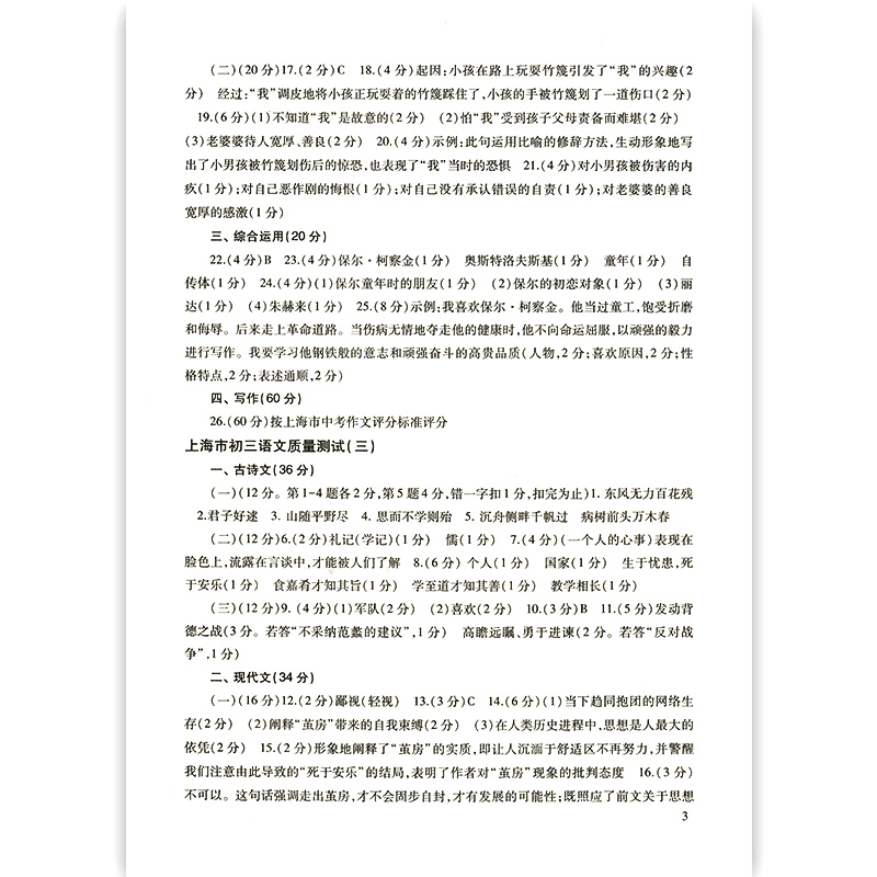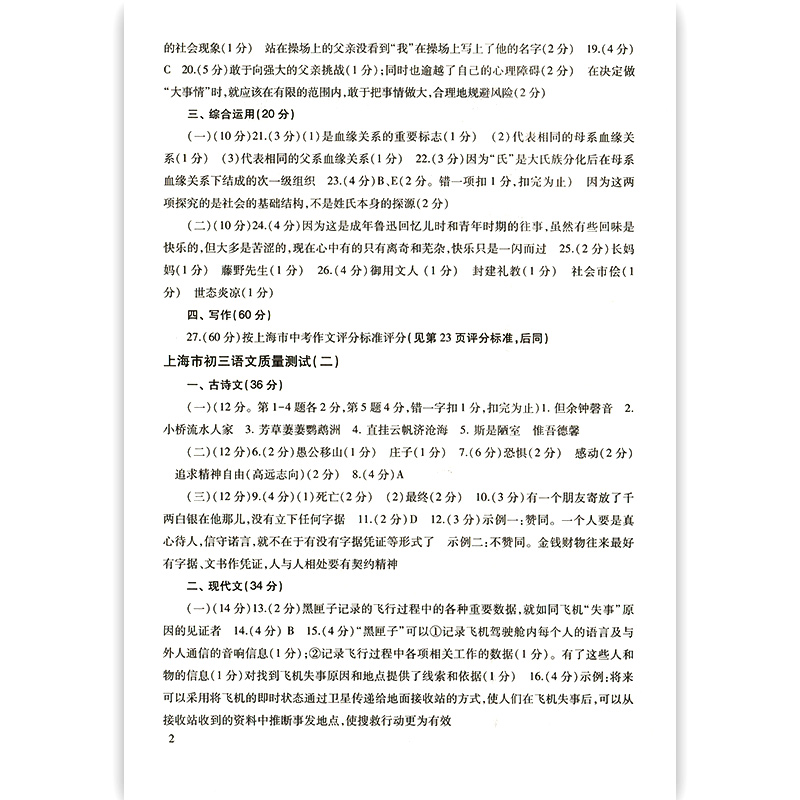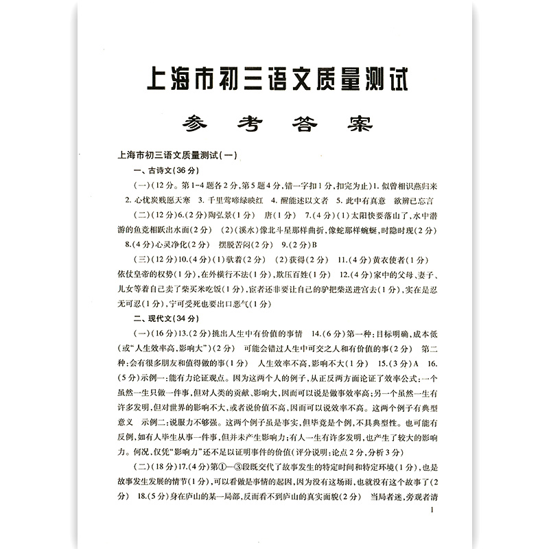2022届新版 上海市初三语文质量测试 参考答案 上海各区县摸底卷 光明日报出版社 2021上海中考语文一模卷答案 中学教辅