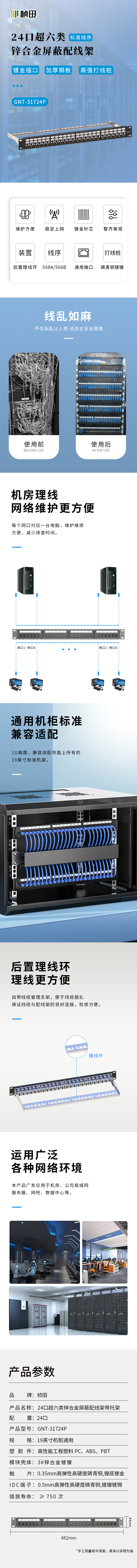 24口超六类锌合金屏蔽配线架带托架带模块31724P