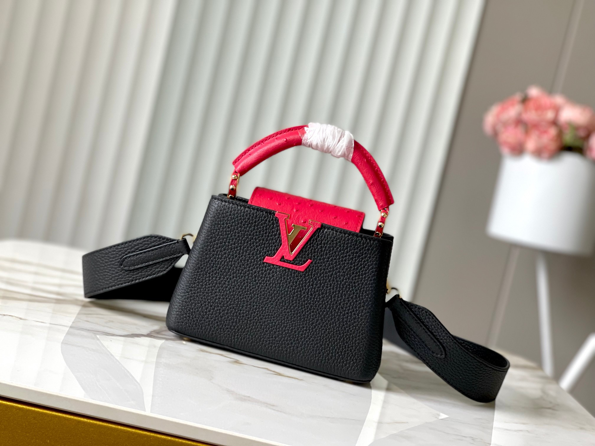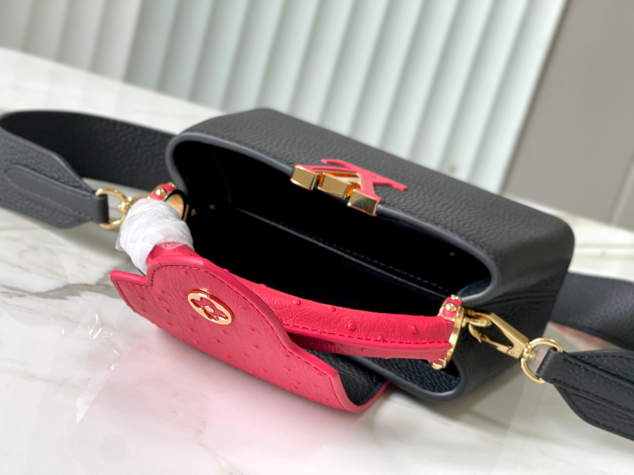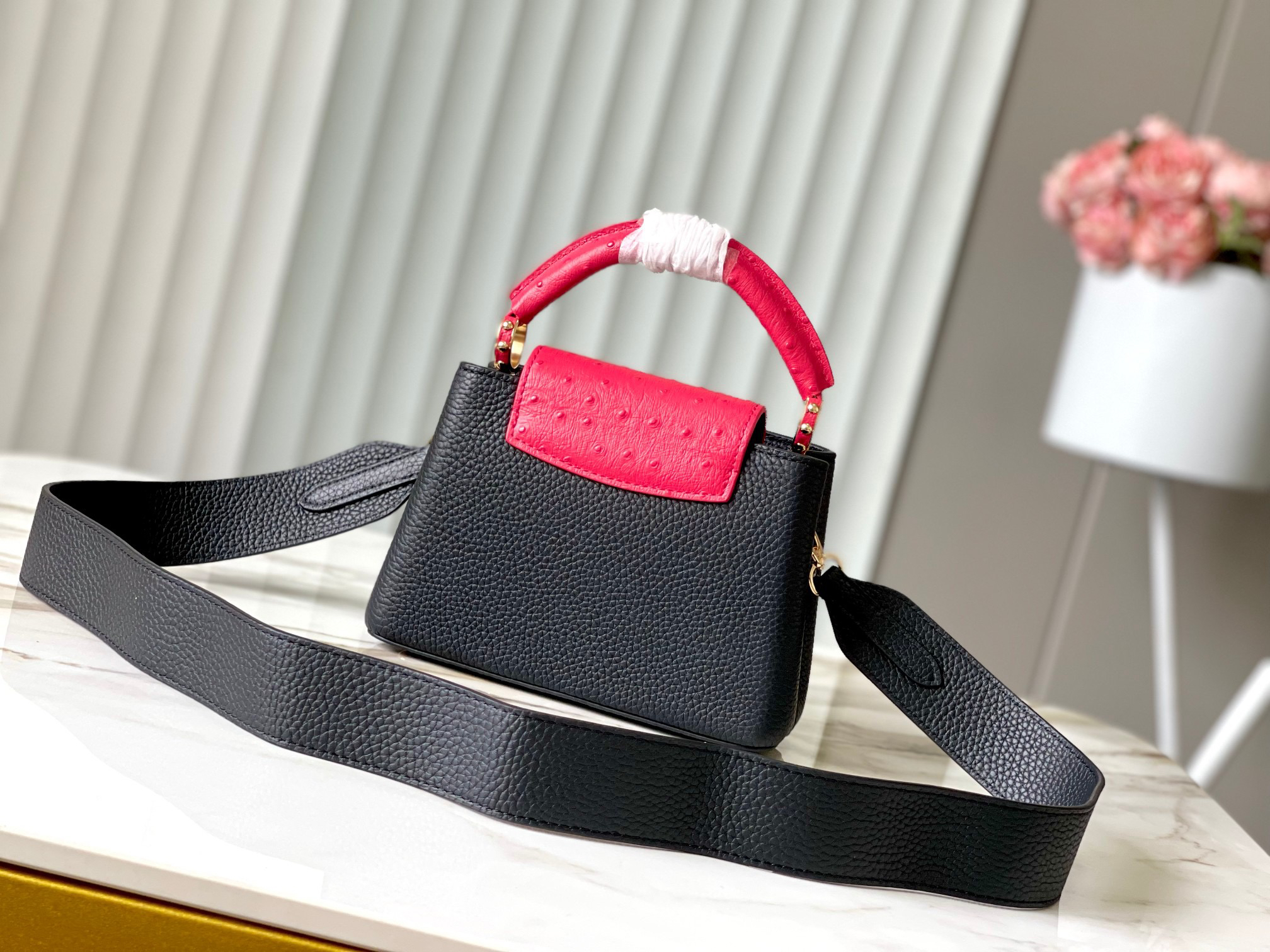 秋冬特惠💰1450 渠道级LV 新品 te级LV 全套包装 N82904/M48865黑拼红鸵鸟 本款 Capucines 手袋采用 Taurillon 皮革塑造玲珑构型 以鸵鸟皮革包裹翻盖、手柄和 LV 字母 翻盖可外置或内收以读取 LV 标识 可拆卸宽幅皮革肩带洋溢摩登风尚 Size:21 * 14 * 8 cm