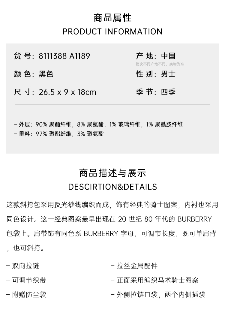 BURBERRY 巴宝莉 男士马术骑士印章奥克尼单肩包 黑色 8111388 A1189