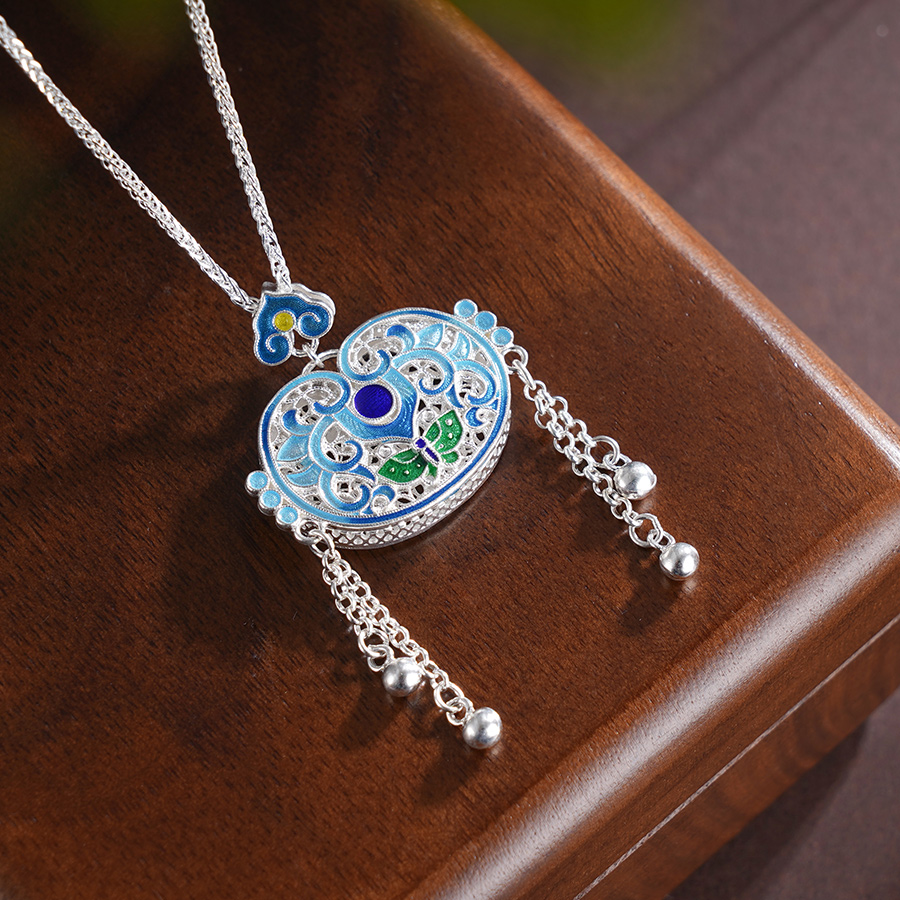 子佩集S990银【福气叠加】套链【QFTL013】纯银花丝珐琅彩蝴蝶流苏项链2505