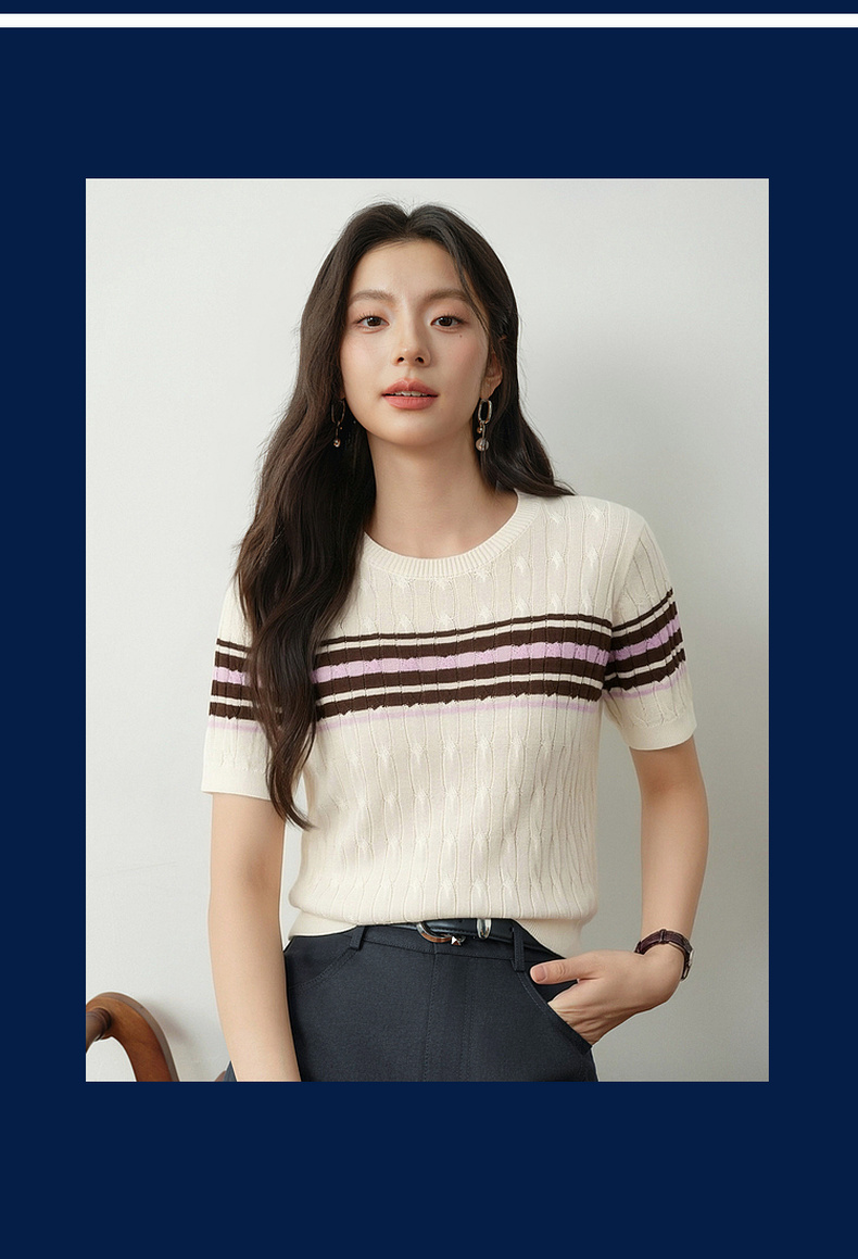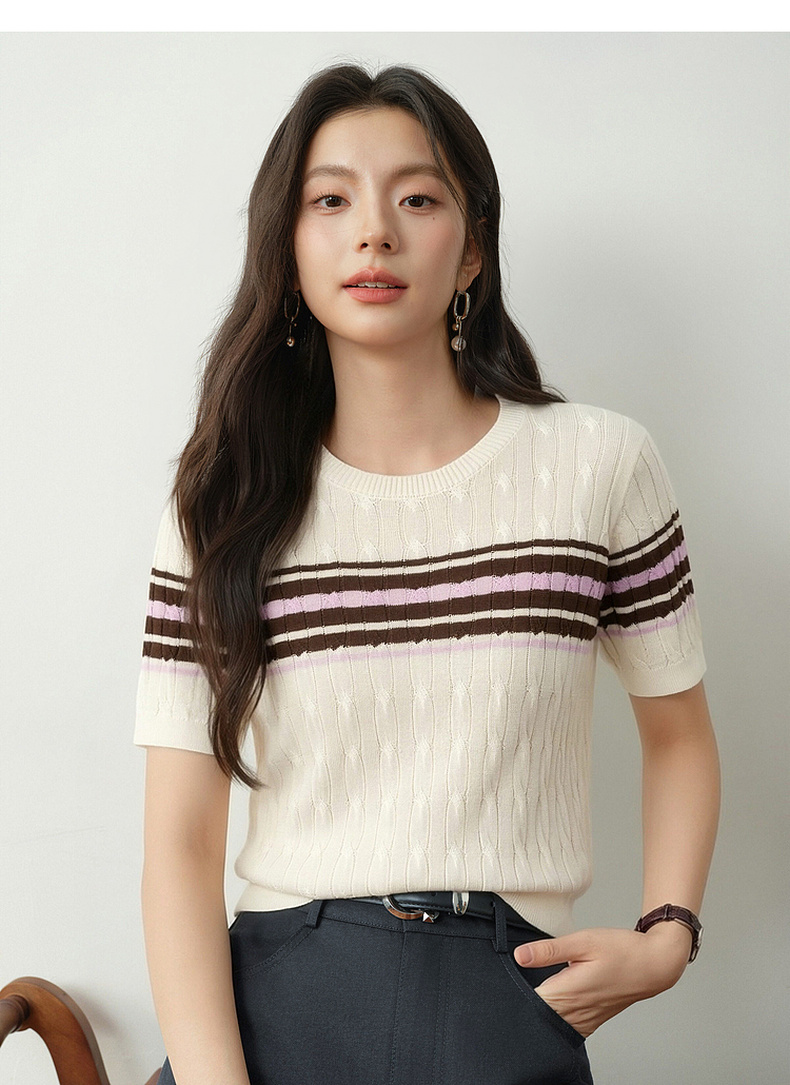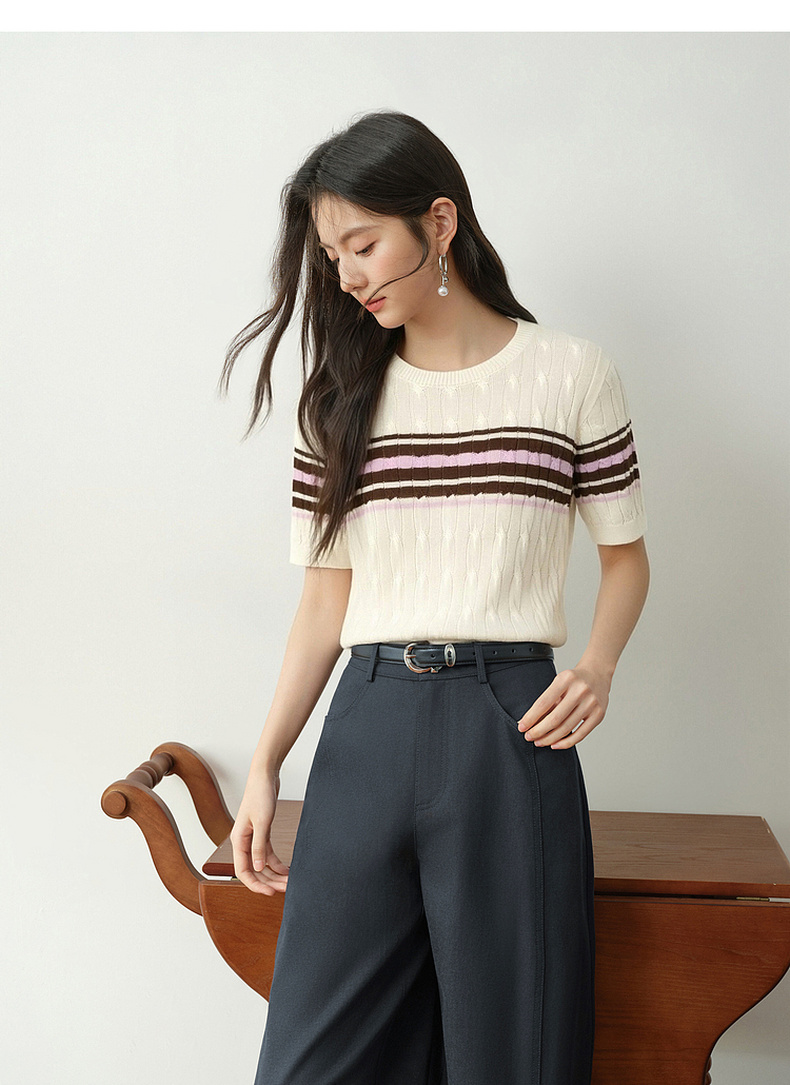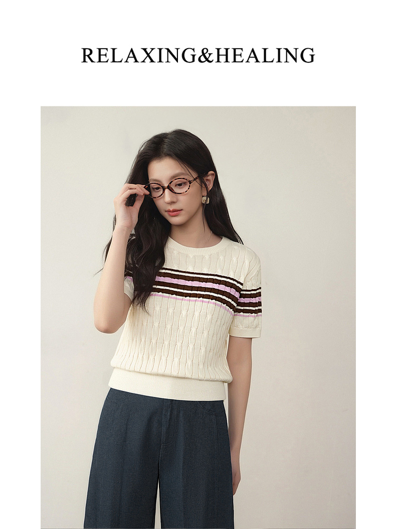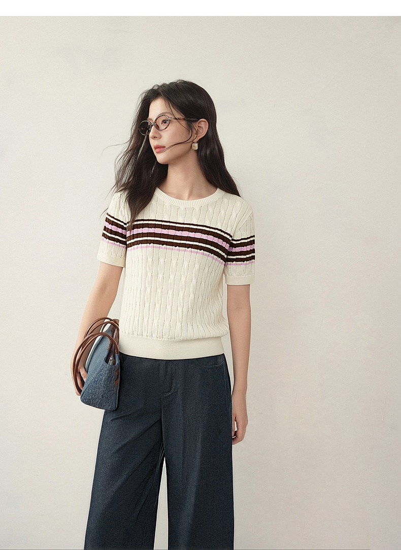 【严选】诗凡黎撞色条纹绞花针织衫2026春夏新款设计感软糯亲肤短袖上衣女7H2230471