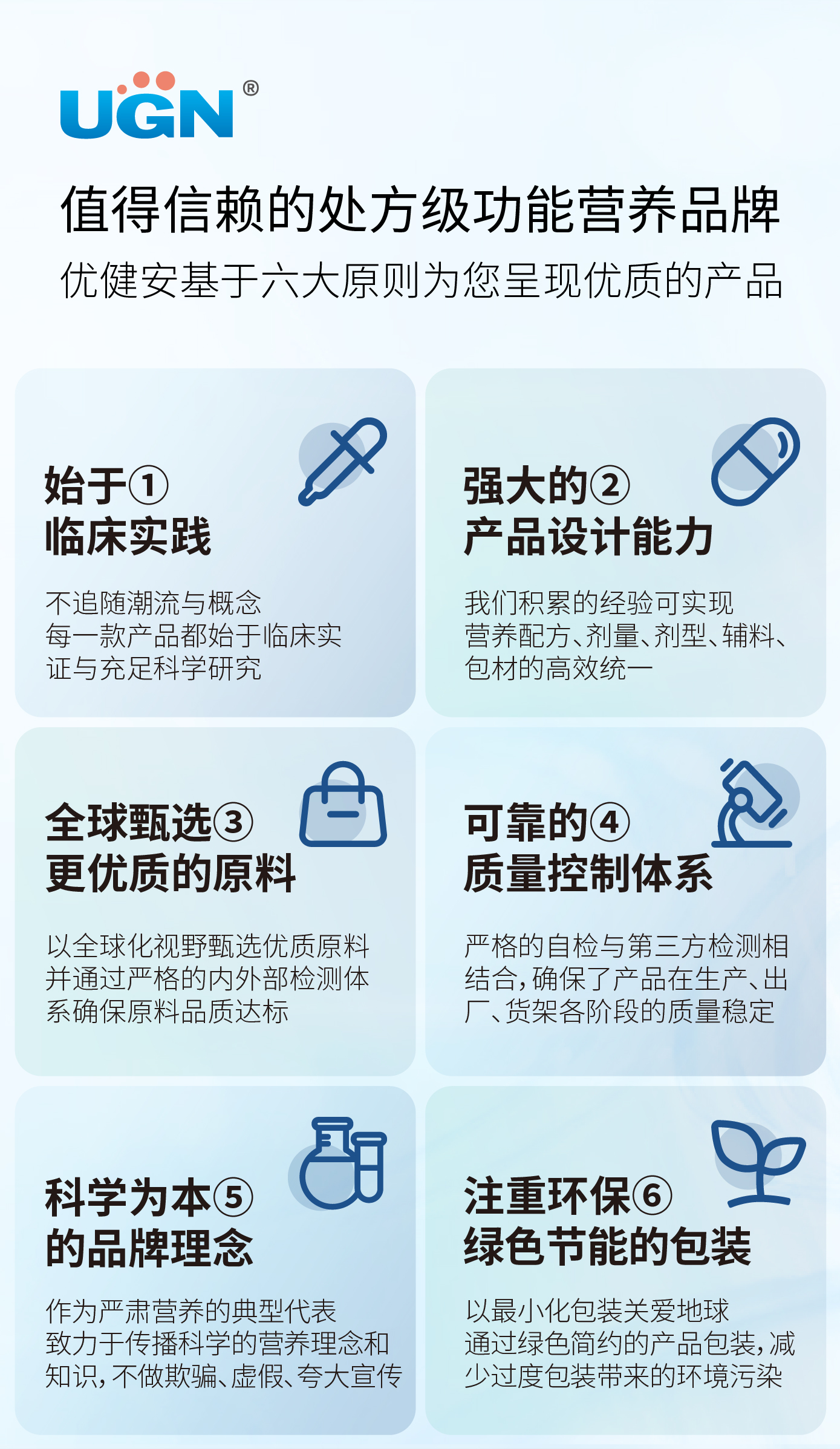 *UGN产品符合FDA和美国联邦贸易委员会关于营养补充剂产品相关疾病声明的监管要求,产品不用于预防、诊断和治疗任何疾病。如患有任何疾病,请咨询专业人员。
