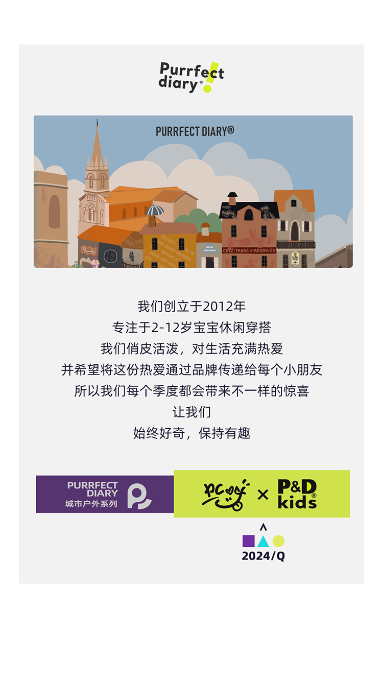 - Purrfect-Diary专注于贴近自然随性的穿着概念,轻奢平价的童装文化传播,在产品设计上更加注重婴童穿着的舒适性、安全性、更出众的国际化品牌,将欧美的育婴文化在中国进行深入的传播与推广。