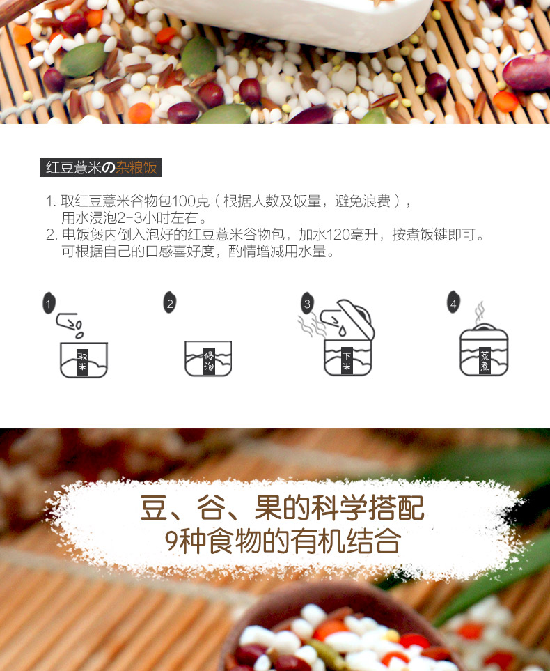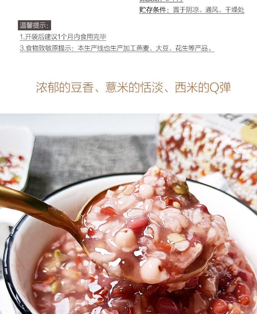 【存放方法】:五谷类不建议放在冰箱里保存,冰箱密闭空间、湿度也大。开袋后一个月内尽快吃完哦~