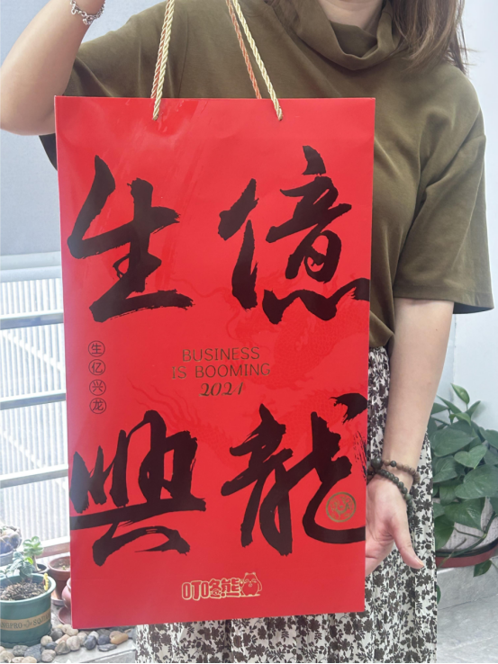 有颜,叮咚熊这套龙凤蛋卷礼盒“大”到让人眼前一亮!! 与常见的流水线礼盒不同 龙凤蛋卷礼盒足足高达有55公分✅(高度可参照20寸的行李箱) 在千姿百态的礼盒里拥有这样的“身高”是很独特的存在,鹤立鸡群,很是扎眼~ 妥妥的就是一名“长腿欧巴”、“行走的祝福”呀~ 一整套红红火火直接将节日氛围感拉了 叮咚熊独创字体以国粹文化书写年味 正反双面烫金书法设计✅ A面【龍转“钱”坤】,B面【生“億”興龍】 笔走龙蛇,铁划银钩,朴实无华而兼纳乾坤 挥毫泼墨带来的气势无需过多修饰,去繁化简 这个视觉冲击真的是爱了爱了~ 办公室的小姐妹直接搂怀里嗷嗷幸福感爆棚💕💕!